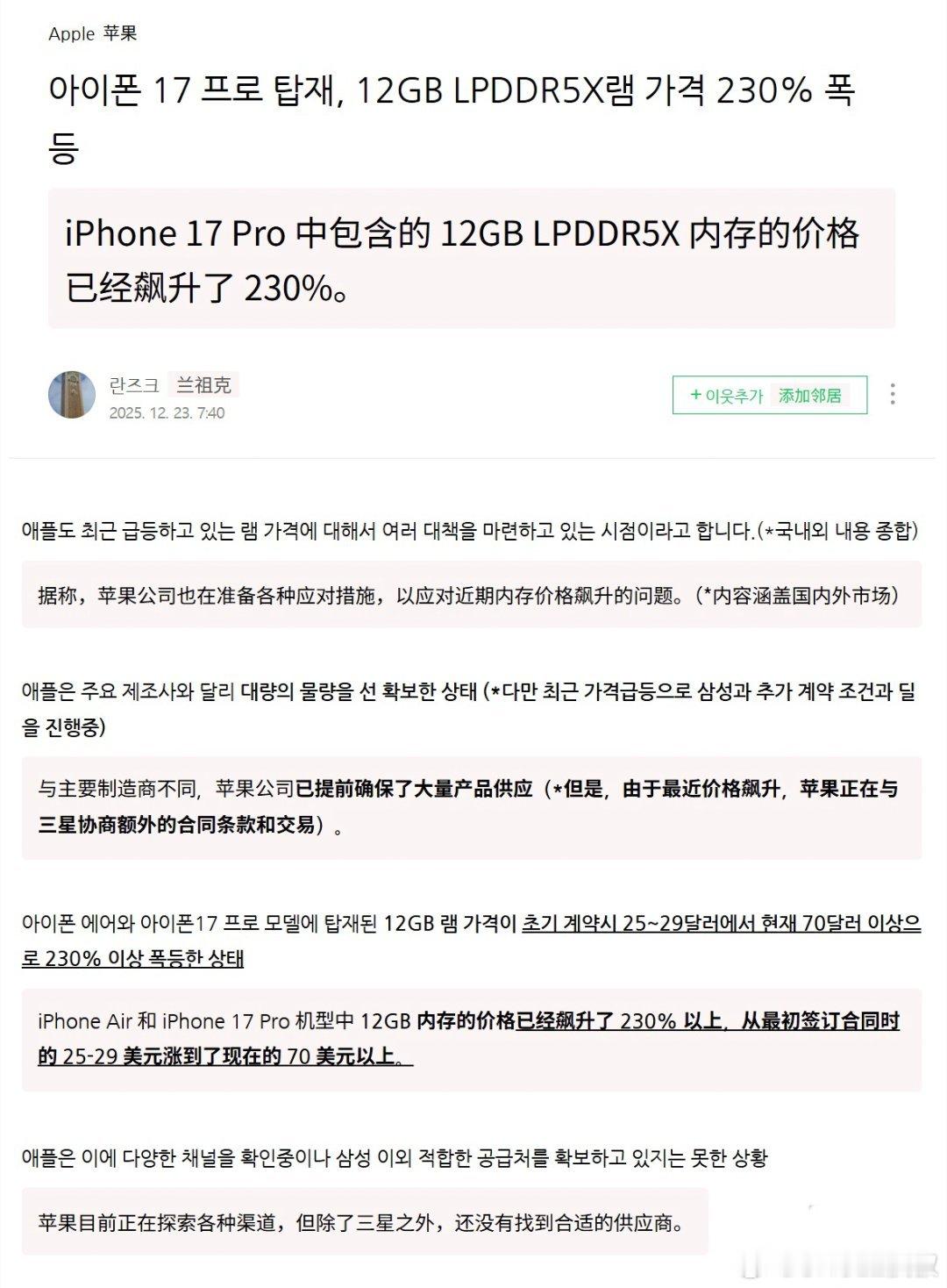 外媒:用于 iPhone 17 Pro 系列的 12GB LPDDR5X 内存芯片价格已从 2025 年初的 25-29 美元暴涨至 70 美元以上,溢价幅度高达 230%.看这一波果子能不能扛住压力了,按照以往经验,目前的利润率依旧相当可观。安卓一些主打性价比的机型才是重灾区,只要苹果认为利润率够,完全有可能不会涨价…
