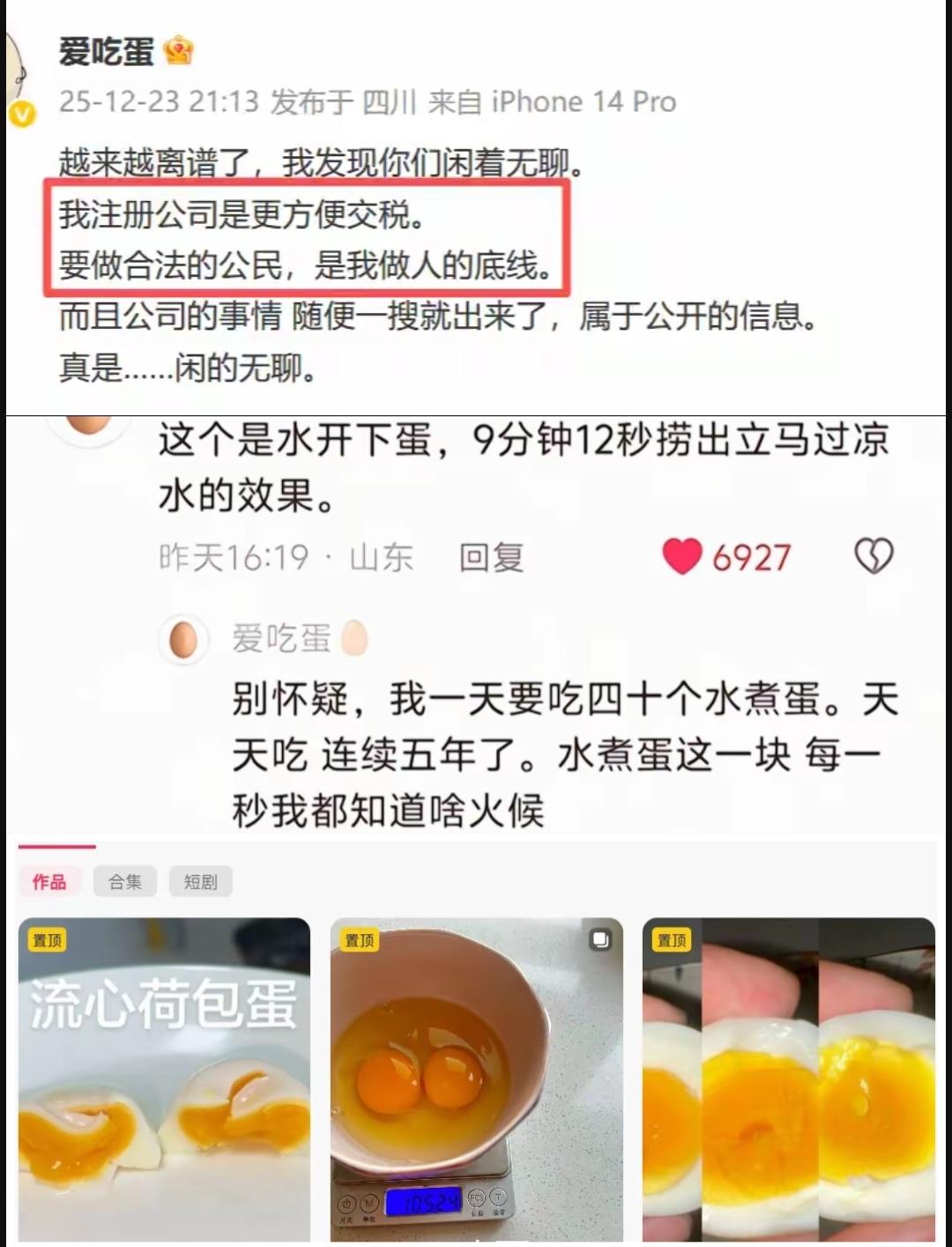蛋神流量套现的吃相,比40个鸡蛋更噎人!蛋神为什么能火?就是踩中了网友的情绪点,一个普通人,五年如一日研究怎么煮蛋,这种认真生活的态度,在满是剧本和摆拍的短视频里,显得格外稀缺。大家愿意为这份“纯粹”买单,愿意相信这是一个普通人的坚持,可结果呢?粉丝刚破400万,公司就火速注册,经营范围精准瞄准直播带货和互联网销售。 面对质疑,蛋神张口就来,开公司是为了方便交税,这话骗谁呢,稍微懂点财税知识的人都知道,个人带货和公司带货的税率差,就是他急着注册公司的核心原因。 一天40个鸡蛋坚持五年的离谱说法,在流量至上的逻辑里,“离谱”从来不是缺点,而是卖点。只要能制造话题、吸引眼球,哪怕是编出来的坚持,也能被包装成匠心。但这种靠谎言吸引的热度,注定是空中楼阁。当网友发现自己追捧的生活家,其实是个只想套现的商人时,反噬来得比涨粉还快。 说到底,蛋神的翻车,是流量时代的必然结局。短视频平台从来不缺一夜爆红的网红,缺的是能把热爱做成事业的长期主义者。如果所有网红都把走红当成套现的跳板,把人设当成割韭菜的工具,那以后再出现什么“坚持XX年”的博主,网友只会先问一句:什么时候开公司?