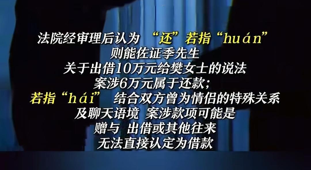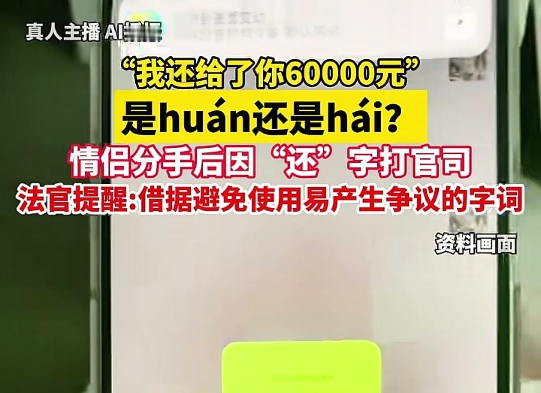 好稀奇!情侣分手后因为一个字打官司?“还”是多音字,但意思完全不同。还( hai )给你6万,那一共是12万。 还( huan )给你6万,那就是借的6万已给了。 看来以后写多音字要把拼音字母写上,或者避免用多音字,免得扯皮。