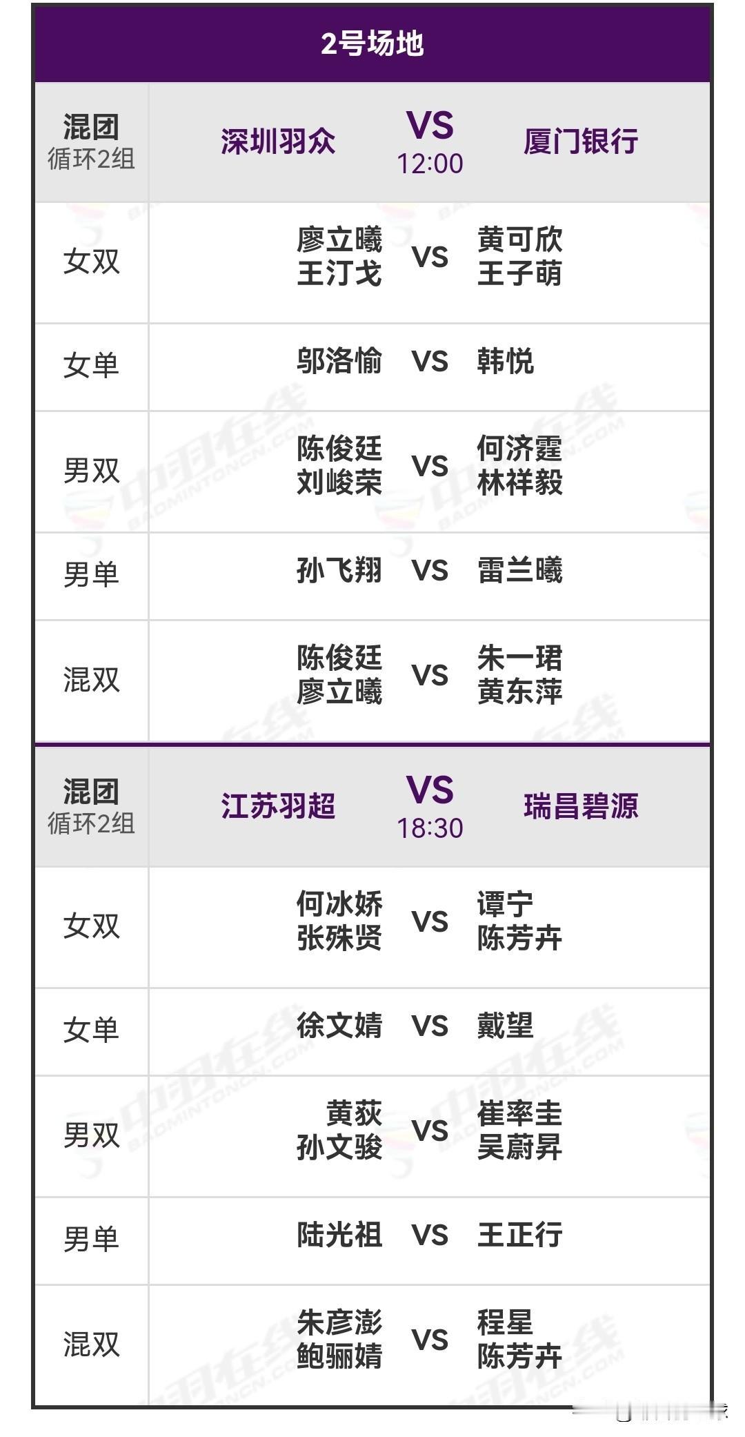 12月25日中国羽毛球俱乐部超级联赛赛程安排 明日,2025 - 2026中国羽毛球俱乐部超级联赛混团循环赛安徽芜湖站将拉开战幕。比赛于芜湖航空新城体育中心举办,设有两块场地同时进行赛事。 白天场于12:00开启,对阵双方分别为辽宁极兔与青岛仁洲,以及深圳羽众与厦门银行。晚场则在18:30打响,对阵队伍是芜湖兴航与浙江竞体,以及江苏羽超与瑞昌碧源。届时,翁泓阳、陆光祖、雷兰曦、酱板鸭组合、陈雨菲、徐承宰、等大牌球员将悉数登场。详细对阵名单如下: 羽球赛程 羽毛球 羽毛球爱好者 羽毛球赛事 羽毛球比赛 陈雨菲