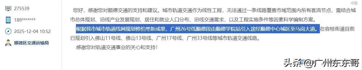 容桂人的地铁梦恐怕要泡汤了! 近日,有网友强烈建议“广州地铁26线顺德段走容桂中心城区”,并列出了6大理由,看来真的是很渴望一条地铁线路。 不过,随后官方的回复是,26号线佛山段,维持原定线路。也就是说还是按照之前环评公示的终点站顺德马岗大道。 这次要让容桂街坊彻底失望了,没有抱住26号线这条大腿,所谓其他规划地铁线路还不知道是猴年马月的事情。 不过,广州地铁四期规划本身也存在极大的不确定性,就算线路能入选,走向、站点设置可能都会面临调整。 所以顺德街坊也不必急于庆祝,在当前环境下,广州地铁四期只要一天未官宣,什么事都有可能发生!