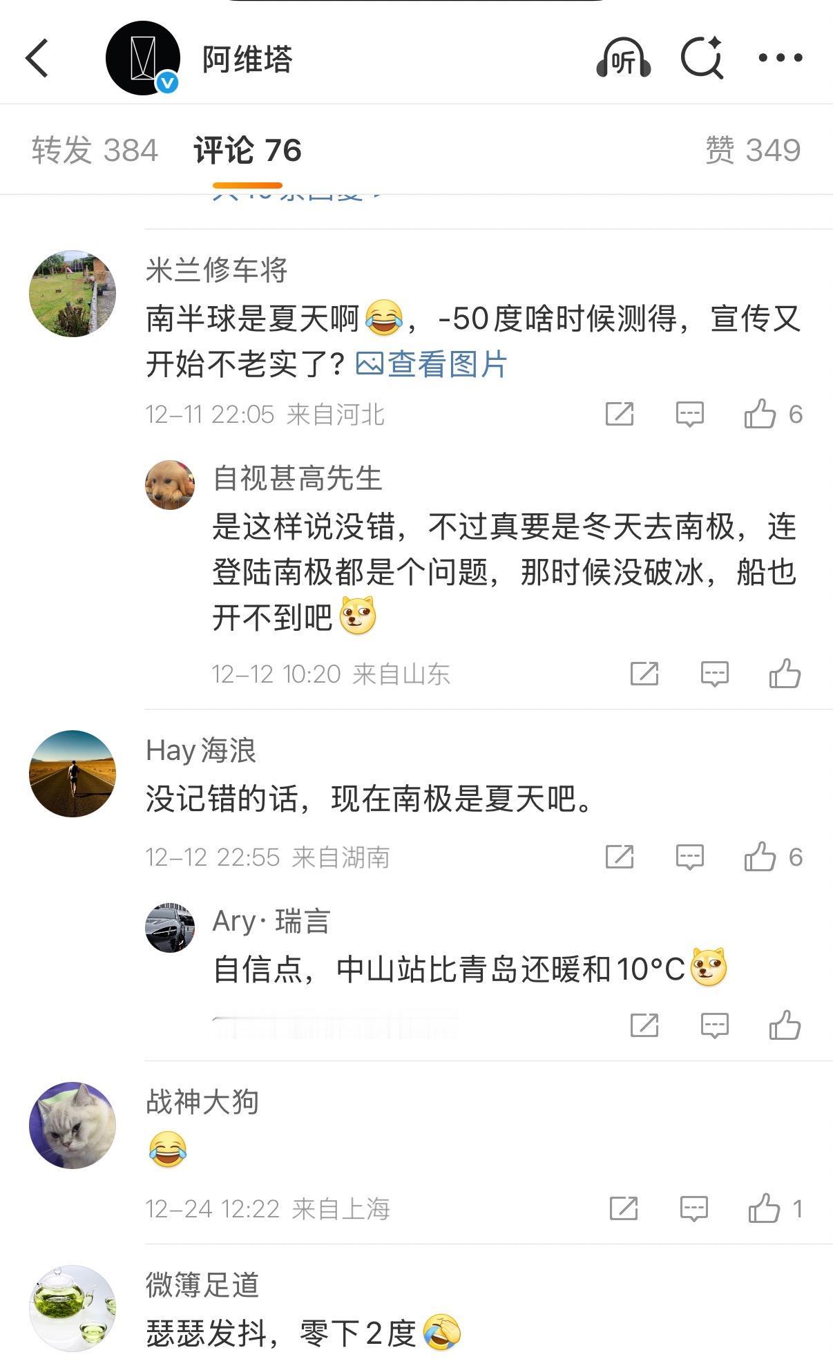 阿维塔12南极“极寒测试”引热议,网友喊话:不如来漠河! 近日,阿维塔官方微博发布消息称,旗下车型阿维塔12已抵达南极中山站,完成-50℃极寒环境测试,并配图展示车辆在冰雪背景下的照片。 该宣传内容引发网友关注与讨论。部分网友在评论区指出,当前南半球正值夏季,南极中山站实际气温并不符合“-50℃极寒”的描述,甚至有网友调侃“建议去漠河测试”。此外,有评论提到同期北京气温可能低于南极部分地区,对宣传中的低温表述提出疑问。 截至12月24日19时,该条微博仍存在于阿维塔官方微博账号中,尚未删除。阿维塔方面暂未对网友的质疑作出公开回应。