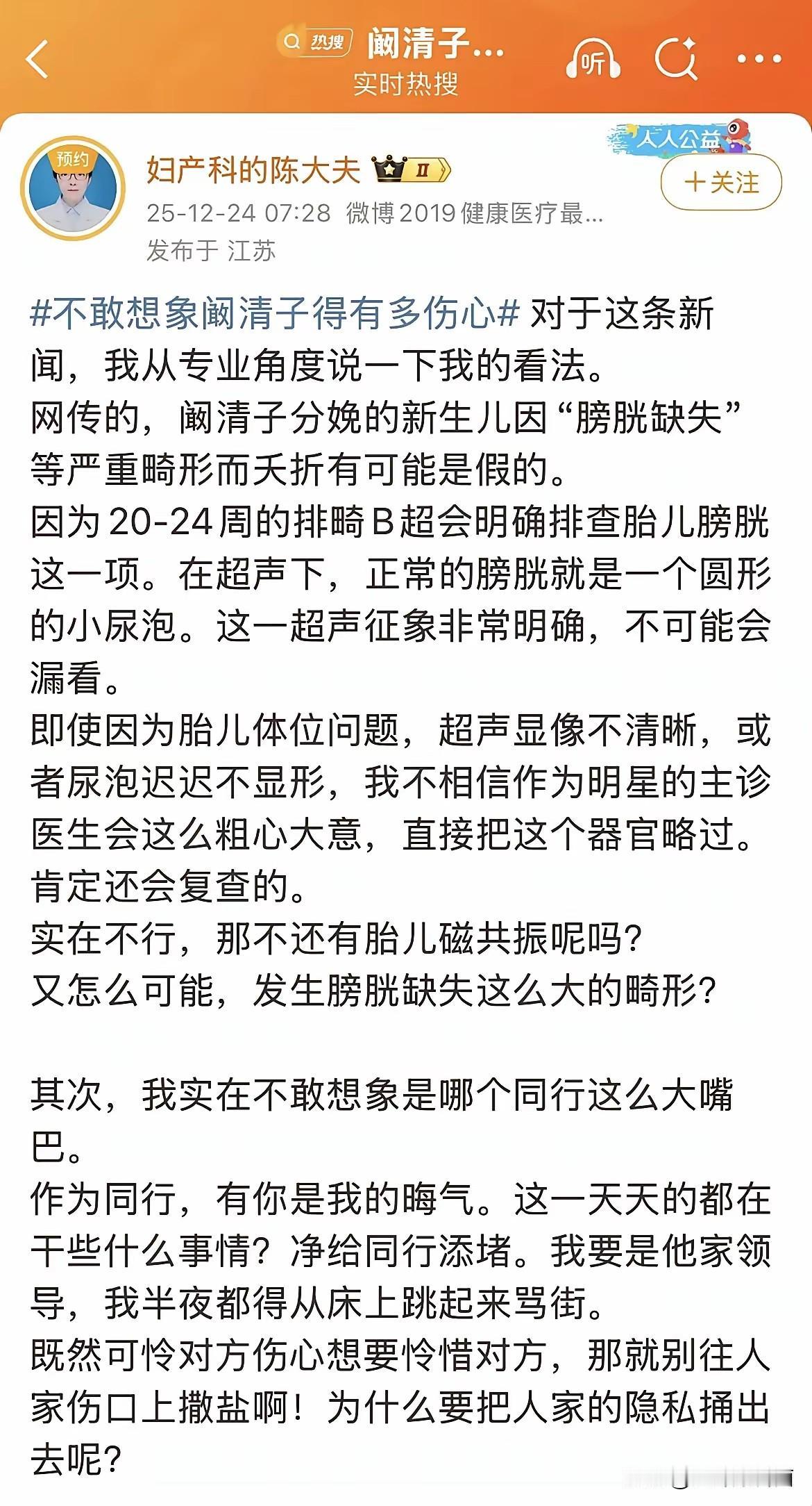 关于阚清子近日的热搜事件,愈演愈烈,真不敢相信网络上的传言。 这位陈大夫说得对,普通人尚且都会经历大排畸和小排畸这样的产检经过,明星的孕产标准肯定更加的周密,不可能存在网络上谣传的信息。 如果是真的,那这位爆料的护士也太没有职业道德了,这样明显就是侵犯了他人的隐私,引起了社会舆论,是犯法的行为!阚清子