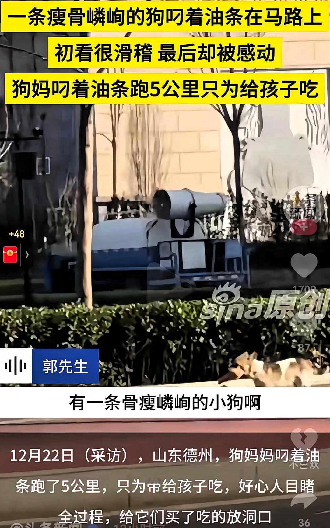 母爱不分物种!山东德州,一条狗叼着油条,跑了5公里,自己都已经瘦成皮包骨头了,却把孩子养的胖乎乎的。 看完这只狗妈妈的故事,我直接破防了!原来母爱真的无关物种,只关乎拼尽全力的守护。 狗妈妈它自己饿得皮包骨头,却把好不容易捡到的口粮全让给孩子,有人想靠近帮忙,它立马警惕低吼,用尽全力护住幼崽。 这片开发区根本没什么食物,它每天都要往返10公里,去5公里外的包子铺附近捡吃的。 最让人揪心的是,工地年前就要拆迁,它们连过冬的窝都要没了。其实很多拆迁地都有被遗弃的流浪动物,它们要对抗饥饿、寒冷,还要提防危险。 我觉得这只狗妈妈的故事,不只是让我们感动于母爱,更该让我们看见流浪动物的困境。它们不懂什么大道理,却把“为孩子好”刻进了本能里。 真心希望能有好心人看到它们,给它们一个温暖的去处。如果你遇到这样的流浪母子,会愿意伸一把手吗?狗妈妈护崽 狗妈带崽 宠物狗妈妈