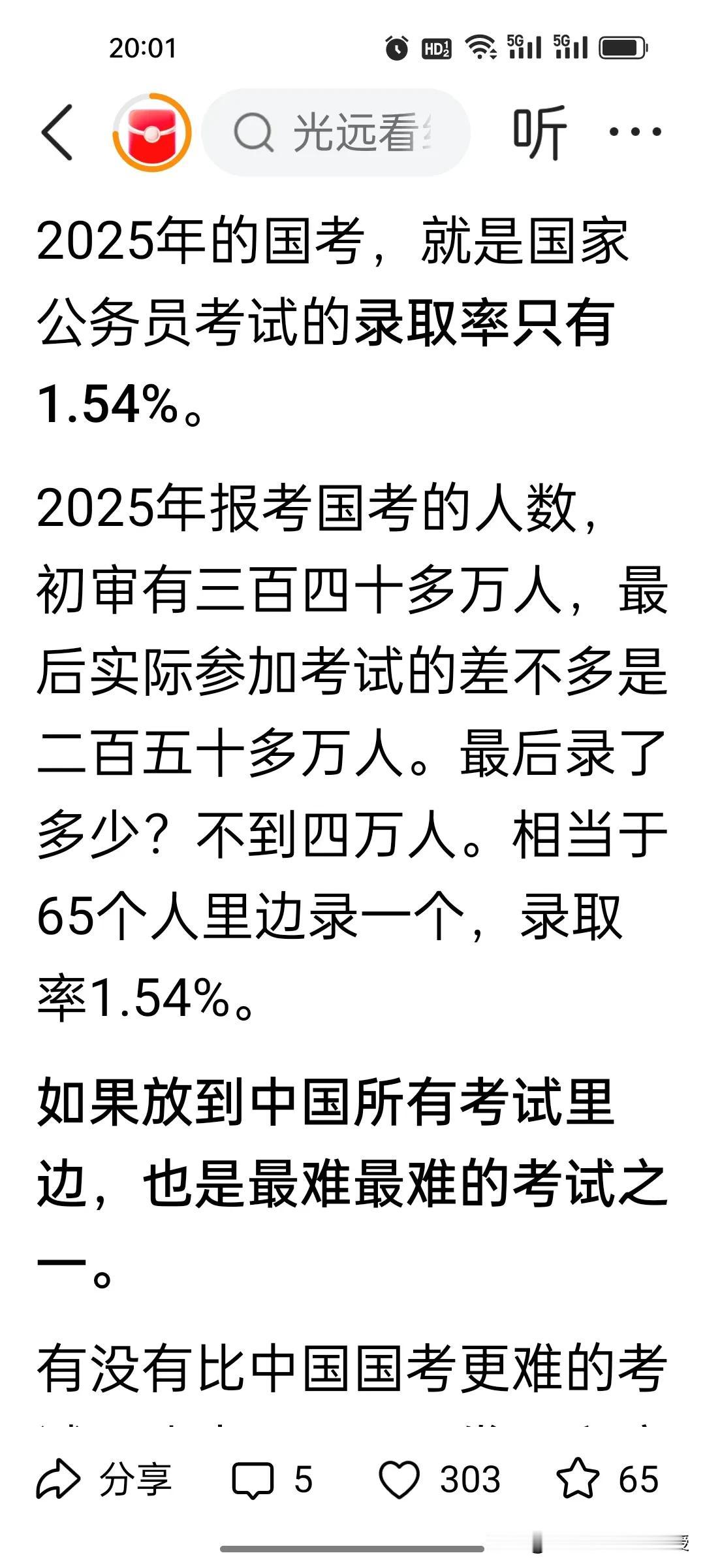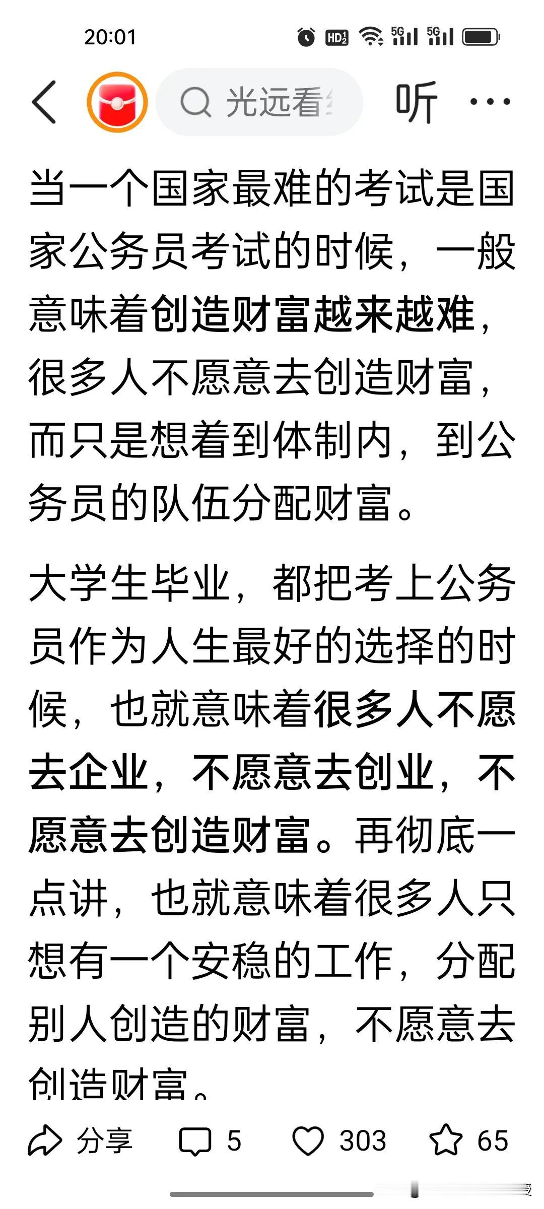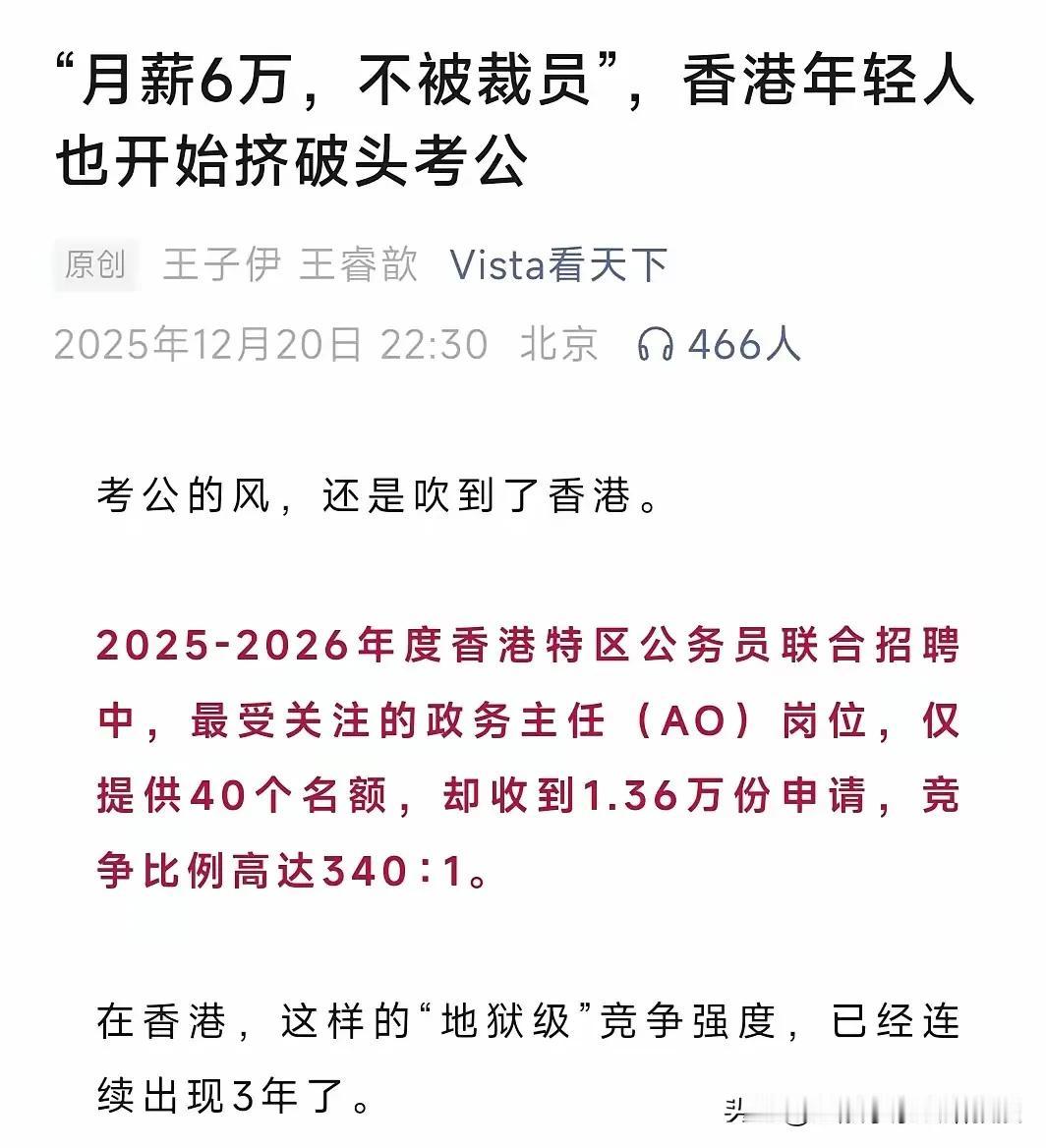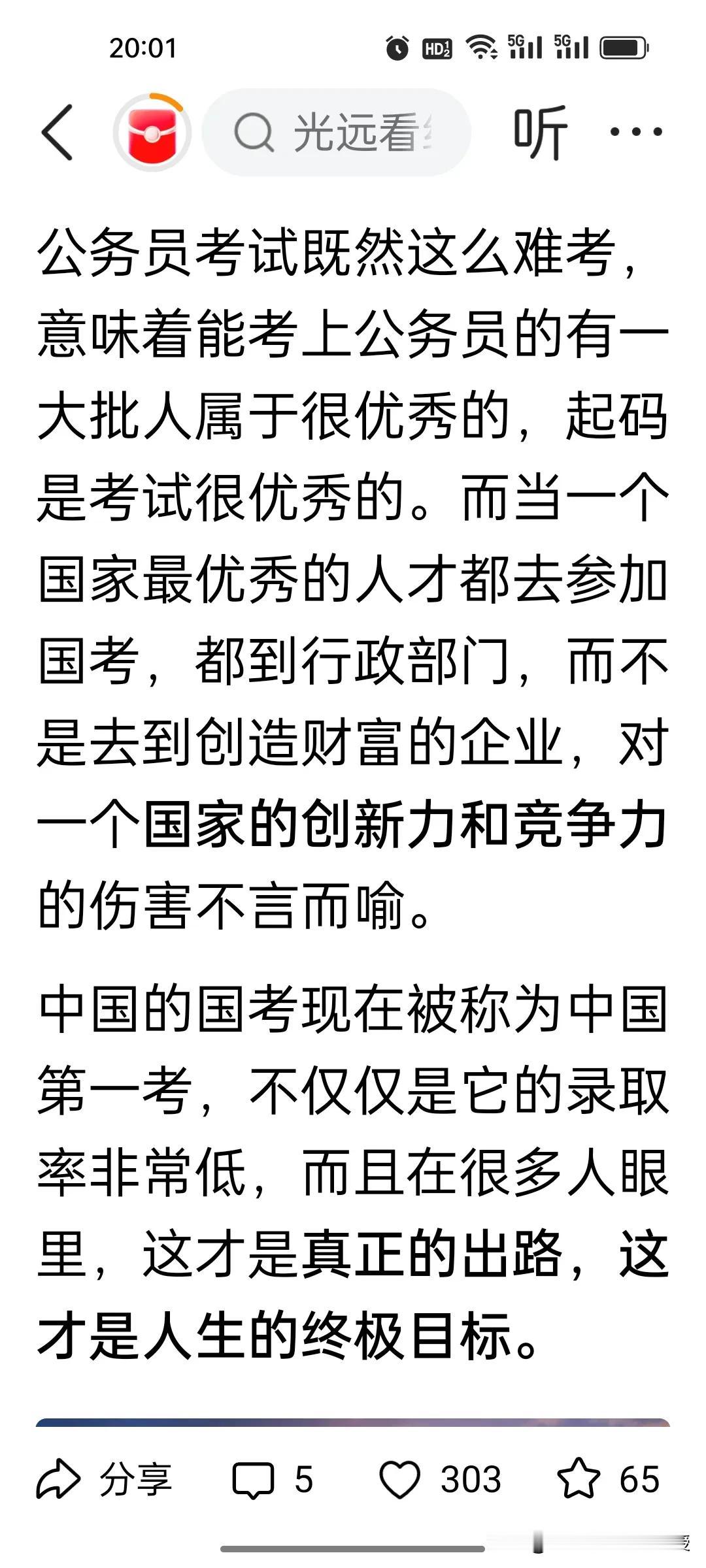 马光远太敢说!刚刚看到马光远关于如今考公热现象的分析,马光远直言考公人数与经济活力成反比: 第一,2025国考录取率仅1.54%,成“最难考试”折射创富意愿低迷。 第二,优秀人才扎堆体制内,会削弱国家创新力与竞争力。 第三,体制内外差距的观念壁垒,是经济活力的隐形枷锁。 而马光远还举例印度的国考录取率是百分之一,比我国国考的录取率还低。 其实,香港这两年也出现考公热的现象。香港公务员工资高,尤其是面对应届本科生招聘的政务主任,月薪达到6万,可是,2025 - 2026年香港政务主任岗位仅招40人,却引来1.36万人申请,340:1的竞争比远超内地国考。 当各地年轻人都挤向体制内去争抢“铁饭碗”,不禁让人思考:何时创富的热情能像90年代一样盖过求稳的执念?当所有人都想着“进体制求稳”,谁来撑起社会的创新与活力?现在想想,如果像宇树机器人王兴兴,deepseek梁文锋这样的年轻人当年都去考公了,也就不会有今天的巨大成就。