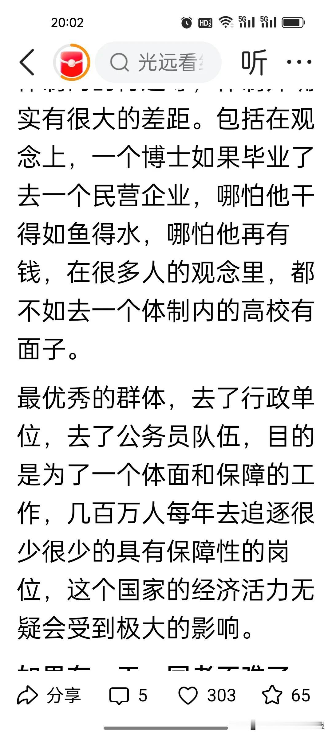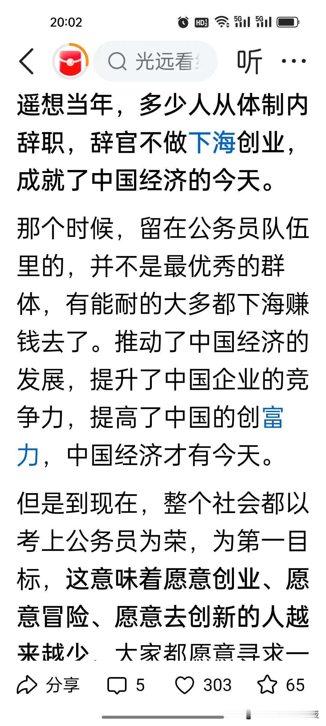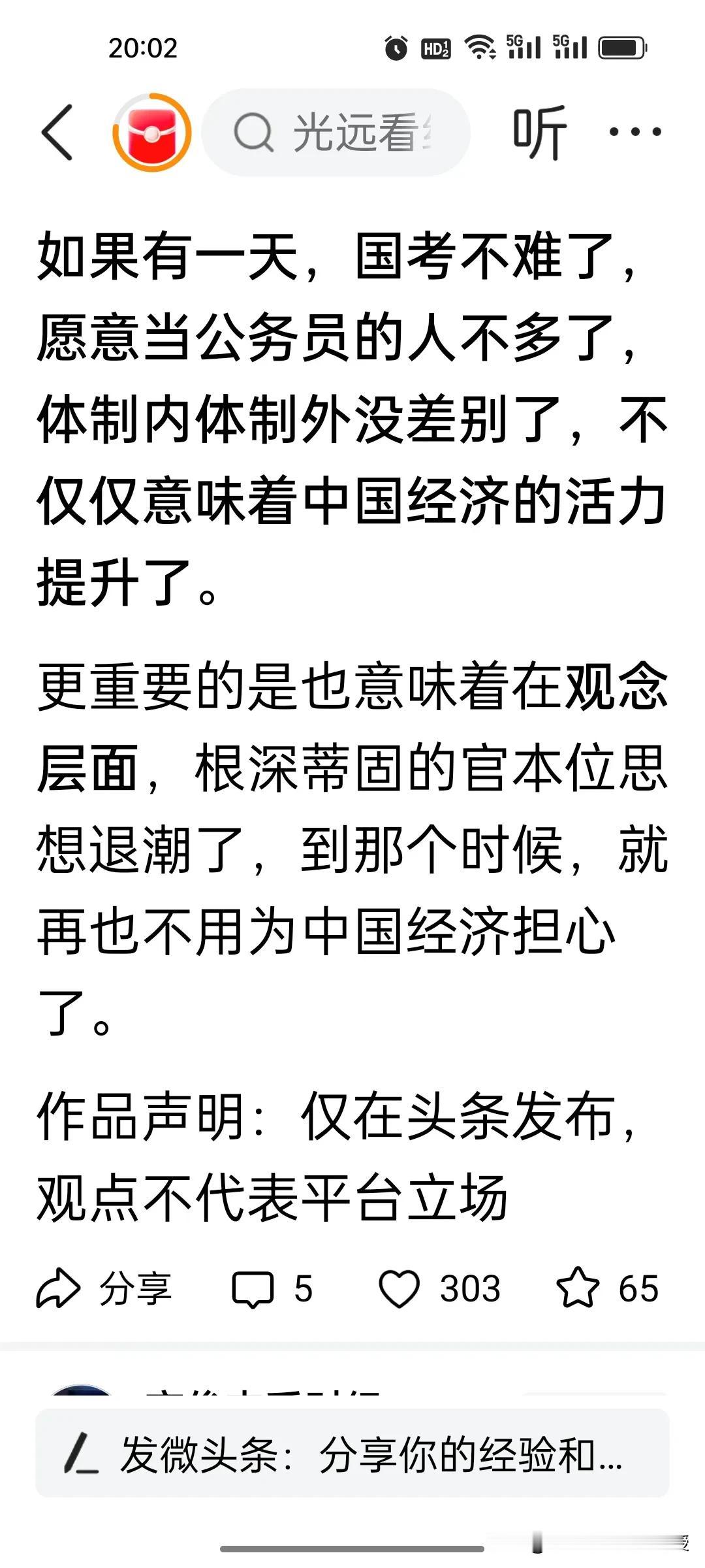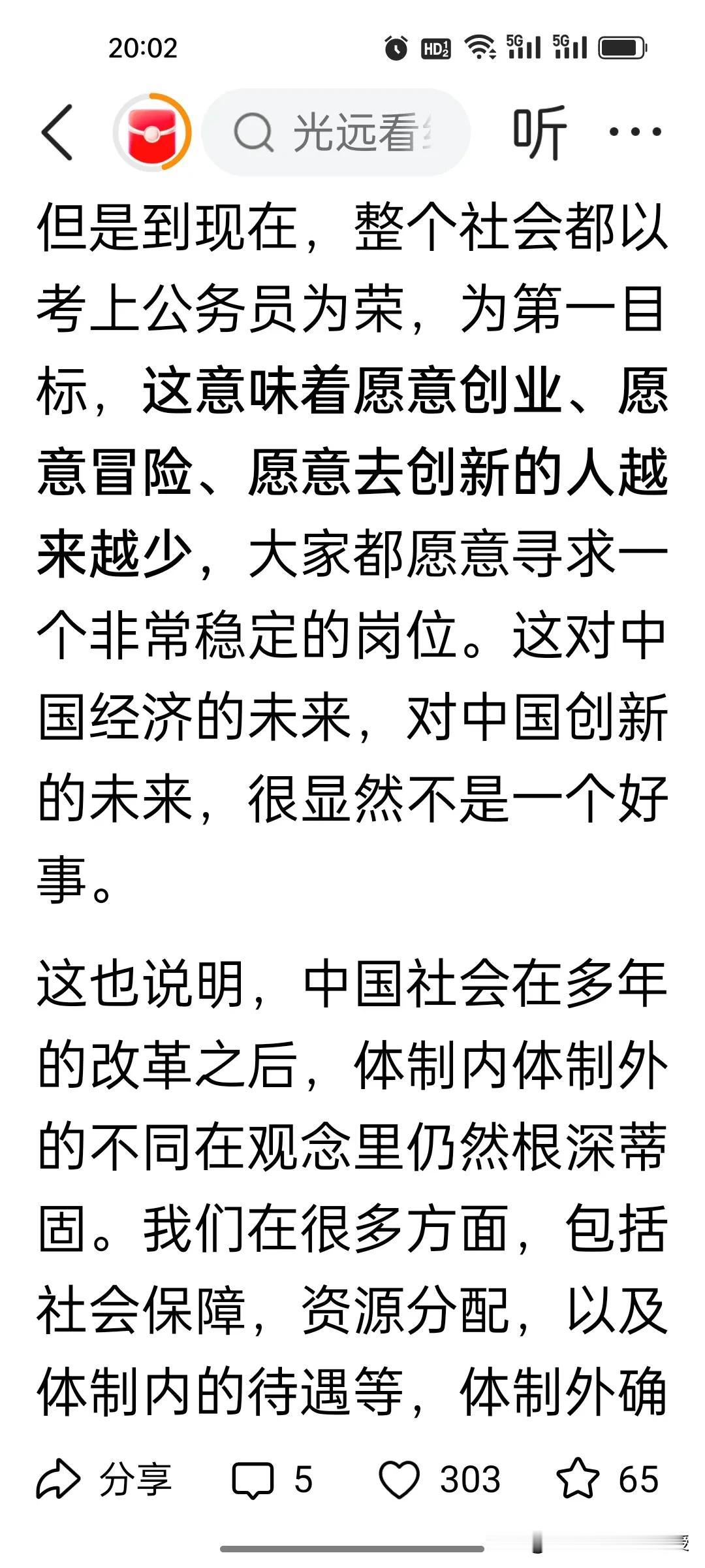 马光远太敢说!刚刚看到马光远关于如今考公热现象的分析,马光远直言考公人数与经济活力成反比: 第一,2025国考录取率仅1.54%,成“最难考试”折射创富意愿低迷。 第二,优秀人才扎堆体制内,会削弱国家创新力与竞争力。 第三,体制内外差距的观念壁垒,是经济活力的隐形枷锁。 而马光远还举例印度的国考录取率是百分之一,比我国国考的录取率还低。 其实,香港这两年也出现考公热的现象。香港公务员工资高,尤其是面对应届本科生招聘的政务主任,月薪达到6万,可是,2025 - 2026年香港政务主任岗位仅招40人,却引来1.36万人申请,340:1的竞争比远超内地国考。 当各地年轻人都挤向体制内去争抢“铁饭碗”,不禁让人思考:何时创富的热情能像90年代一样盖过求稳的执念?当所有人都想着“进体制求稳”,谁来撑起社会的创新与活力?现在想想,如果像宇树机器人王兴兴,deepseek梁文锋这样的年轻人当年都去考公了,也就不会有今天的巨大成就。