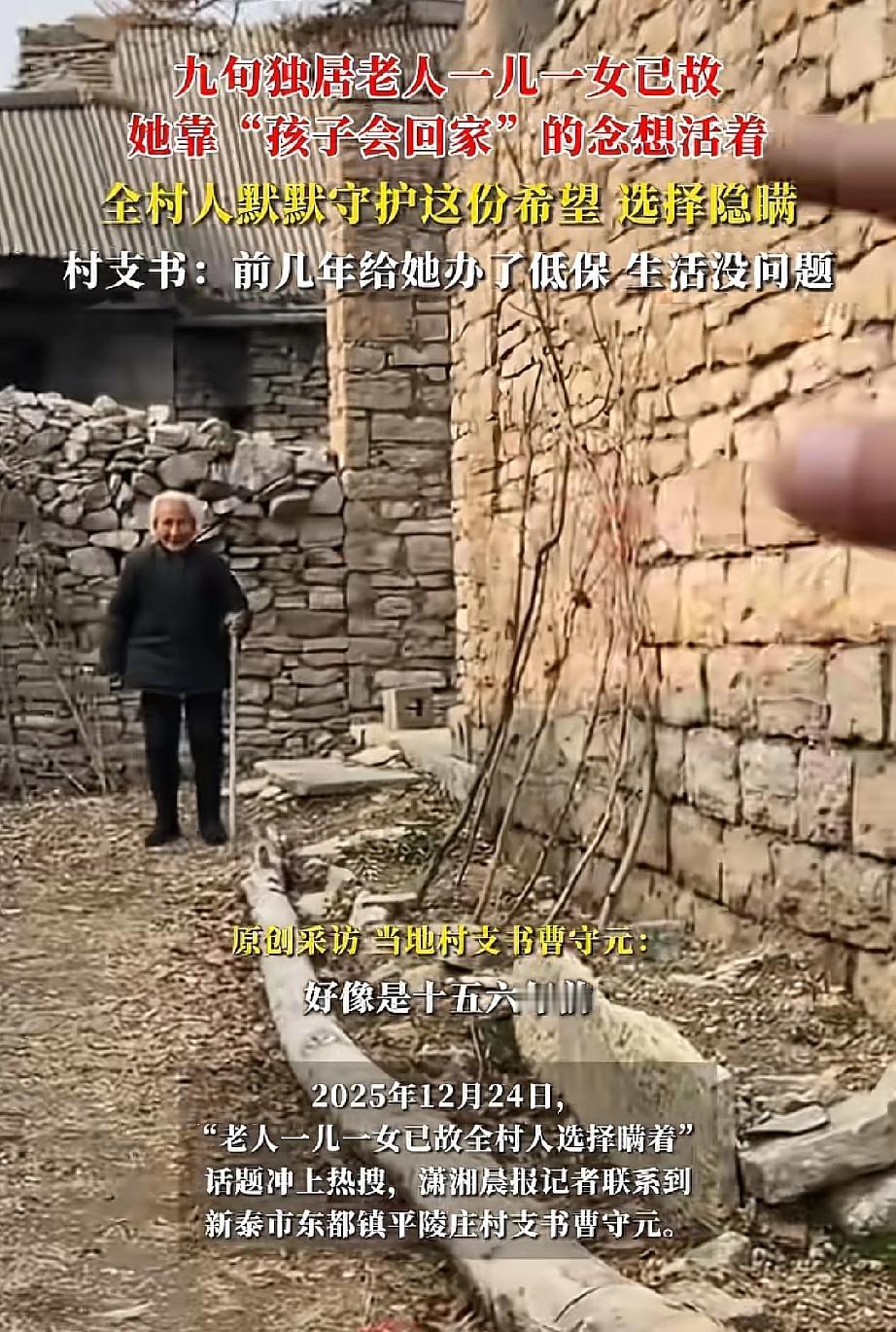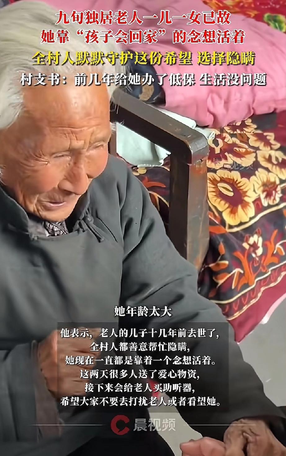 这就是人间温暖!90岁的老人独自生活,她的一儿一女都已离世。但老人却坚信“孩子会回来的”,她靠着这个信念苦苦支撑着。村干部为老人办理了低保,让她生活有了保障。村里人齐心协力,将子女去世的消息瞒着老人。 村支书希望网友不要轻易去打扰老人的生活,更担心前去探望的网友不小心说漏嘴,毕竟这是老人活下去的希望。 村支书表示,老人的儿子十几年前外出打工后便没了音信,村里人都默认他已经去世。近日,他打算为耳聋的老人买一个助听器。 按照老人的年龄推算,她的儿子也大概有70岁了。能办理低保,说明老人的儿子没有成家,也没有子女。 至于老人的女儿,或许已经成家立业、有了子女,但肯定去世了。不过在农村的传统观念里,嫁出去的女儿通常不承担抚养父母的责任,所以也就不必过多猜测了。 这是多么美好的村庄,有着多么真挚的情谊啊! 这个村子藏着世间最动人的模样——村民靠着默契的行动与善意的谎言,让老人生活的无忧,又有盼头。 老人脸上的笑纹里,藏着邻里递来的热粥,藏着深夜亮起的灯盏,藏着这世间最熨帖的温柔。 这便是人间温暖!无关血缘的牵绊,只凭一份淳朴的善意,把细碎的照料熬成岁月的甜。 来源:潇湘晨报晨视频