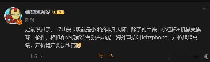 【小米17U徕卡版定价将创新高】 微博透露小米17 Ultra徕卡版定价肯定要创新高:“17U徕卡版就是小米的非凡大师,除了独享徕卡小红标+机械变焦环,软件、相机和外观都会有独占功能,海外直接叫leitzphone,定位超超高端,定价肯定要创新高”