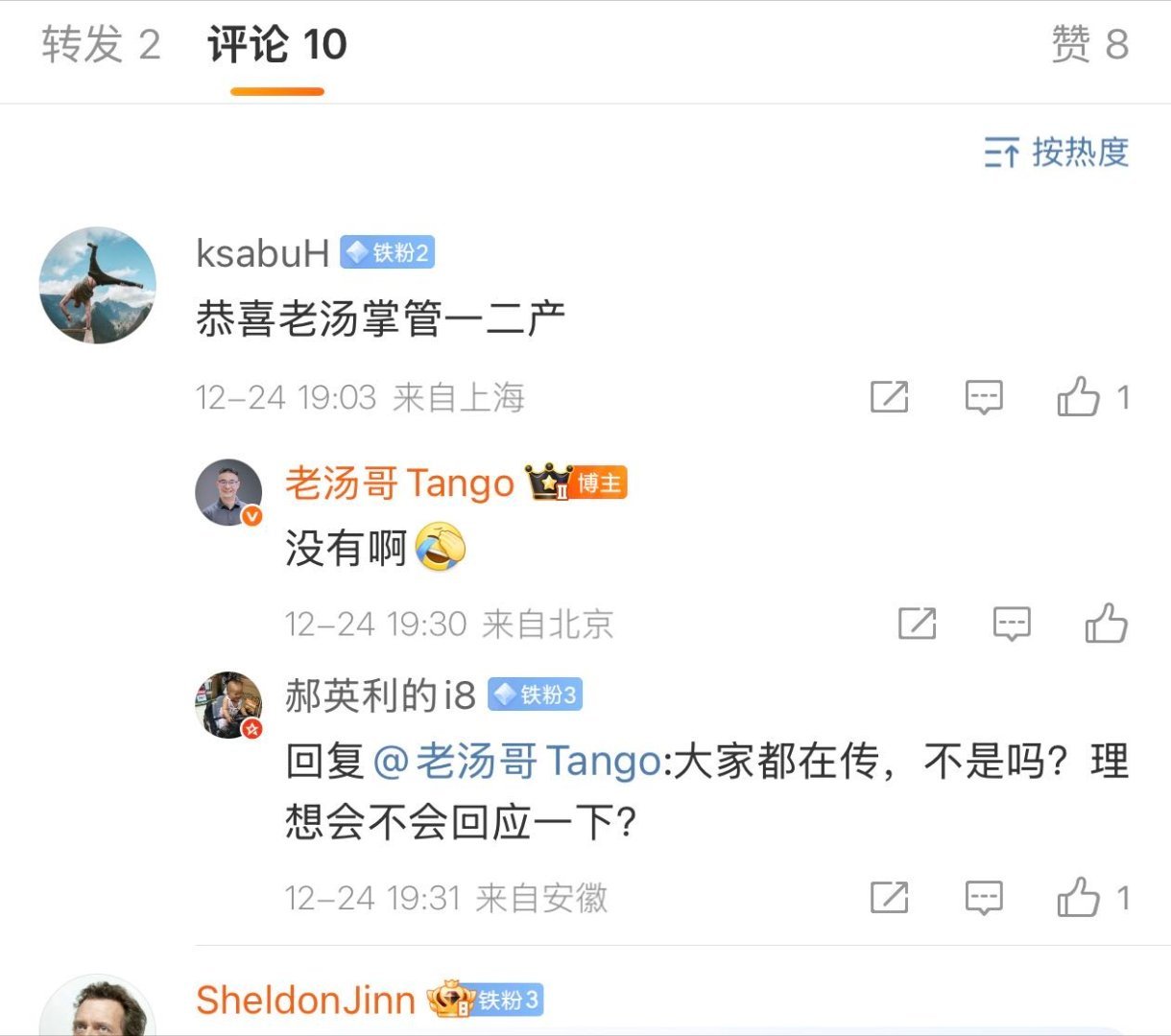 理想第一产品线负责人,辟谣掌管一二产品线。起码在现在这个时间段,老汤的地盘还没有扩大
