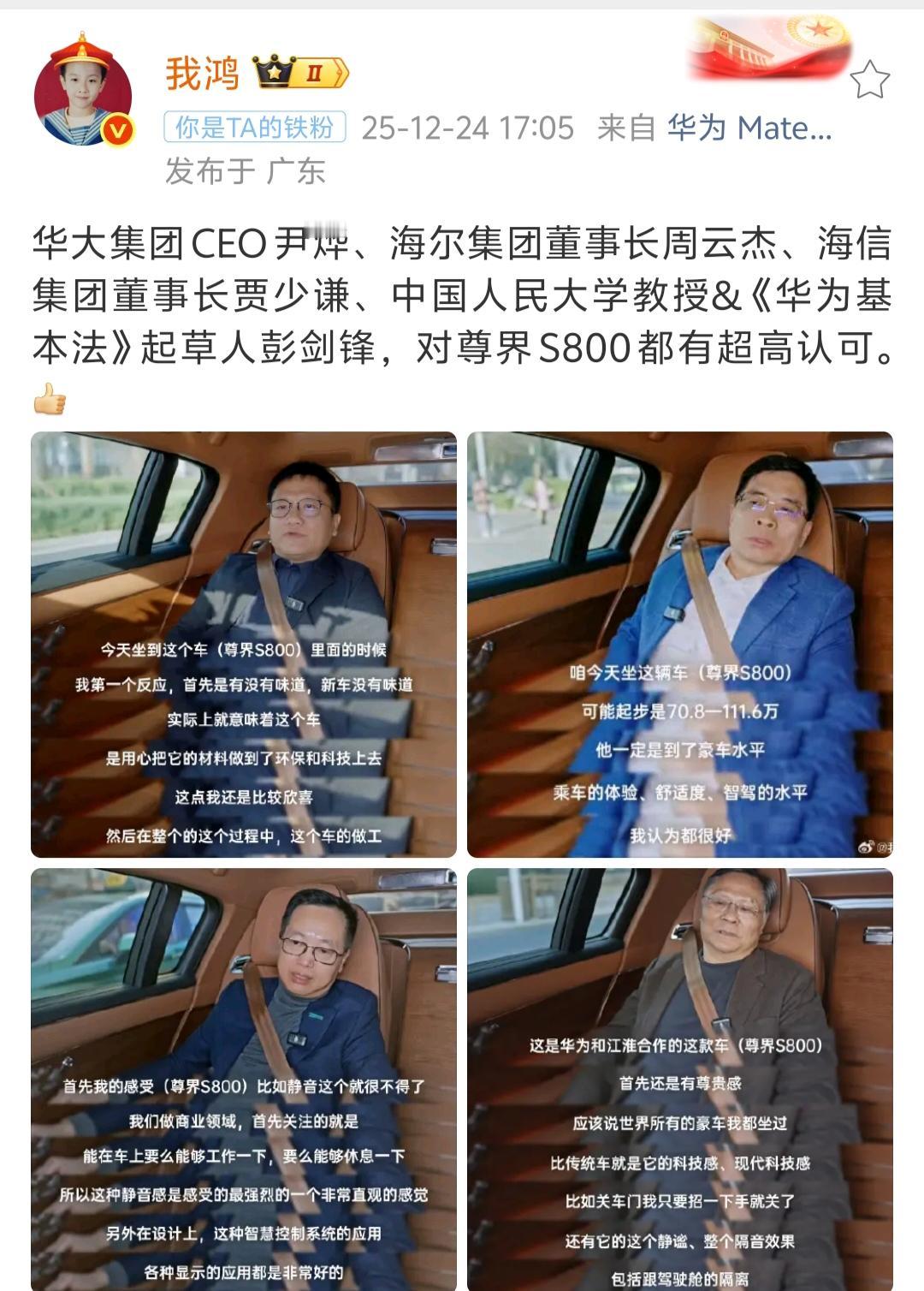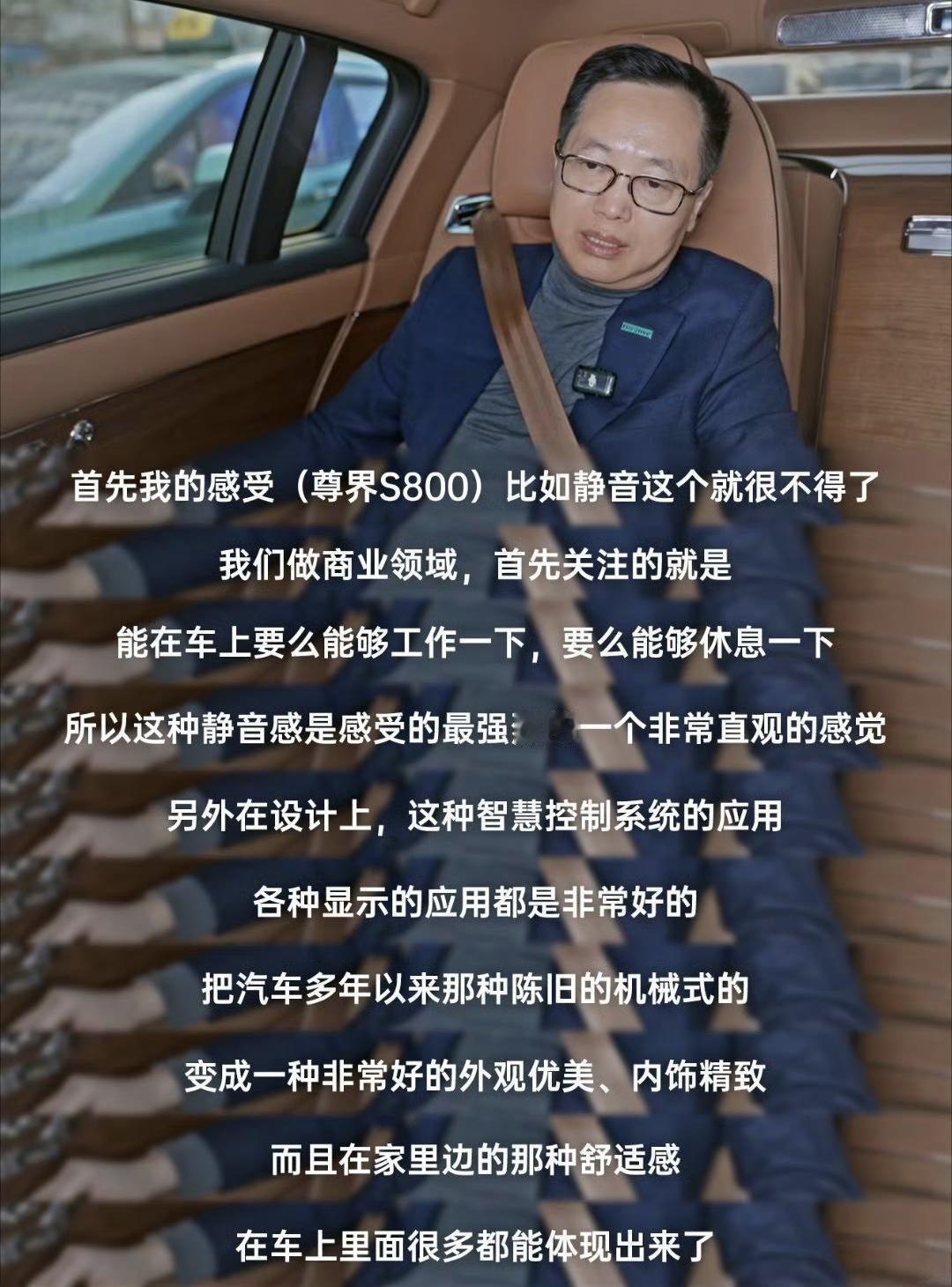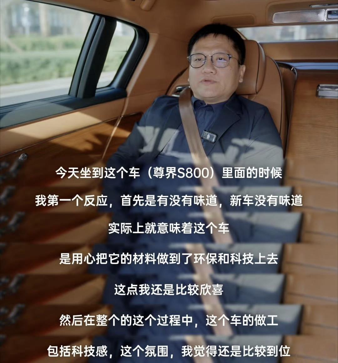 尊界就是这样征服行业大佬的。鸿蒙智行团队成员“我鸿”发文说,华大集团CEO尹烨、海尔集团董事长周云杰、海信集团董事长贾少谦、中国人民大学教授兼《华为基本法》起草人彭剑锋在亲自体验了尊界S800后,他们均高度认可尊界的科技豪华。 华大集团CEO尹烨最关注车辆的材料环保性,他说,体验尊界后发现,新车完全没有异味,认为这体现了车辆在环保材料和科技工艺上的用心,车辆的做工和整体科技氛围营造得很到位。 海尔集团董事长周云杰直言,尊界这款车的定位和体验已经达到了豪车水准,不管是乘车时的整体感受、座椅舒适度,还是智能驾驶的能力,都值得“很好”的评价。 海信集团董事长贾少谦对尊界的静音效果印象最深,觉得这一点能很好满足商务场景里办公或休息的需求;他同时也肯定了车辆的智慧控制系统和各类显示功能的应用,认为设计上把传统汽车的机械式体验升级成了外观优美、内饰精致的新感受,还能带来居家般的舒适感。 中国人民大学教授、《华为基本法》起草人彭剑锋说,自己坐过众多世界豪车,对比后认为尊界S800的核心优势是把现代科技感和传统豪车的尊贵感结合得很好,比如挥手关门的智能交互、出色的隔音效果以及驾驶舱的隔离设计,都是其突出亮点。 行业大佬们的认可,就是高端市场给予尊界的回响,也难怪尊界一路走来,黑子们怎么黑都黑不动,成为鸿蒙智行旗下新的耐黑王。 尊界S800上市202天交付突破10000台,相当于日均50台,每小时2台。这个记录只能是尊界自己不断的刷新了。尊界挑战豪车 尊界豪华体验 华为尊界汽车 尊界汽车 尊界实车 尊界S800