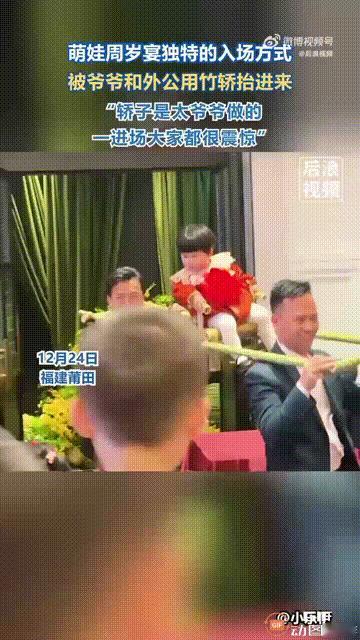 福建莆田一个宝宝过周岁生日,家人为她准备了周岁宴,而宝宝的入场方式非常奇特,是由爷爷和姥爷一起抬轿子进来的。 对此宝宝的妈妈表示,这是一种仪式感,轿子是由宝宝的太爷爷亲手制作,也叫状元轿子,进场的时候引起了所有宾客的欢呼,这样做是为了记录宝宝1周岁的样子。 网友看完这段视频,都觉得这个宝宝的周岁宴实在是太隆重了。 没想到家人不仅帮宝宝准备了周岁宴,居然还有抬轿子进场的环节,由爷爷和姥爷担任轿夫,抬着亲爱的孙儿入场,这样的画面也是很有意义了,说明宝宝真的是受到全家人宠爱。 另外还有太爷爷亲手制作的轿子,也是寓意深远,说明长辈们都希望宝宝能够一飞冲天,成为状元之才,也是承载着美好的祝福,不得不说,这个宝宝真是集万千宠爱于一身呀。大家怎么看呢?