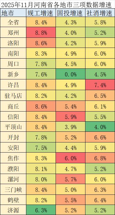2025年1-11月河南省各地市规工,固投,社消增速。 郑州,焦作,许昌各有一项第一。