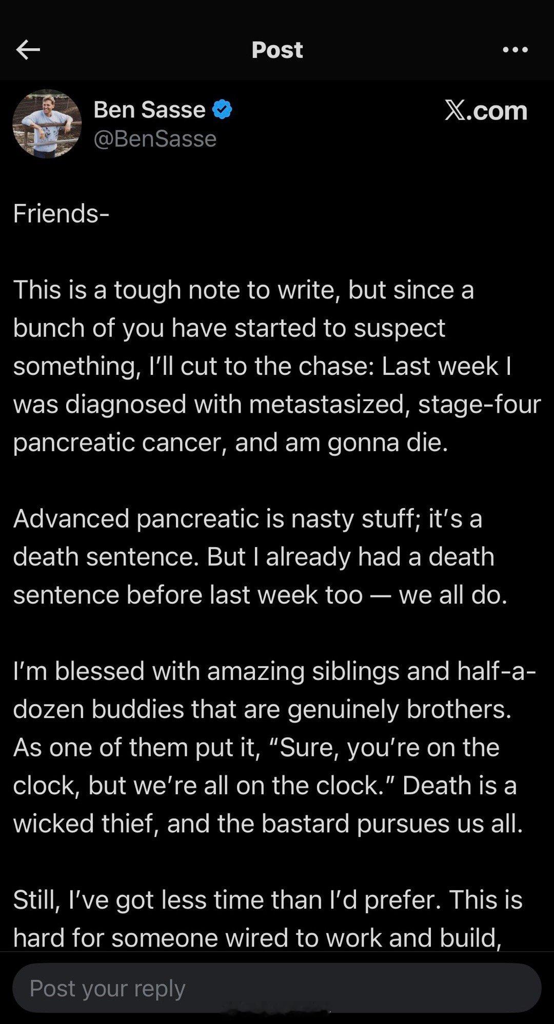 前内布拉斯加州共和党联邦参议员、前佛罗里达大学校长Ben Sasse宣布自己已经胰腺癌四期转移,即将告别人世。52岁的他是土生土长的内布拉斯加人:本科毕业于哈佛大学政府系,后在牛津大学进修,最终在耶鲁大学获得历史学博士学位。作为保守派,他以直言不讳著称,常批评政治极端主义和党派部落主义。他是共和党内少数公开批评特朗普的人之一。萨斯是虔诚基督徒,著有书籍讨论美国文明、科技与孤独等议题。他和妻子结婚三十年,有三个孩子。去年7月,他辞去佛罗里达大学校长职位,专注于家庭。他在X上写道:朋友们——这是一封很难写的信,但既然你们很多人已经开始怀疑出了什么事,我就直入正题吧:上周,我被诊断出胰腺癌已转移,四期,我将不久于人世。晚期胰腺癌是一种非常凶险的疾病,它就是一张死刑判决书。但其实在上周之前,我也已经有一张死刑判决书——我们每个人都一样。我很幸运,有一群了不起的兄弟姐妹,还有五六个真正称得上兄弟的朋友。正如其中一位说的:“没错,你现在在倒计时,但我们所有人都在倒计时。”死亡是个残酷的小偷,这个混蛋追着我们每个人不放。尽管如此,我剩下的时间还是比我希望的要少。对于一个天生喜欢工作和创造的人来说,这很艰难;但作为丈夫和父亲,这更艰难。我无法形容我的家人们有多好。在过去一年里,我们暂时退出了公众生活,建立了新的家庭节奏,我和梅丽莎(Melissa)的关系变得更加亲密——这是在我们已经拥有三十年最美好友谊的基础上。七个月前,科莉(Corrie)在空军受衔,现在正在飞行学校学习仪表飞行和多发动机飞行。上周,亚历克斯(Alex)提前一个学期大学毕业,还同时教普通化学、有机化学和物理(她就是个怪才)。这个夏天,14岁的布雷克(Breck)开始学开车。(好吧,我们其实已经偷偷开了六年车——但现在终于有了合法驾照。)我无比感恩,能不断紧紧拥抱这群由罪人与圣人组成的杂牌军。没有一个好时机来告诉你的亲人们,你现在正以更快的节奏迈向终点——但降临节(Advent)季节还不算最糟糕的。作为一个基督徒,圣诞节前的几周是我们将心导向未来盼望的时刻。不是对人类美好幻想的抽象盼望;不是那种模糊的、贺曼式多愁善感的灵性;也不是靠自己力量硬撑的盼望(我曾经引以为傲的肌肉如今正在消逝,这是多么愚蠢)。不,我们常常懒惰地把“盼望”说成是“乐观”。我要澄清:乐观是很好的,也是绝对必要的,但它并不足够。当你告诉女儿们你无法陪她们走红毯时,乐观撑不住;当你告诉父母他们将要埋葬自己的儿子时,乐观也撑不住。一个充实的人生需要更真实、更坚韧的东西。这就是为什么在降临节,即使仍走在黑暗中,我们也要大声宣告我们的盼望——往往是用带着泪水、沙哑的声音坚强喊出。这就是朝圣者的呼召。那些知道自己需要大医师的人,理当期待那持久的美好与最终的成就。也就是说,我们盼望一位真实的救赎主——一位在真实时间、真实地点降生的拯救之神。但那座有根基、没有癌症的永恒之城——尚未到来。记起以赛亚对未来的预言,并不会减轻当前苦难的疼痛。但它确实将苦难置于永恒的视角之中:“当我们在那里已有一万年……我们仍有无数日子来颂赞上帝。”我以后还会有更多想说。我不会不战而降。上帝恩典的一个小小部分,就体现在过去几年科学在免疫疗法等领域取得的惊人进步上。死亡和临终过程不是一回事——临终的过程仍然是可以活出来的。我们家里正热烈拥抱一种黑色幽默,我承诺会尽自己一份力,把不敬的玩笑进行到底。但现在,当我们的家庭面对治疗的现实——更重要的是,当我们庆祝圣诞节时,我们祝愿你们平安:“行在黑暗中的百姓看见了大光;住在死荫之地的人有光照耀他们……因有一子赐给我们”(以赛亚书9章)。带着极大的感恩,以及沙哑却充满盼望的声音, 本(Ben)——以及萨斯一家