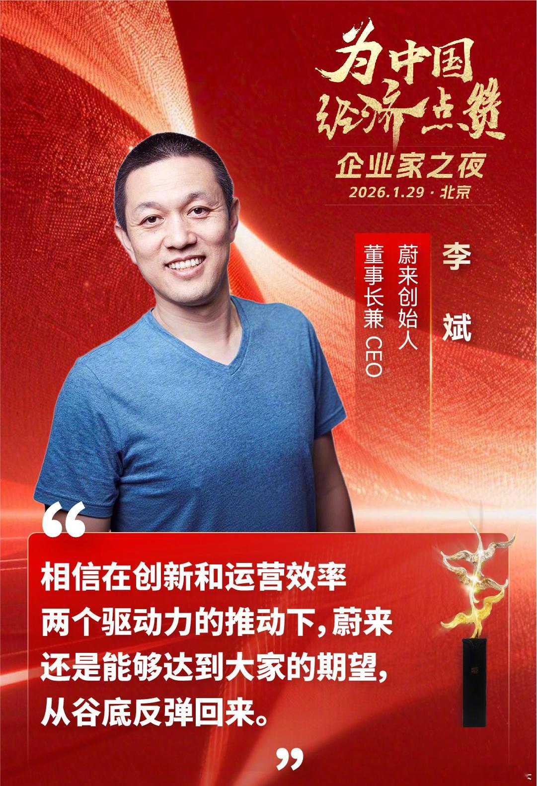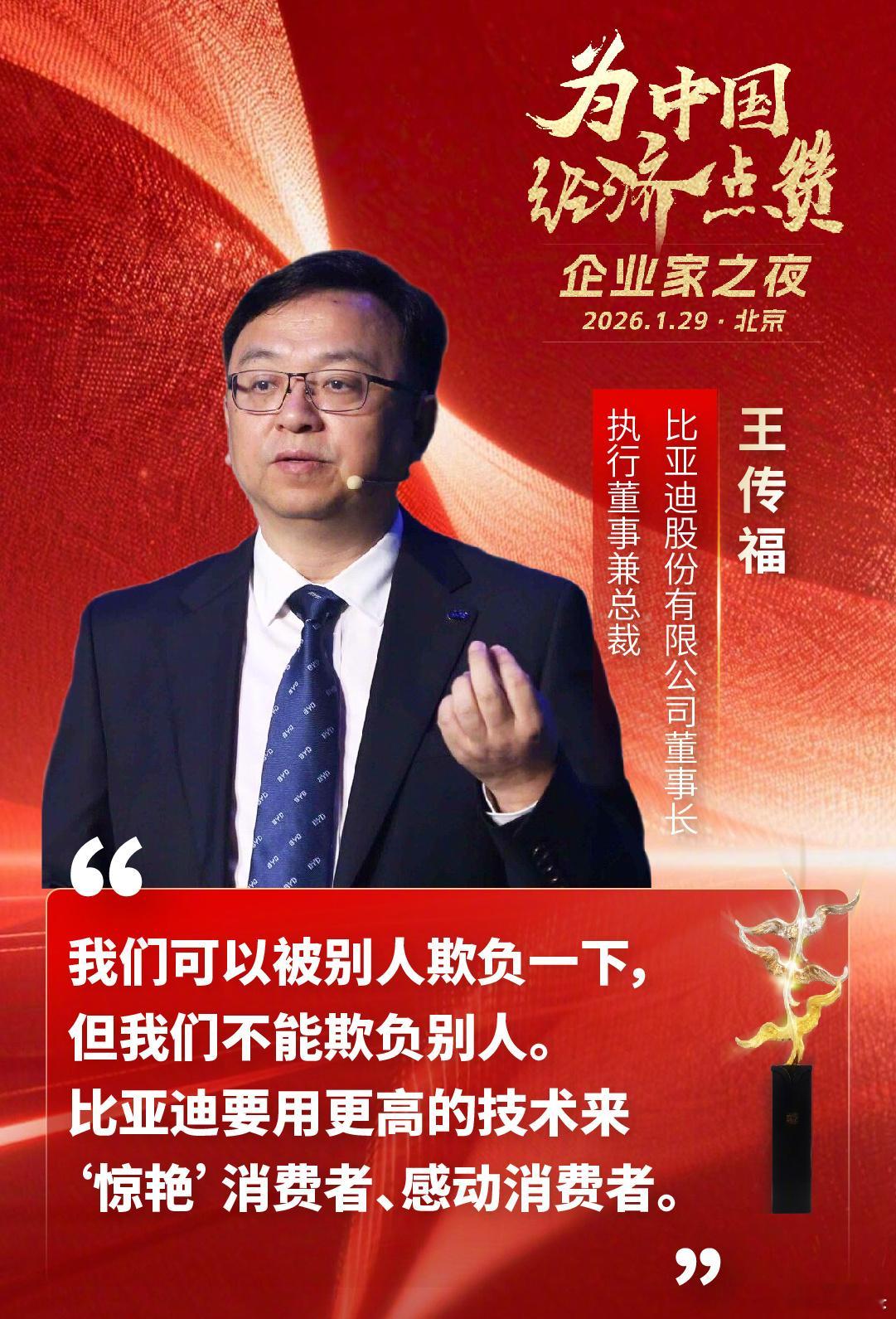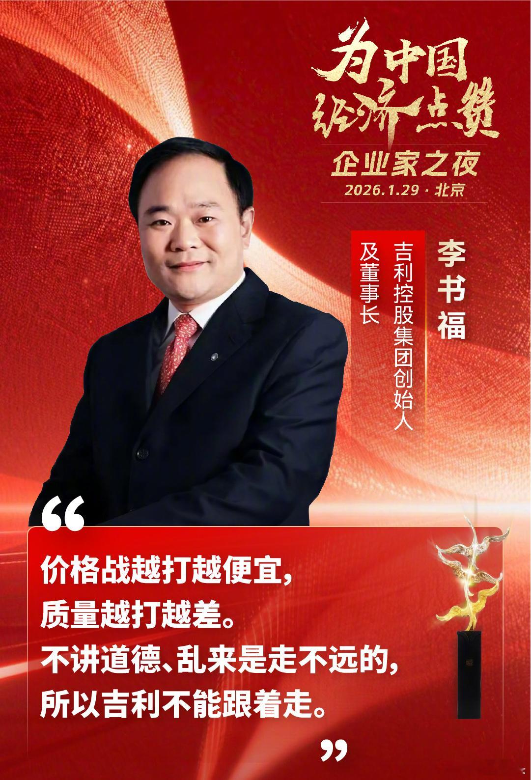 雷军:没有什么是命中注定的,别人觉得你行不行不重要,关键是你自己有没有勇气,有没有决心去试一试。余承东:我们要持续打造卓越产品,构建智慧全场景极致体验。李斌:相信在创新和运营效率两个驱动力的推动下,蔚来还是能够达到大家的期望,从谷底反弹回来。王传福:我们可以被别人欺负一下,但我们不能欺负别人。比亚迪要用更高的技术来“惊艳”消费者、感动消费者。李书福:价格战越打越便宜质量越打越差。不讲道德、乱来是走不远的,所以吉利不能跟着走。尹同跃:质量比销量更重要,创新比利润更重要。企业家之夜 为企业家们点赞~我觉得企业家们都说得很好,我们要支持企业家,力挺企业家,无差别点赞企业家~