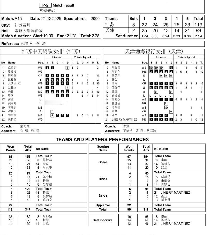 李响16分!陈鹤心14分!路晶11分!刘敏乔10分!天津女排年轻队员五人得分上双! 本场比赛技术数据统计如下:副攻刘敏乔10分,主攻陈鹤心14分,接应李响16分,主攻路晶11分,副攻马丁内兹12分。天津女排五人得分上双! 江苏女排对阵天津女排的技术数据对比,进攻66-67,拦网23-4,发球8-6,失误送分22-22。总分119-99。 天津女排输在拦网环节上。天津女排的拦网得分只有4分,江苏女排的拦网得分高达23分。天津女排的副攻拦网不是很好。 天津青年女排五局大战江苏女排国家队,最后决胜局21-23的2分惜败。天津女排年轻队员面对国家队队员敢打敢拼,作风优良,未来天津女排一定可以重铸辉煌!天涯体育排球讯