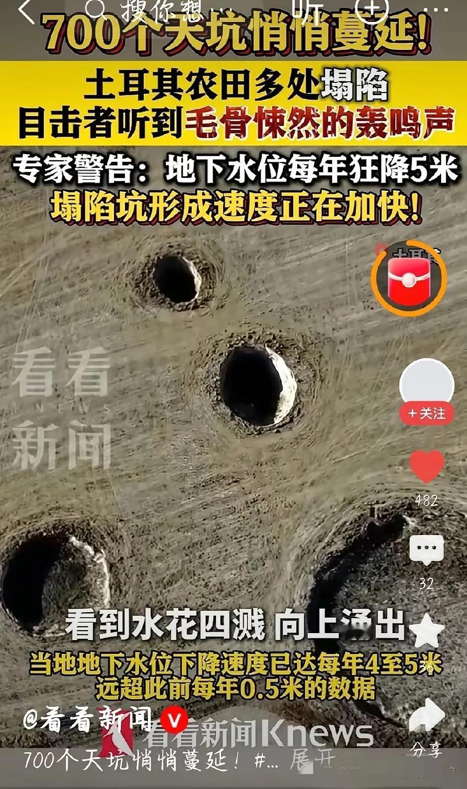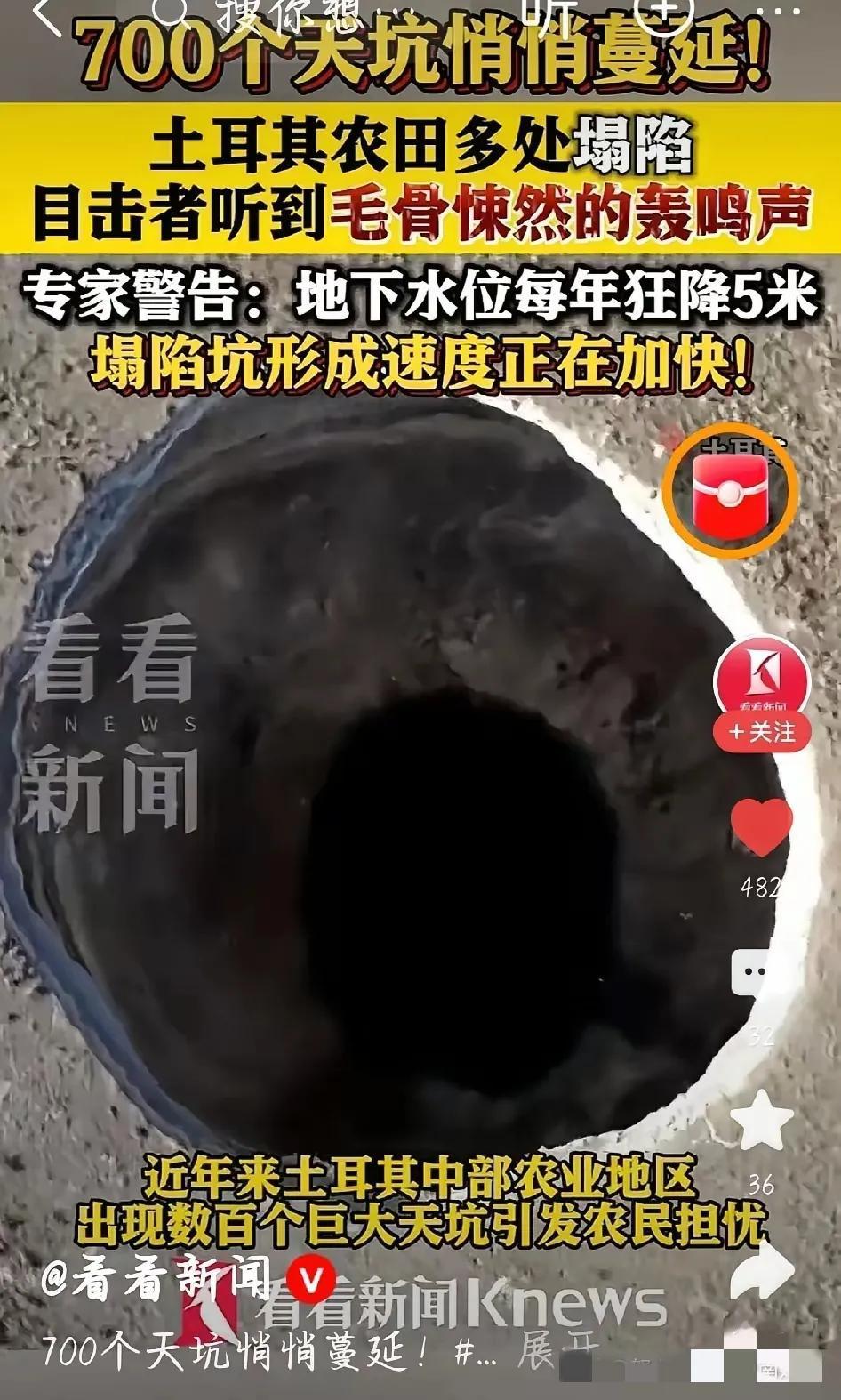 土耳其这波天坑危机太离谱了!近700个超大深坑,硬生生吞掉全国11%的粮仓,农民种地跟玩扫雷似的,生怕脚下突然塌方,太揪心了! 说到底这哪儿是天灾,分明是实打实的人祸!气候变暖让土耳其连年干旱,地下水位暴跌,再加上数万口井疯狂超采地下水,地下溶洞没了支撑,塌方成了必然,还有1850个潜在塌陷点,想想都后怕! 地球从不是任人薅羊毛的许愿池,过度索取迟早遭反噬,土耳其这就是活生生的教训!生态保护从来不是空话,但凡对自然多些敬畏,也不会落得这般境地。 这事儿更是给全人类敲了警钟,再不严控资源开采、重视气候问题,下一个被天坑盯上的,说不定就是咱脚下的土地!这道理,真得记牢了!