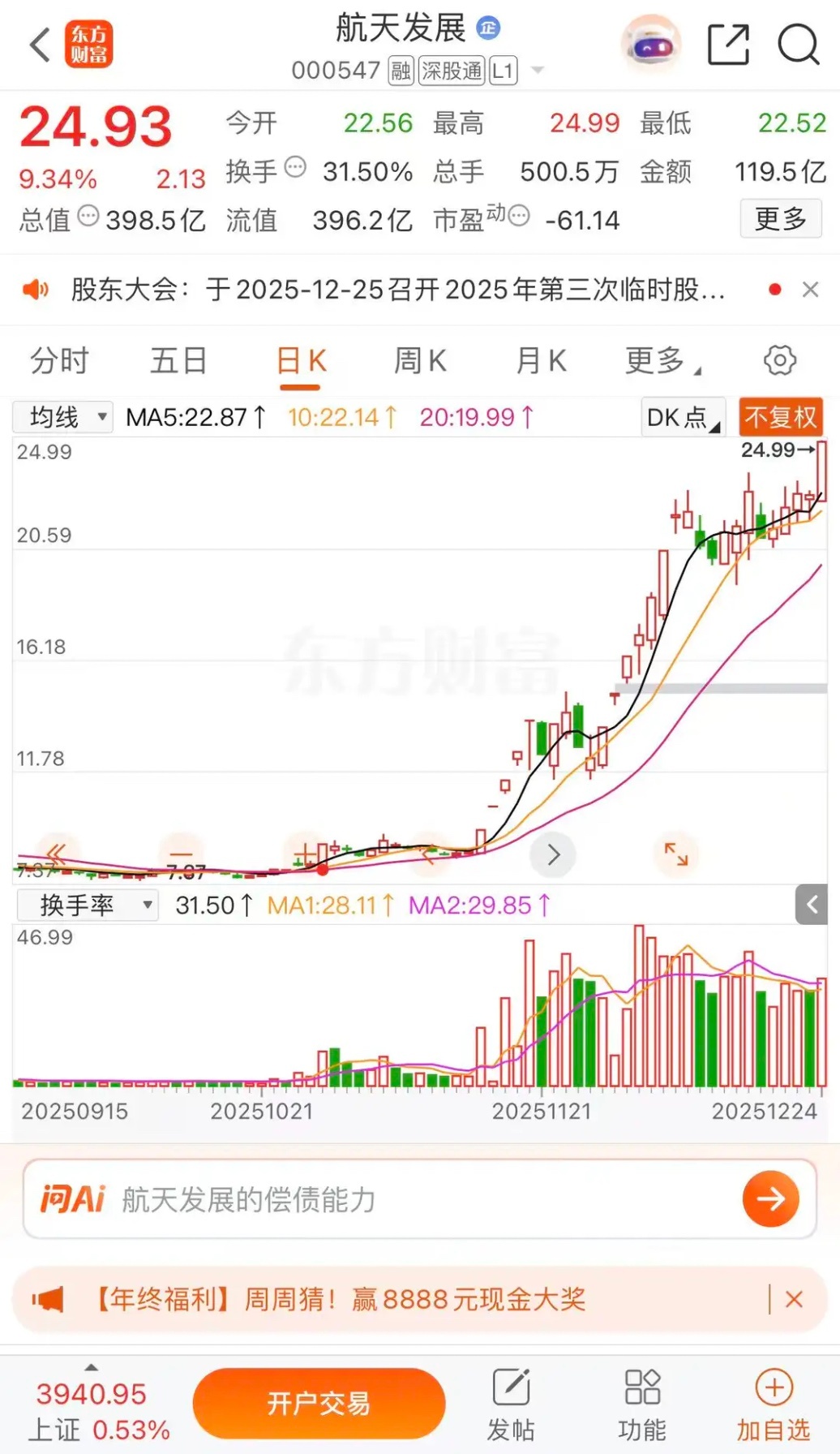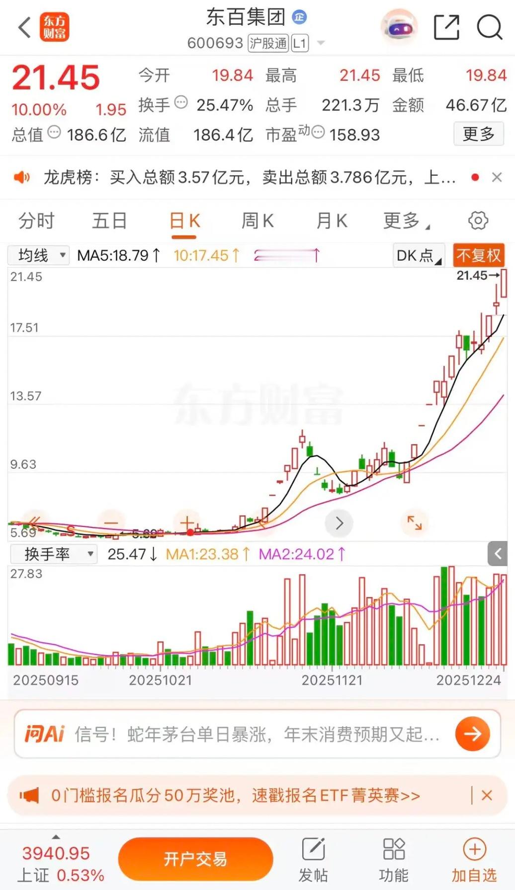 航天发展创新高,东百集团创新高,合兴包装低价后起之秀航天发展涨幅达到9.34%,差点涨停板,收盘报收24.93元每股,成交金额119.5亿元,强势不可挡。东百集团涨停板收盘报收21.45元每股,成交金额46.67亿元,促消费大牛股。合兴包装涨停板收盘报收5.95元每股,成交金额5.46亿元,3连板涨停,4连板可期,低价股成妖,强强强。