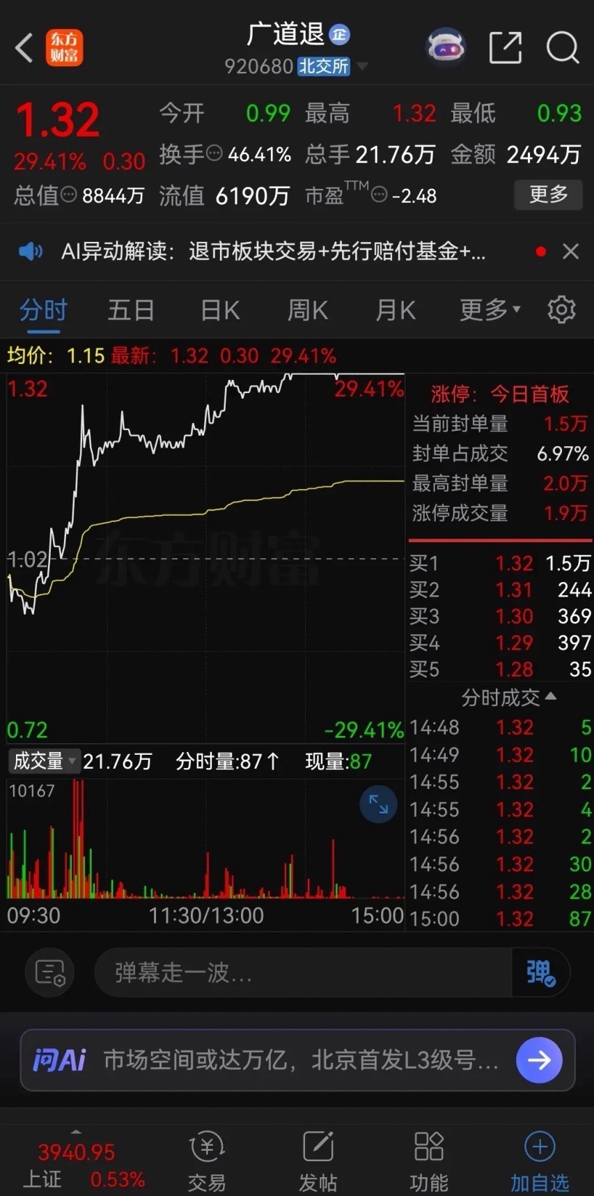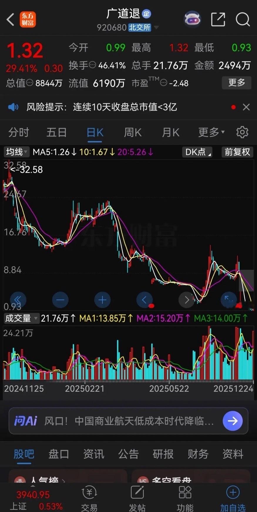 真是服了!还有5天退市,股价却来了个30厘米涨停!广道数字因涉嫌重大财务造假被强制退市,12月11日进入退市整理期第一天暴跌71%,随后又连续下跌8天,本以为就这样退市了,做梦都没有想到今天会突然强势30厘米涨停,直到收盘,涨停板上还有封单1.5万手,换手率高达46.41%。明知道还有5个交易日就摘帽退市了,它却从“棺材里”蹦出来,开启了狂欢,这是退市也要拉个垫背的吗?