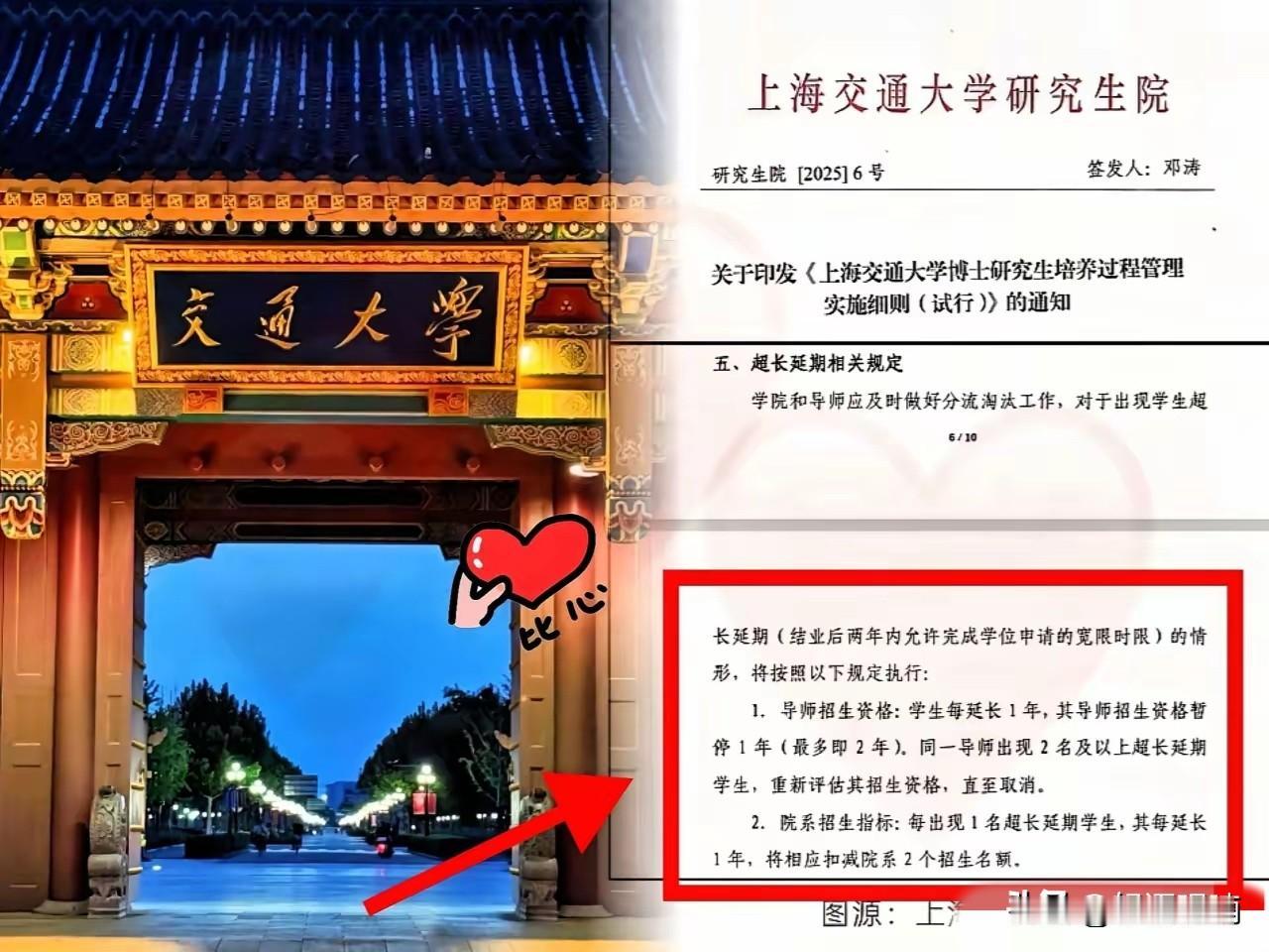 上海交大这一刀, 砍得太狠,也太准! 把学生延毕跟导师的“饭碗”直接绑死。 这就对了,以前那些把博士生当私人财产、当廉价劳动力的“老板”们,这下该彻底慌了。 想想都心酸,几年前见个博士朋友,三十好几的大男人,几杯酒下肚哭得像个孩子。 他是直博第五年,本该毕业的年纪,却连论文初稿都没敢提交。导师手里握着好几个横向课题,从他入学起,就没怎么指导过学术,反而把项目里的实验数据整理、报告撰写全推给了他。每天泡在实验室十几个小时,周末和法定节假日从没休息过,可自己的研究方向,导师连问都没问过两次。 他不是没想过反抗,可导师攥着毕业的“生杀大权”,换导师要提交翔实证据,研究生院大多劝和,真要闹僵,延毕只会更久。每月到手的补贴刚够房租和吃饭,同龄的同学早就工作成家,他却还在为一张毕业证苦苦煎熬,连谈恋爱都没底气。 这种情况不是个例,上海交大之前就有女博士生实名举报教授学术霸凌,实验室里几乎每个博士都被拖到八九年才毕业,还被哄骗威逼干私活。很多高校里,“学术包工头”并不少见,导师靠名声申请课题,学生变成廉价劳动力,负责繁琐的基础性工作,独立思考根本不被提倡。 上海交大的新规算是戳中了要害,按照学校研究生院的文件,博士生超长延毕(结业后两年内仍未完成学位申请),导师每多一个这样的学生,招生资格就暂停一年,最多能停两年。要是同一导师有两名及以上超长延毕学生,招生资格得重新评估,严重的直接取消。 更关键的是,学生延毕还会影响院系招生指标,每出现一名超长延毕学生,院系每年要被扣减2个招生名额。这一下就把导师和学生的利益绑在了一起,以前是学生着急毕业,导师无所谓,现在导师得主动盯着学生的进度,毕竟没人愿意拿自己的招生资格冒险。 以前很多导师觉得,学生多干几年就能多产出成果,多帮自己完成项目,根本不管学生的时间成本。要知道现在博士生数量翻倍,就业岗位却没跟着涨,延毕一年,就业竞争力就降一分,很多单位招聘都明确“按规定学制内完成者优先”。 新规出台后,那些只想着用学生干活的导师真的慌了。他们开始主动和学生沟通论文进展,提供必要的学术指导,甚至会动用自己的资源帮学生完善研究。毕竟没人愿意因为学生延毕,让自己的招生资格被暂停,这可是导师的核心利益。 我的那位博士朋友,虽然没能赶上这波新规,但听到消息时还是红了眼。他说要是当年有这样的政策,自己不至于耗那么多年,青春里最宝贵的时光,不该浪费在无意义的重复劳动里。 学术的本质是传承和创新,不是老板和打工仔的雇佣关系。导师的职责是教书育人,不是把学生当成牟取利益的工具。上海交大这一刀,砍断了畸形的师生利益链,也让学术回归了本来的样子。 各位读者你们怎么看?欢迎在评论区讨论。