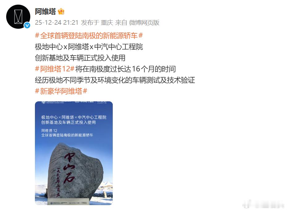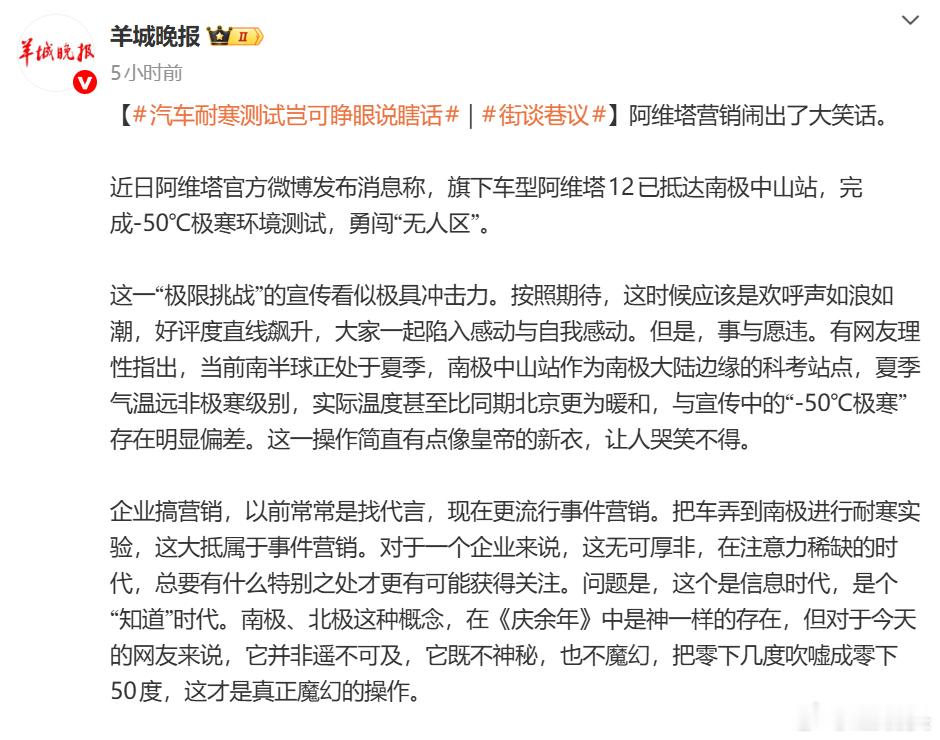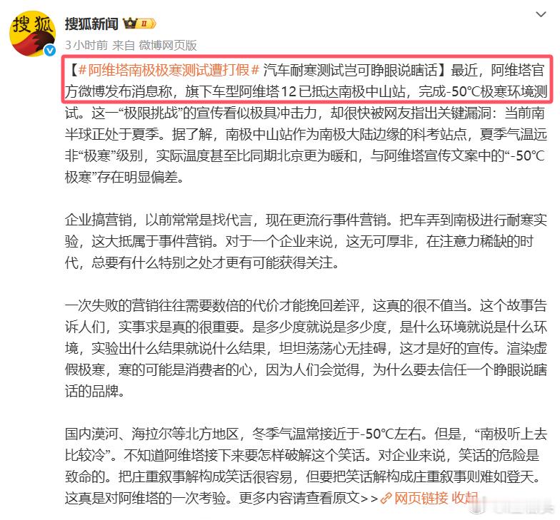有必要解释一下。我在21:46分发了一条南极中山站测试的内容,没有提品牌,浏览量2780。刚刚(图一)这条内容招致成规模的谩骂攻击,内容我已经删了,求饶。这个信息我确实是有误解,我向品牌方道歉,因为我发布的信息源头来自搜狐和羊城晚报,没有查看官方在21:21分(图四)发布的说明。一方面是媒体报道的信息有误解,另一方面是阿维塔品牌方没有解释清楚,所以给媒体造成了误解,最终形成了类似谣言的传播。事实上阿维塔官方已经在21:21分作出了辟谣,官方称阿维塔12将在南极度过长达16个月的时间,所以在夏季的时候,阿维塔12在南极中山站确实会经历-50℃极寒环境测试。不信谣不传谣,第一时间辟谣,求饶,求饶。阿维塔官方回应南极之旅争议中国新能源汽车将进行16个月极地测试