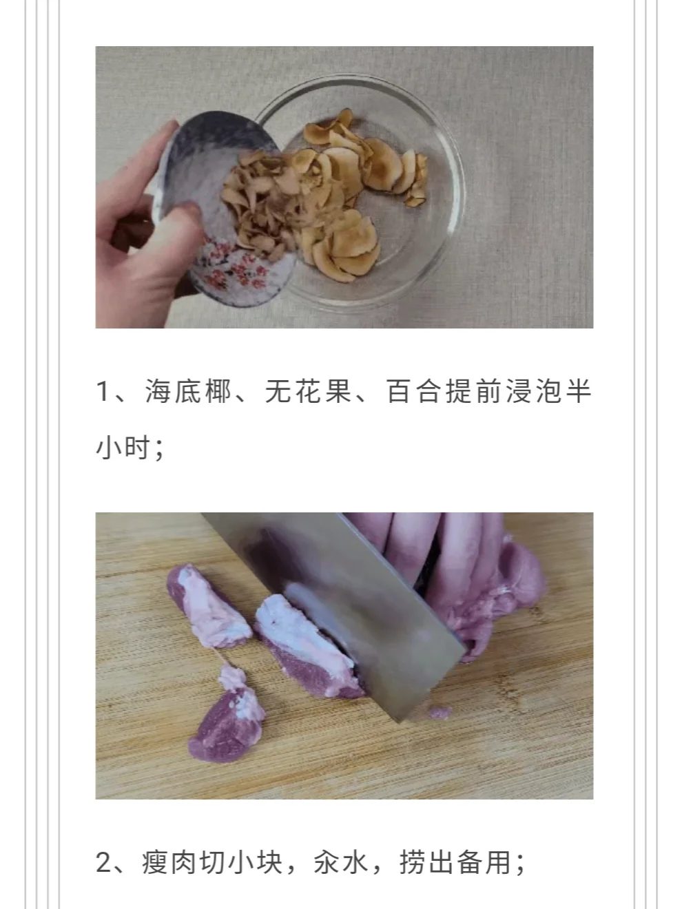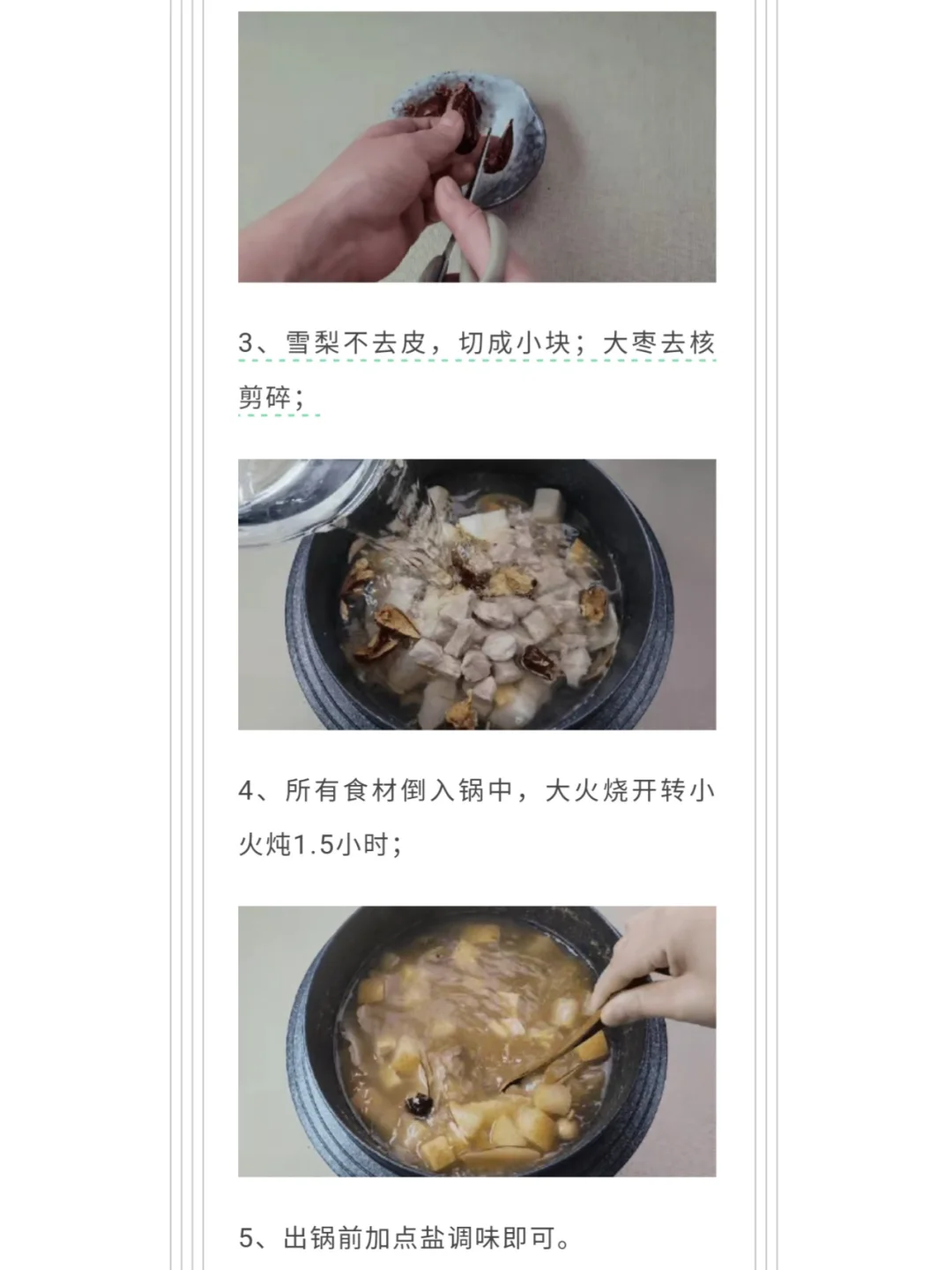 最近感冒的孩子又多了起来,而咳嗽作为感冒的一个明显的症状,也是令家长们手足无措,是食疗还是吃药?用不用打点滴?如果您的孩子症状较轻,您又懂得些中医知识,不妨试试用食疗的方法解决。 ✔️今天为大家提供一个润肺止咳的汤饮,随餐做给孩子喝,美味、饱腹又能缓解咳嗽,不过这道汤偏于凉润,更适合阴虚内热的孩子,或者是发烧过后,余热未解,依旧咳嗽不爽,痰黄黏稠,口渴咽痛,舌红,嘴唇红,苔薄白或薄黄而干的孩子。 [清单R]原料:雪梨1个、瘦肉200g、海底椰15g、无花果5颗、百合10g、大枣2枚、生姜适量 做法如上图 这道汤味道清甜,入口柔润,既能滋阴润燥,又能润肺止咳,在孩子咳嗽不断,又有些热证的时候,大家可以煲些来喝作为辅助调理。 罗大伦 孩子咳嗽 感冒咳嗽 润肺止咳 育儿 儿童食疗 阴虚内热 海底椰