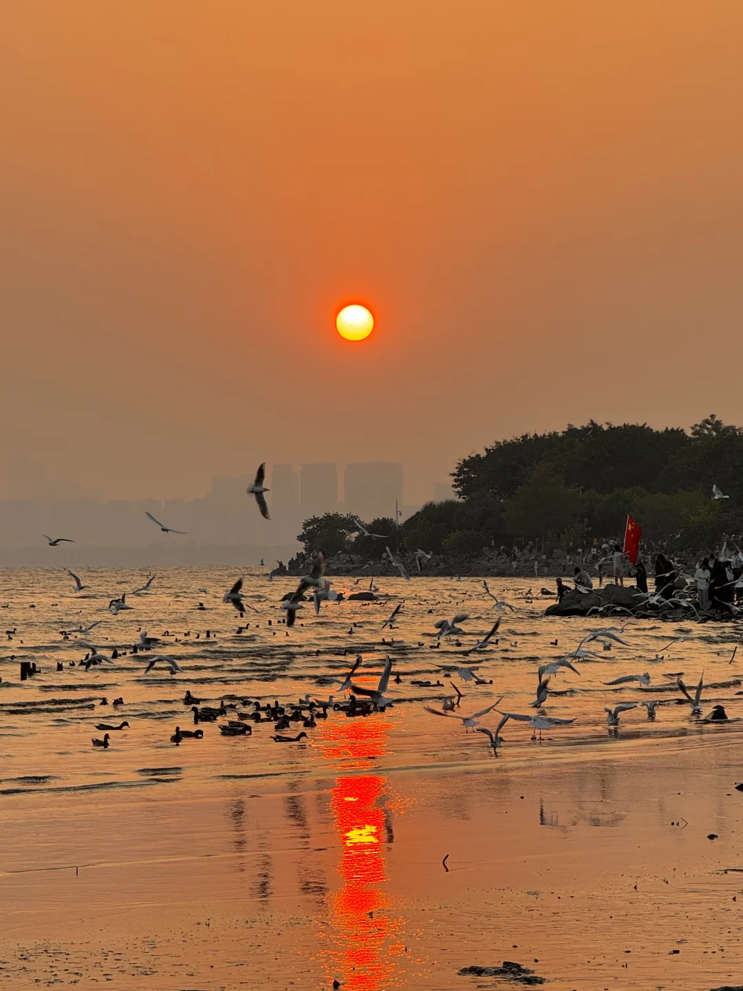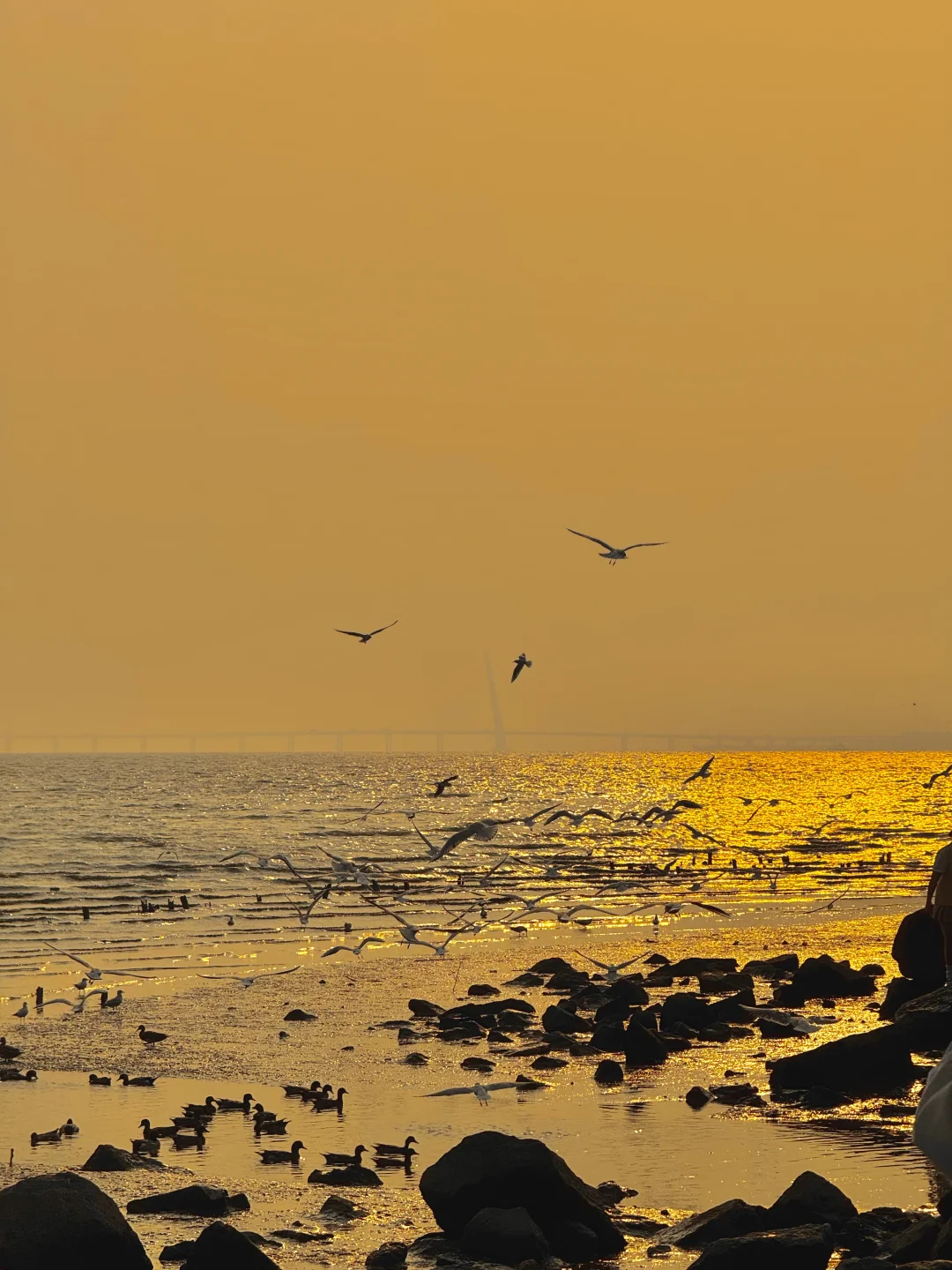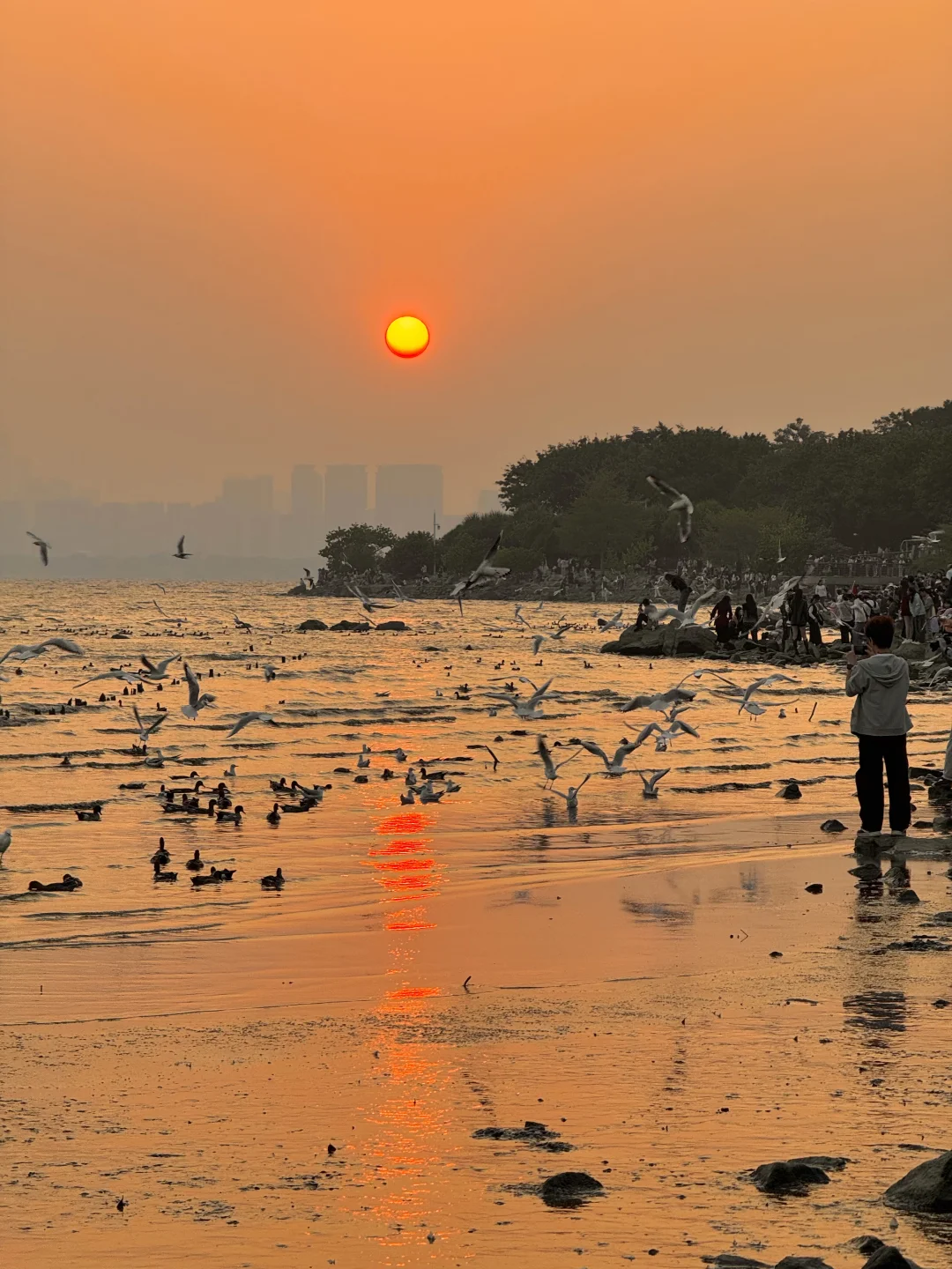 ✅冬天的海鸥✅橘色的海✅发光的夕阳✅还有朦胧中若隐若现的“春笋”大厦…