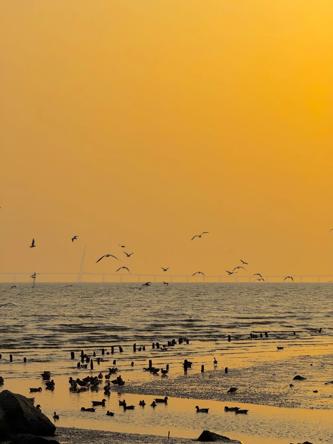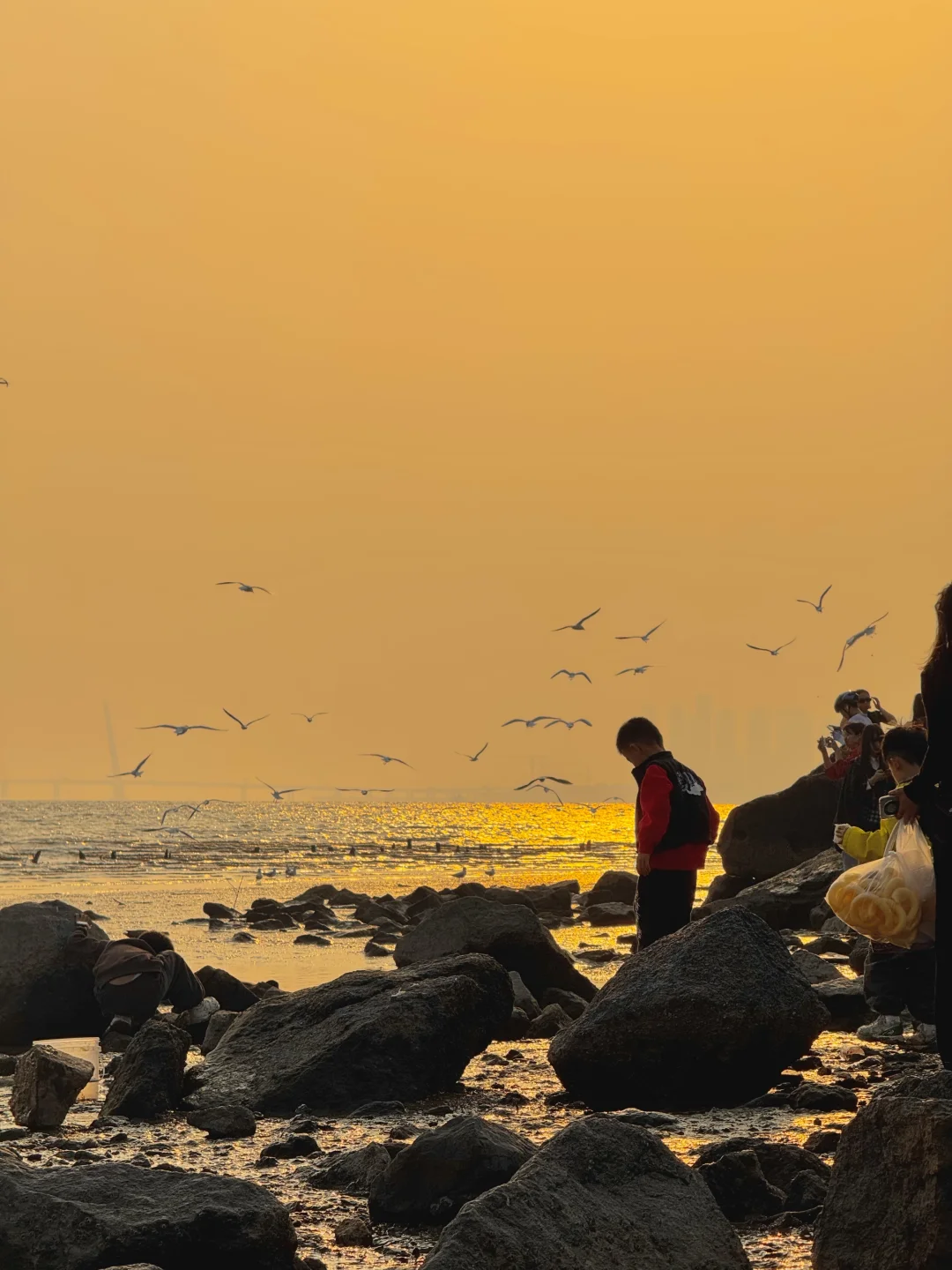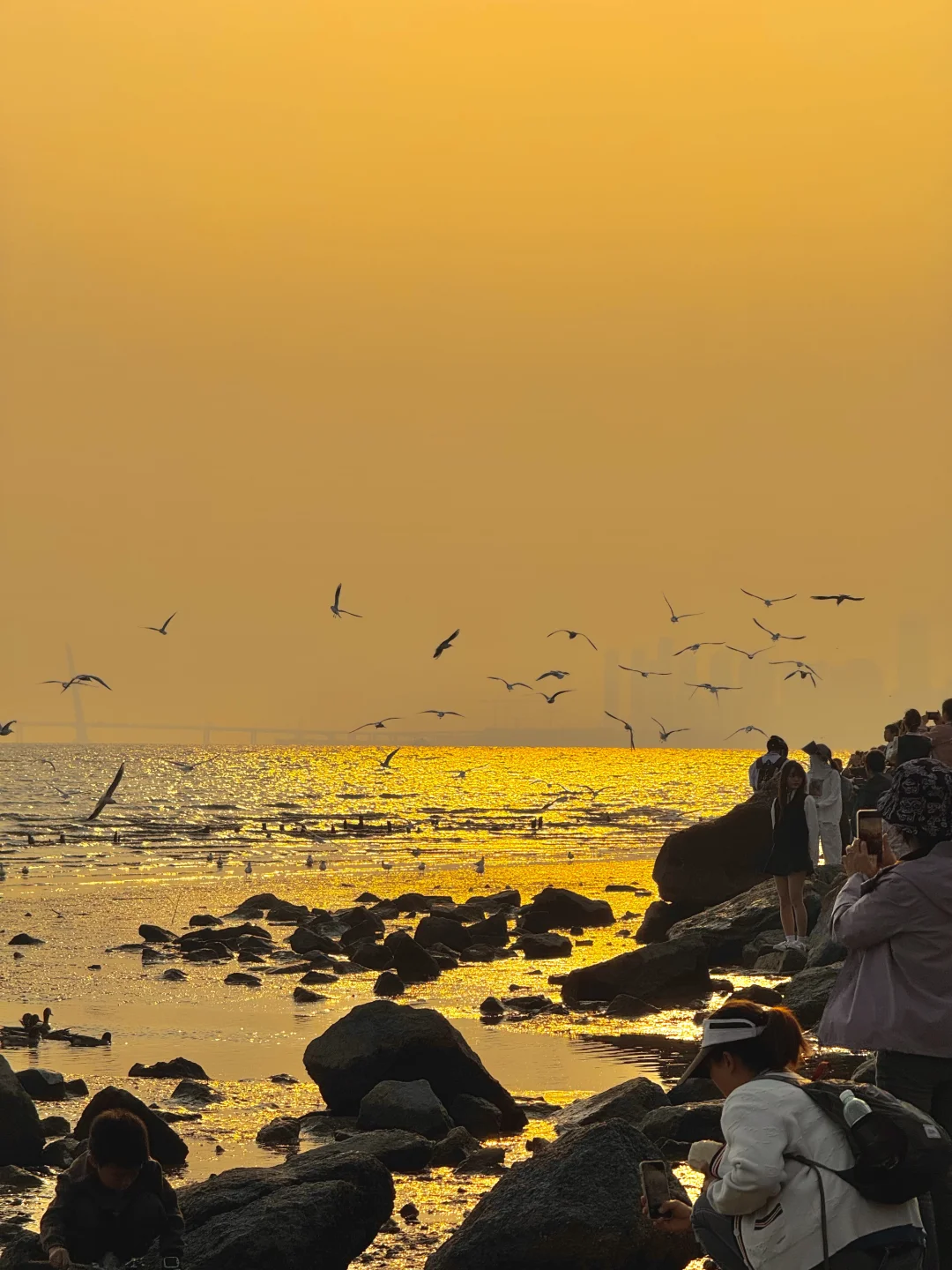 ✅冬天的海鸥✅橘色的海✅发光的夕阳✅还有朦胧中若隐若现的“春笋”大厦…