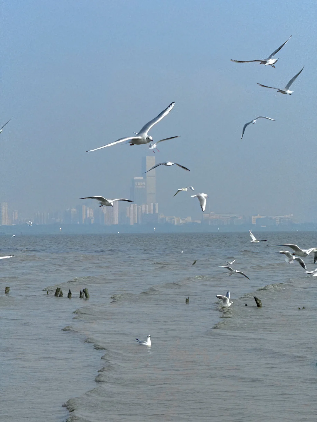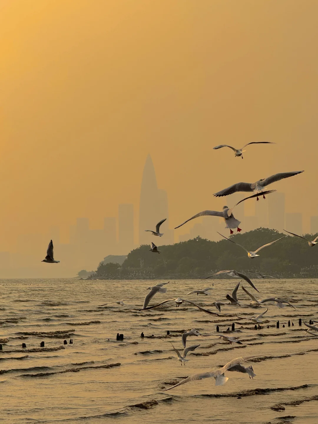 冬日的清冷为天空蒙上柔光滤镜☀️☀️成千上万只海鸥如约而至,夕阳把海面揉碎成金箔,远处“春笋”大厦的轮廓在暮色里忽明忽暗🌇像一首未写完的诗。