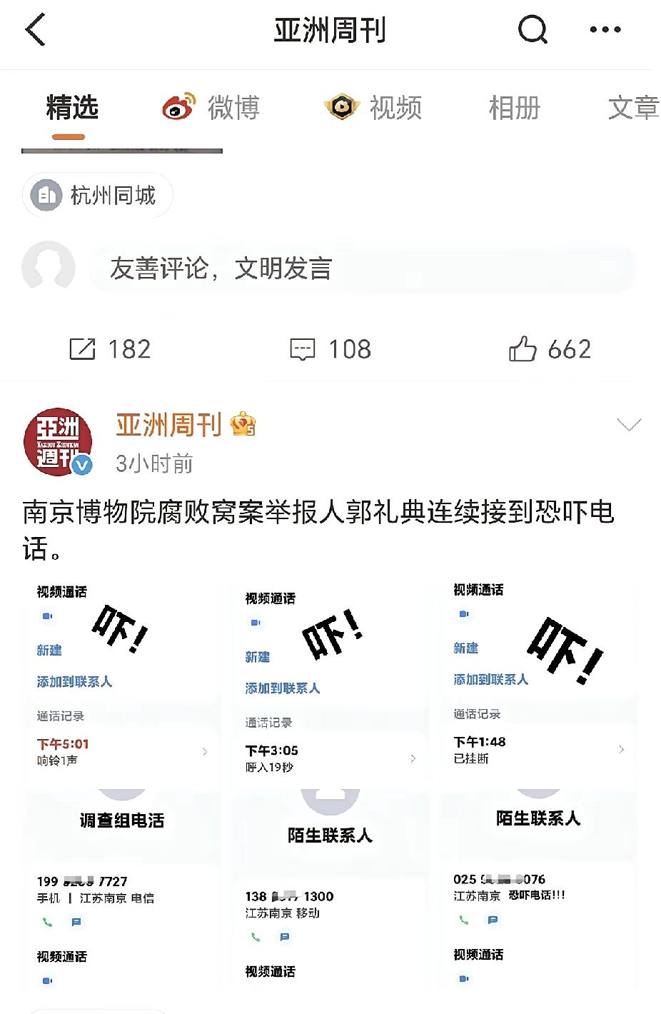 亚洲周刊又爆大料! “南京博物院腐败窝案举报人郭礼典连续接到恐吓电话。 ” 看来郭老的行为,真正刺痛了某些人。也希望通过此次南博事件,能将一些严重违法之人绳之以法,不然一旦失去公信力,就是另一个红十字会了。 郭老为代表的人能站出来,真的需要勇气的,值得保护。 大家对此怎么看?