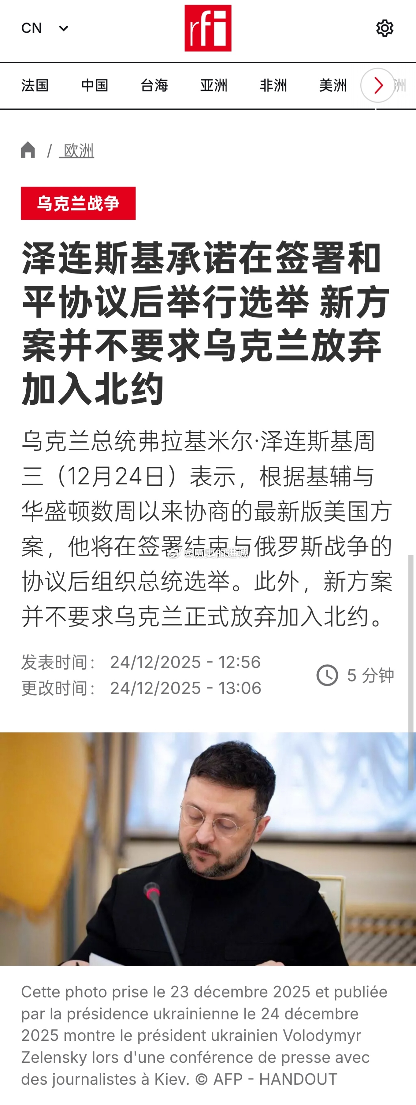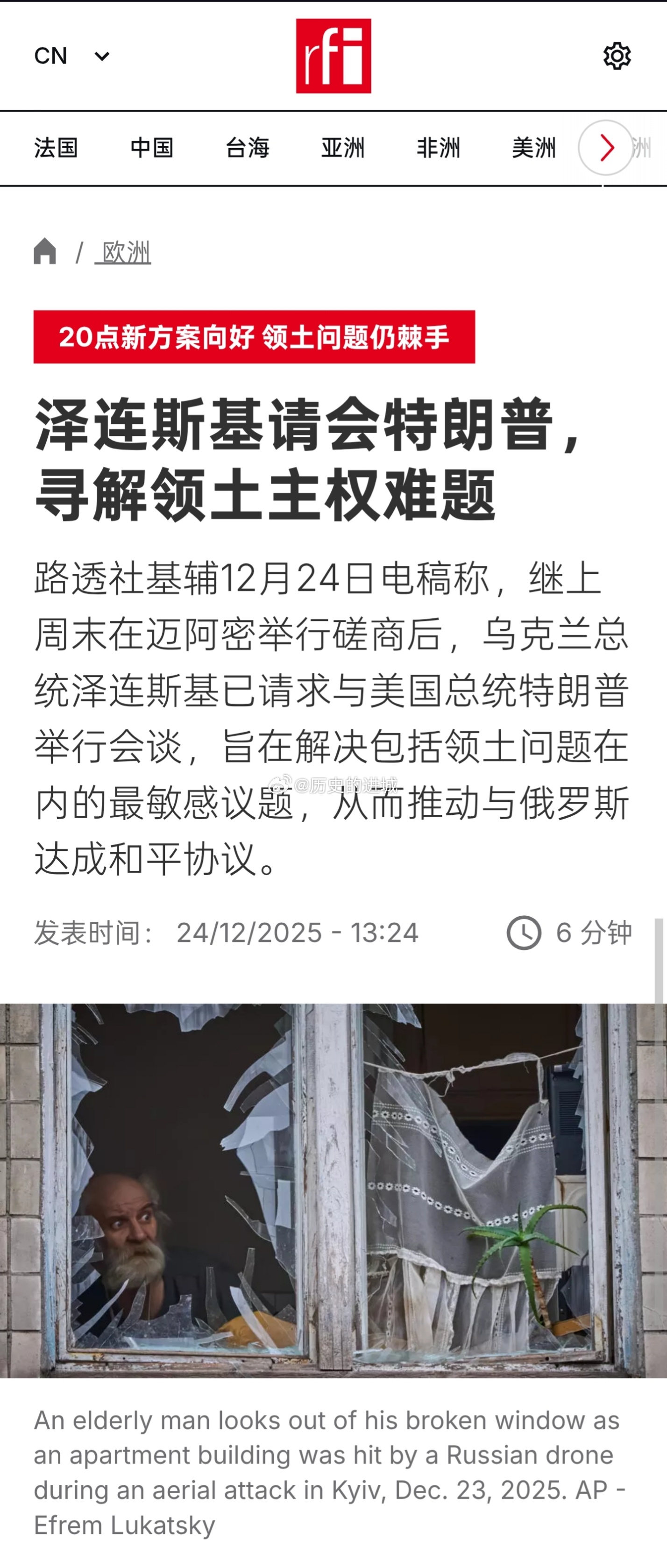 继上周末在迈阿密举行磋商后,乌克兰总统泽连斯基已请求与美国总统特朗普举行会谈,旨在解决包括领土问题在内的最敏感议题,从而推动与俄罗斯达成和平协议。泽连斯基周三(12月24日)表示,根据基辅与华盛顿数周以来协商的最新版美国方案,他将在签署结束与俄罗斯战争的协议后组织总统选举。此外,新方案并不要求乌克兰正式放弃加入北约。