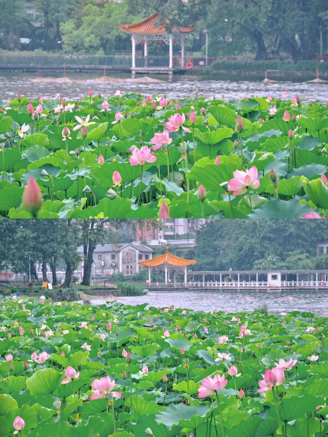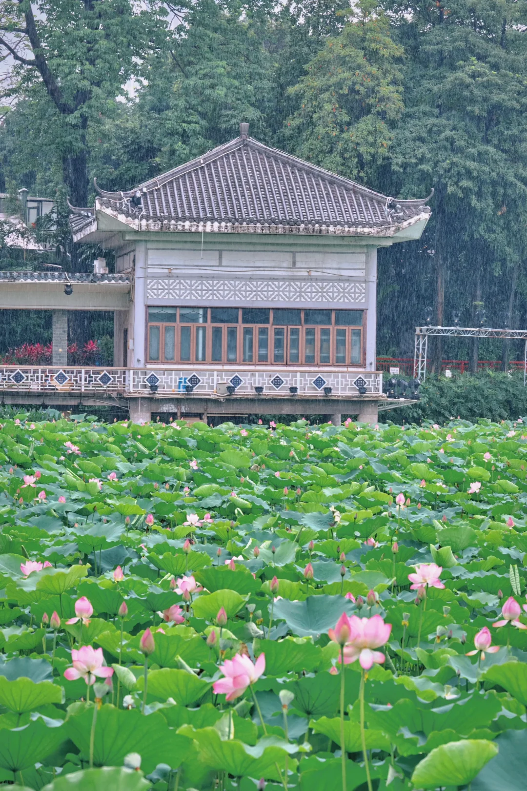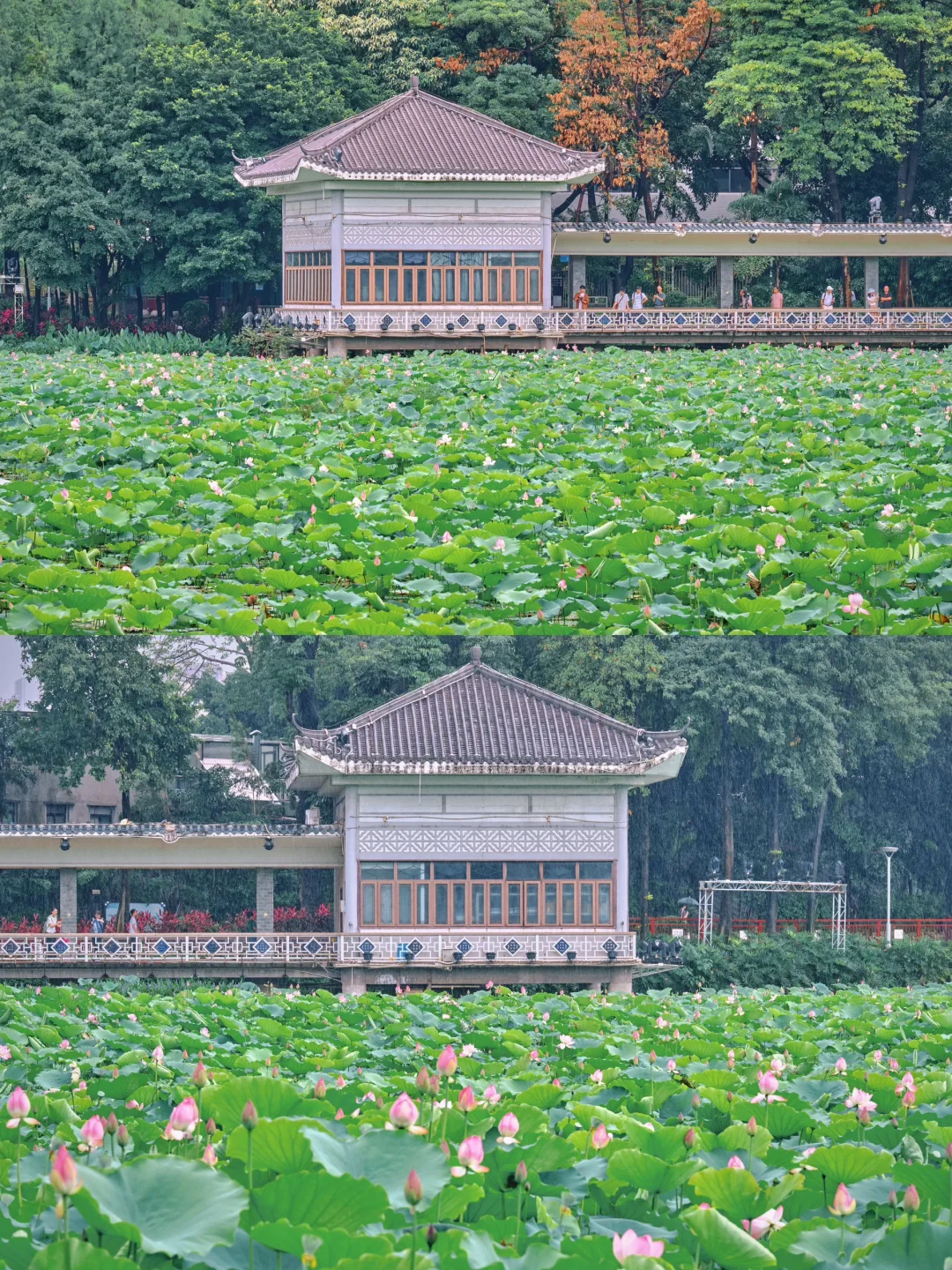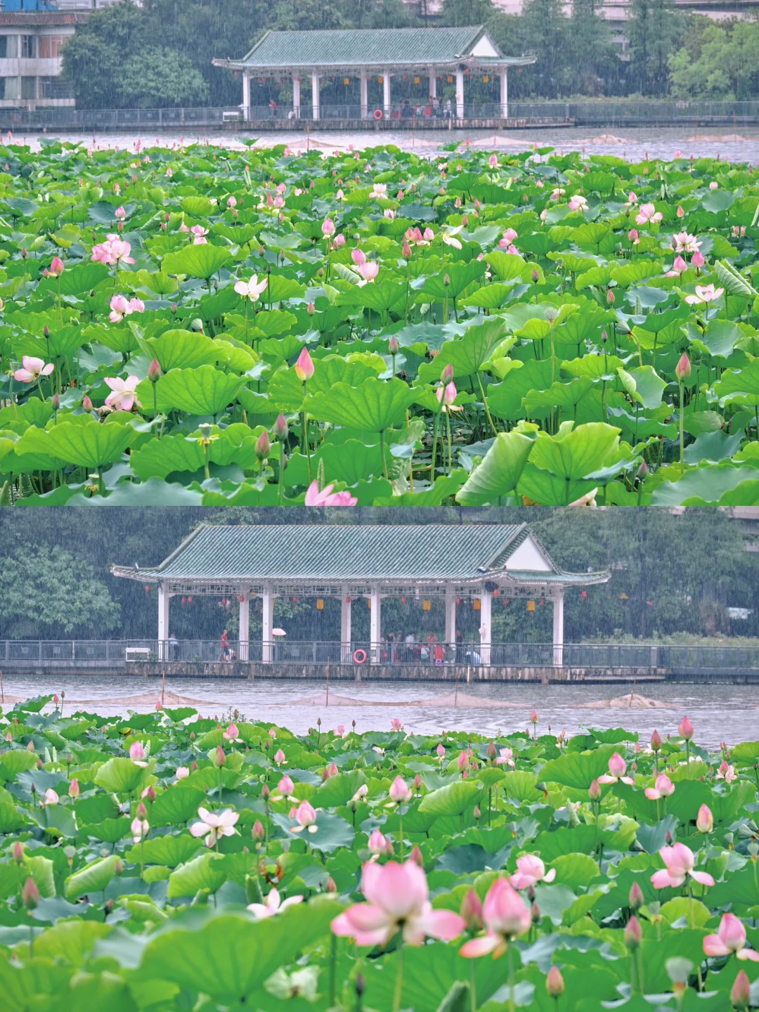 突然一场大雨🌧️🌧️这里仿佛被蒙上一层薄纱🌁远处的岭南亭台若隐若现,荷叶在风中翻涌成浪,恰似古人笔下“多少楼台烟雨中”的朦胧诗意🌫️🌫️
