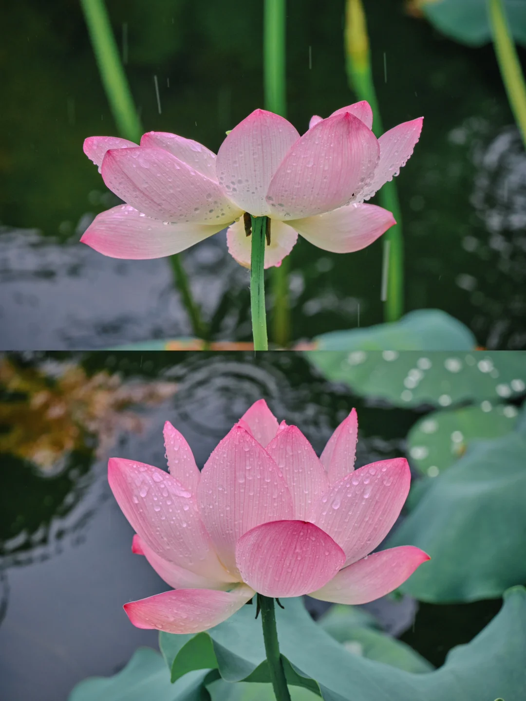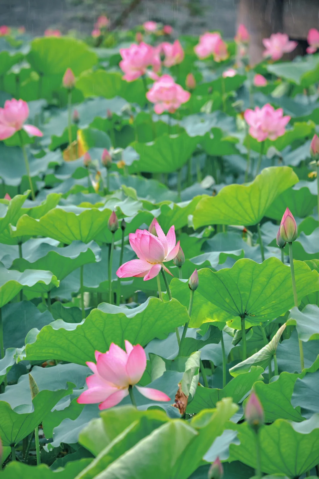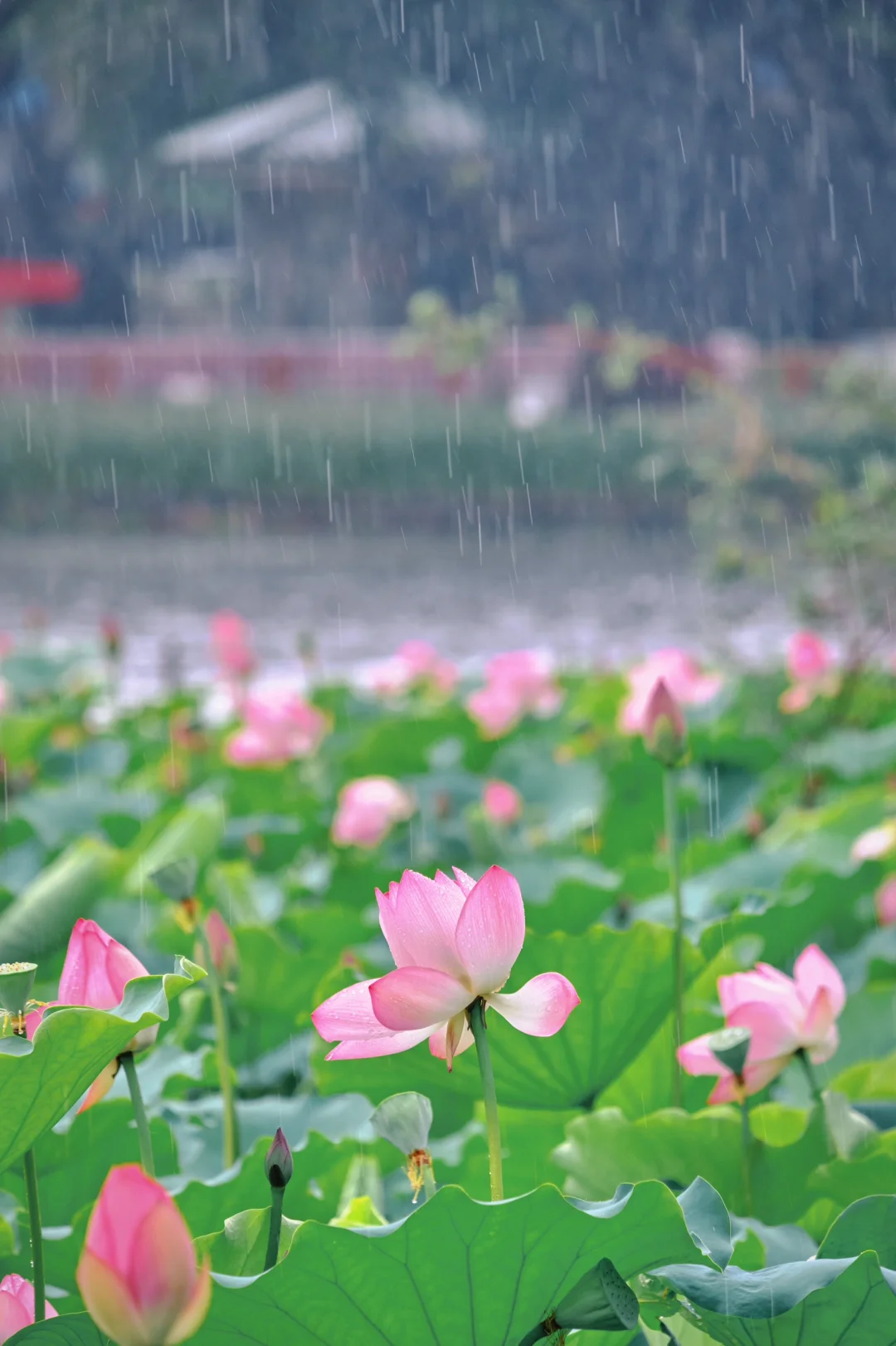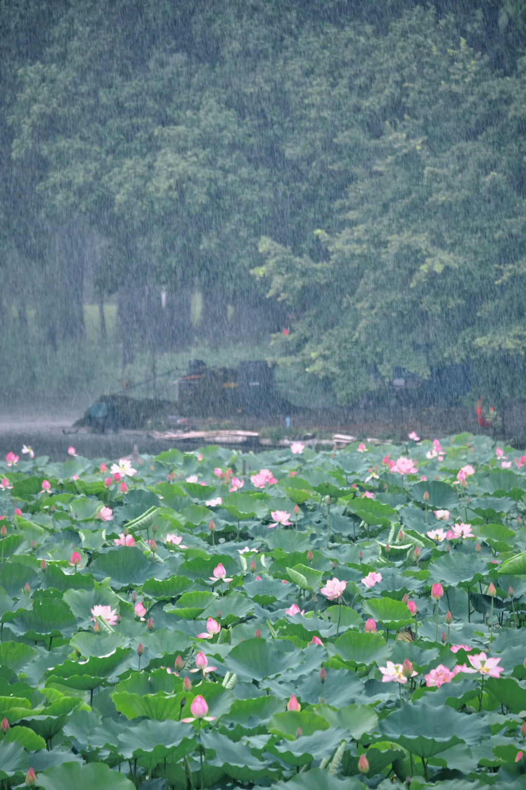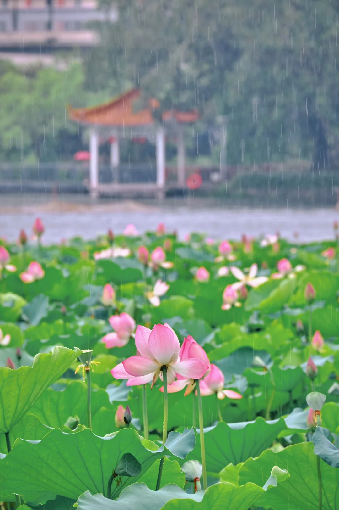 突然一场大雨🌧️🌧️这里仿佛被蒙上一层薄纱🌁远处的岭南亭台若隐若现,荷叶在风中翻涌成浪,恰似古人笔下“多少楼台烟雨中”的朦胧诗意🌫️🌫️