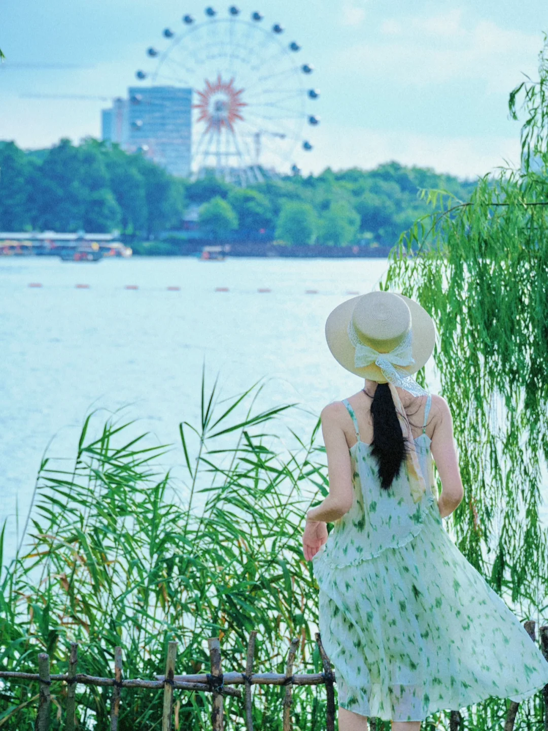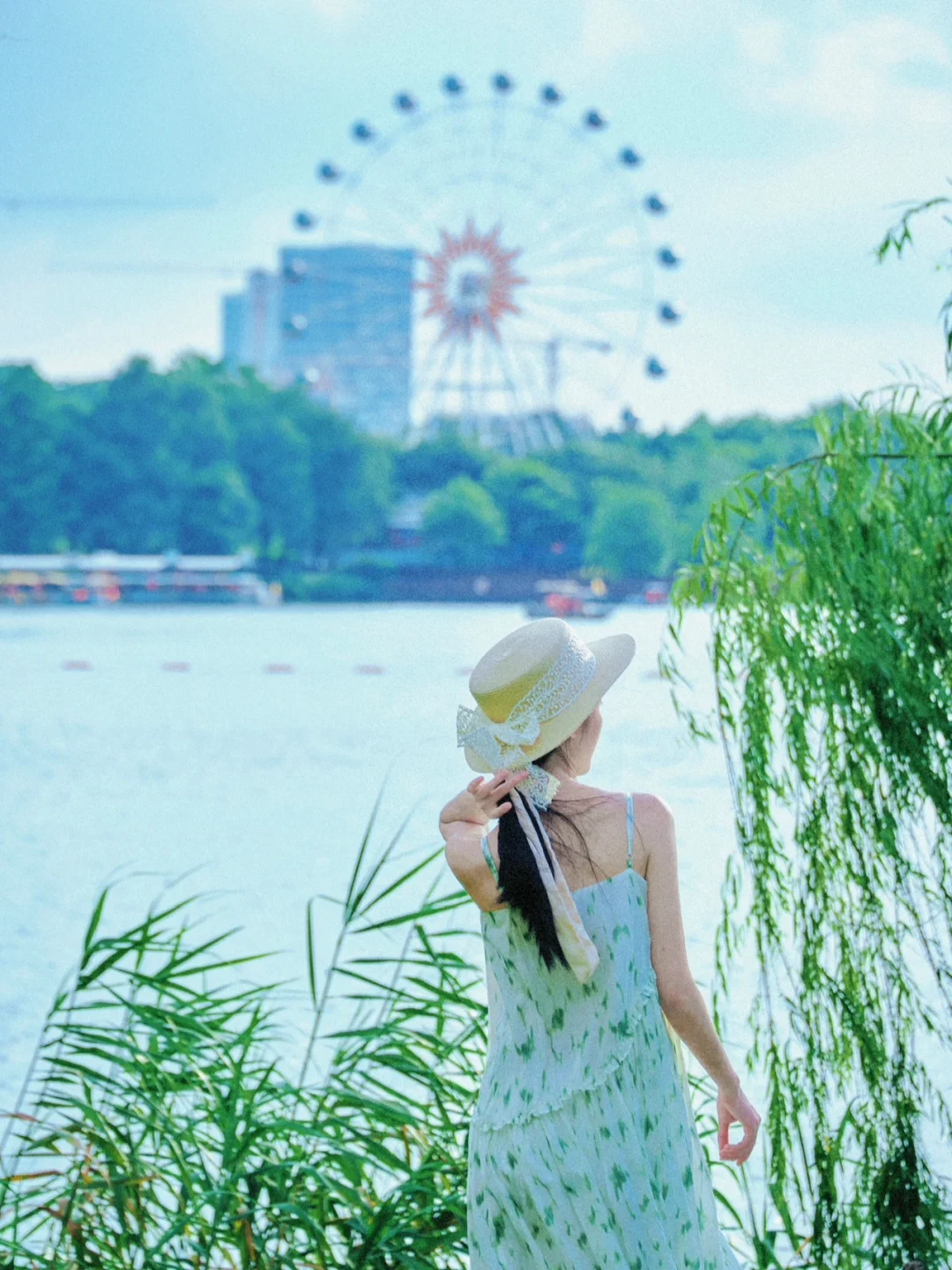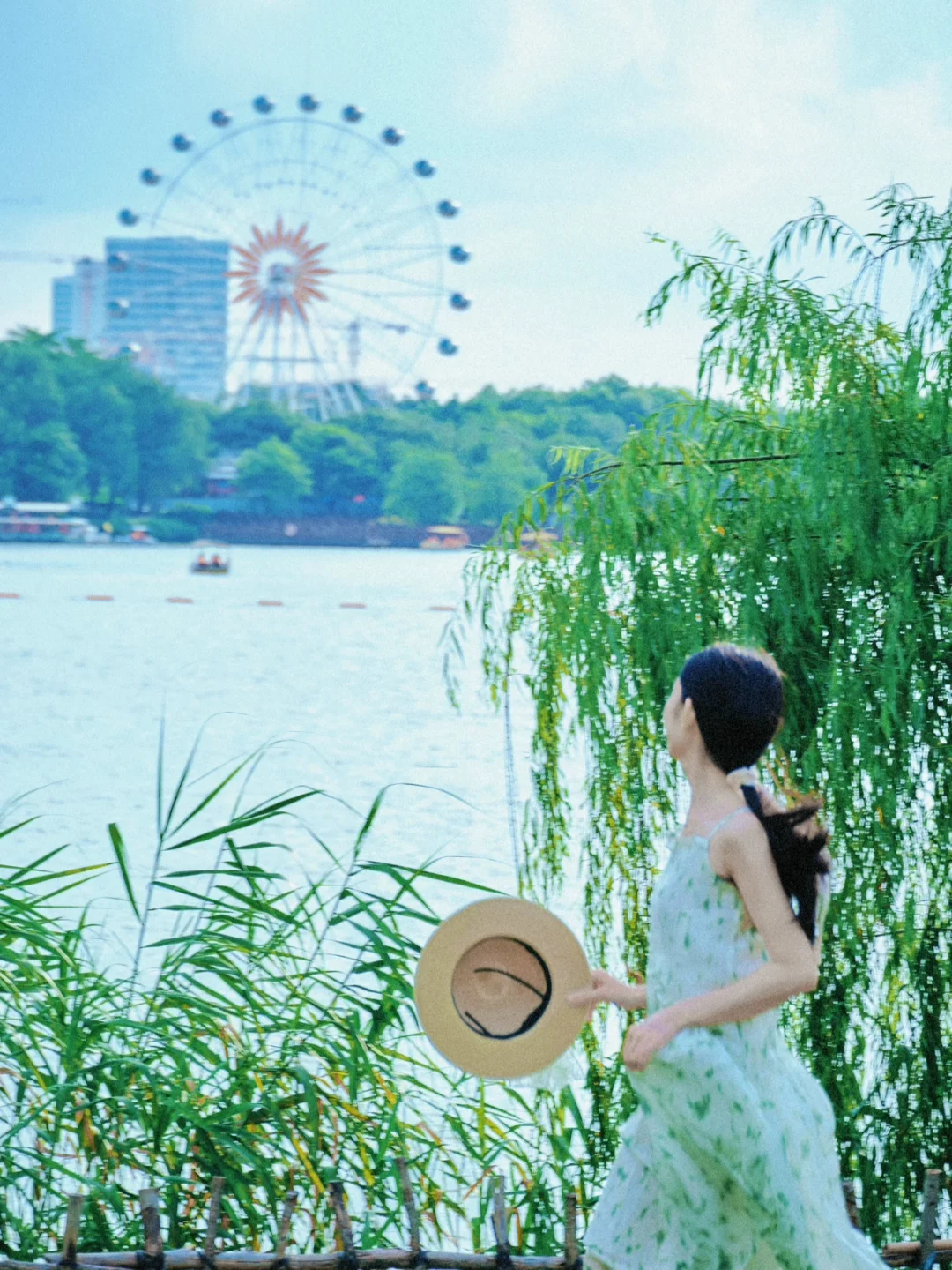 湖水映照着摩天轮以及岸上的柳树,营造出一种宁静如画的氛围。