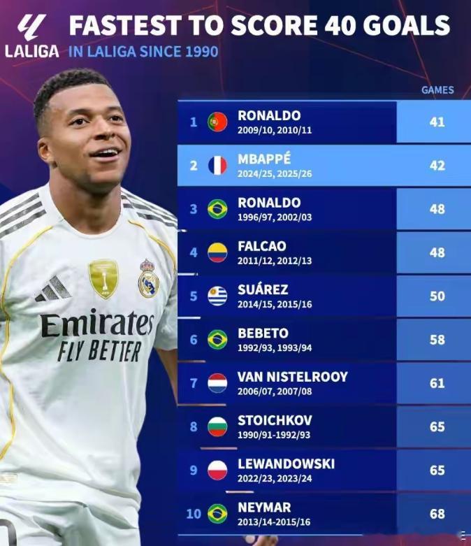 西甲历史最快40球十大排行榜:1、第一位:C罗(41场,40球)2、第二位:姆巴佩(42场,40球)3、第三位:罗纳尔多(48场,40球)4、第四位:法尔考(48场,40球)5、第五位:苏亚雷斯(50场,40球)6、第六位:贝贝托(58场,40球)7、第七位:范尼斯特鲁伊(61场,40球)8、第八位:斯托伊奇科夫(65场,40球)9、第九位:莱万多夫斯基(65场,40球)0、第十位:内马尔(68场,40球)西甲西甲锋王西甲最佳射手