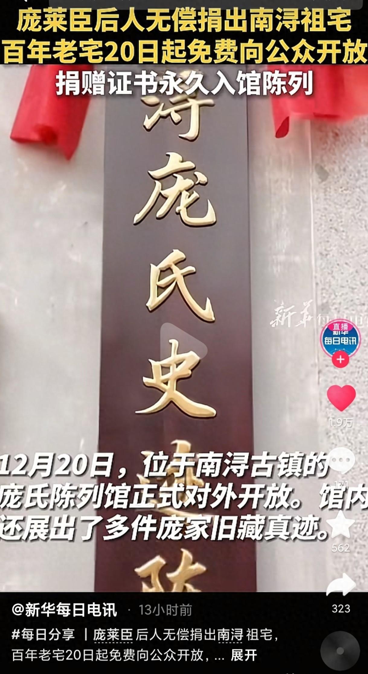 浙江省湖州市南浔区东大街有一处清朝同治年间建的老房子,今年12月20号刚改成“南浔庞氏史迹陈列馆”。这房子原属于庞莱臣家族,占地4700平方米,2011年被定为文保单位,2013年开始修缮,庞家后人一直没收钱。 庞莱臣的曾孙女庞叔令去年回去看过修缮情况,后来还参意见怎么布置展馆。庞家老爷子当年是当地富翁,儿子庞莱臣开过缫丝厂和纱厂,后来痴迷收藏古书画。现在展览馆里摆着庞家过去的藏品和族谱,西边厢房装修很讲究,是庞莱臣以前住的地方。 听说馆里还有些没公开的老物件,不知道什么时候能对外展出。庞家主动把房子捐给政府,这事在地方上挺少见的。