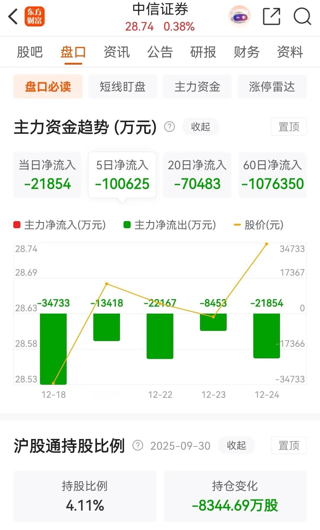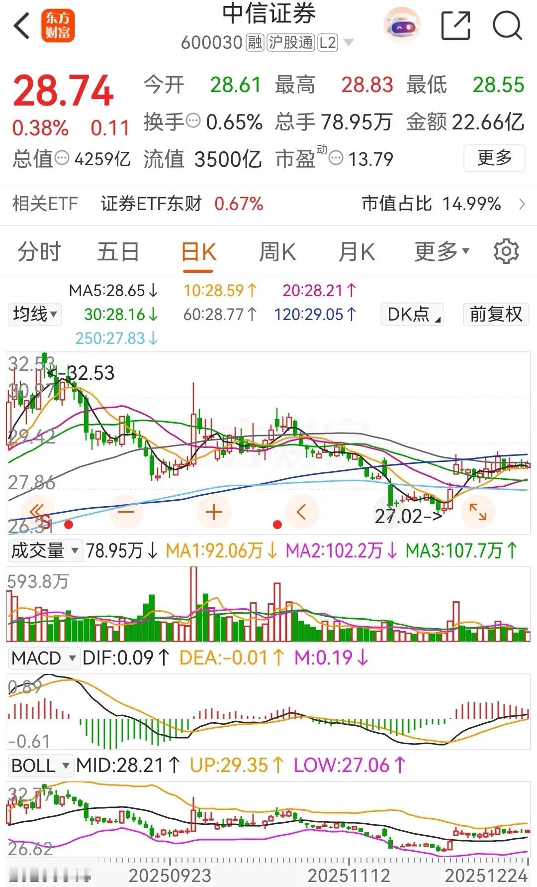 东方财富和中信证券今天低开高走,分别上涨了0.78%和0.78%,其中东财被主力