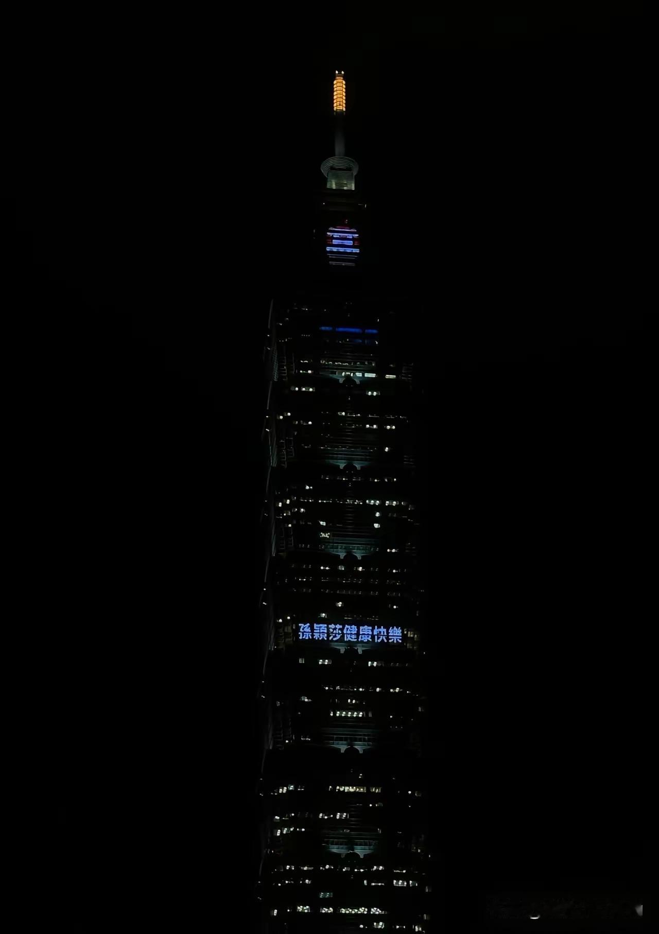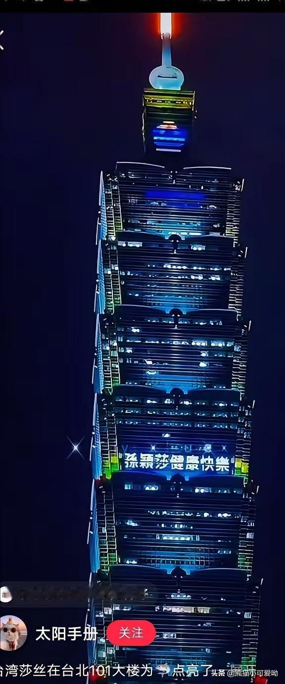 一觉醒来,发现台湾球迷在平安夜,把自己对莎莎的祝福高悬在101大厦:孙颖莎健康快乐。 101大厦,是台北的地标,与其说台湾球迷把自己对莎莎的平安祝福,点亮在最高处,不如说他们把自己对莎莎的深深关切和祝福,从心底从最深处掏出来,悬挂在最高处,让喜欢与诋毁莎莎的所有人都看到,他们对莎莎的祝福就是这么真诚,就是这么坚定,就是这么豪横。 莎莎,台湾球迷在平安夜对你的祝福,也道出了包括大陆在内千千万万个球迷的心声,大家在数九寒冬之夜的心是那么温暖,甚至那么滚烫,祝福你在新的一年健康、平安、快乐!