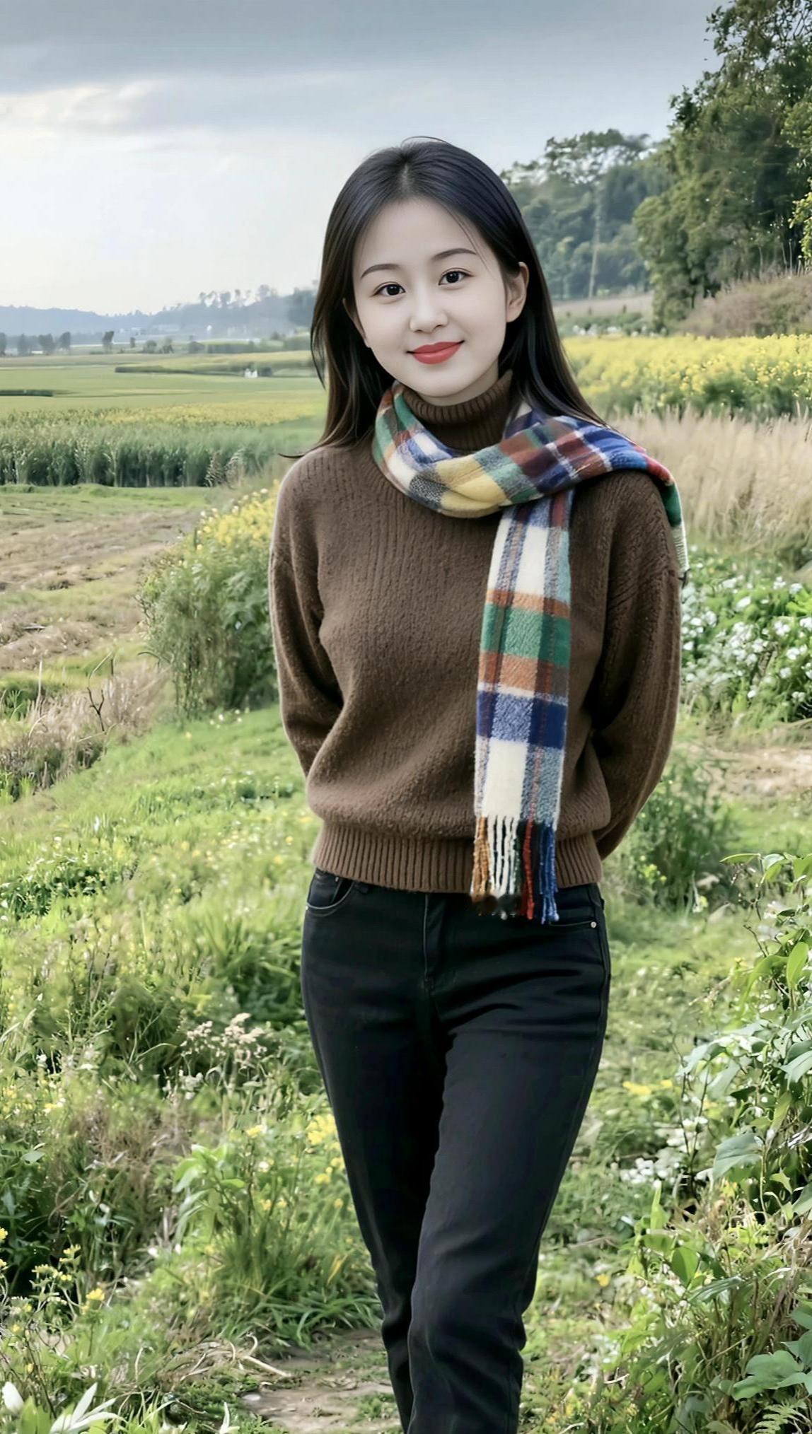 《古村倩影》古村石径覆晴光,倩女行吟向石梁。素袂轻扬凝晓日,蓝衫斜衬映秋
