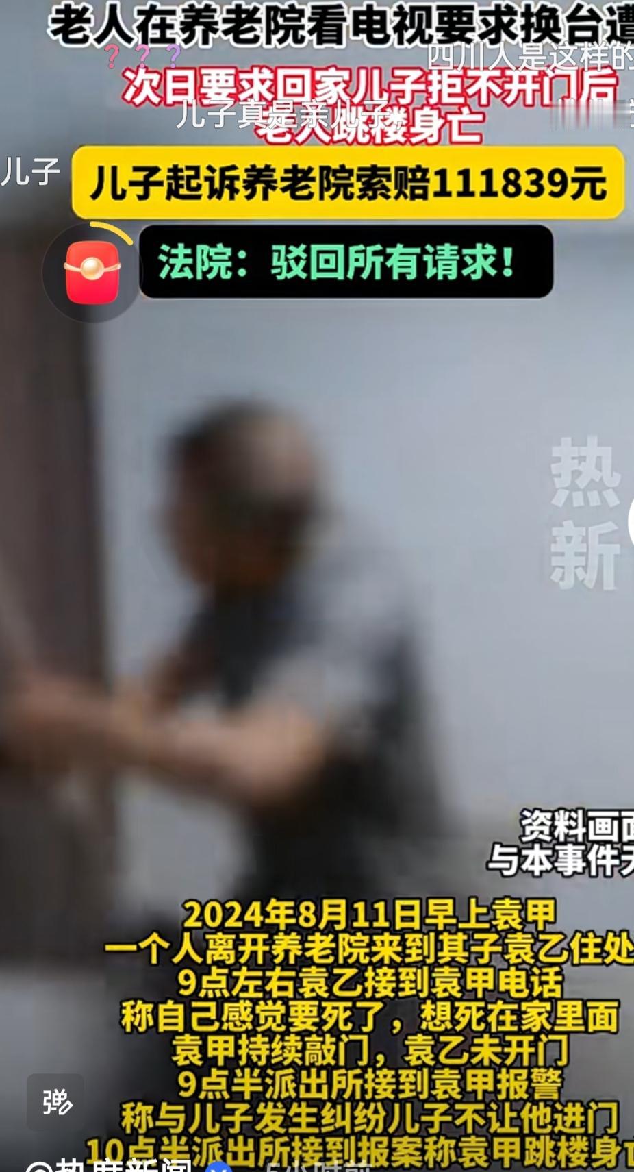 老人在养老院换台遭拒,回家后儿子不让进门,跳楼身亡,儿子索赔养老院十一万余元—— 这起事件发生在四川成都,袁大爷住进养老院后,悲剧由此上演: ● 养老院换台遭拒:2024年8月8日下午,养老院组织老人们在大厅吃饭并观看电视,袁大爷要求看奥运频道,但遭到工作人员拒绝,他感到自尊心受到伤害。袁大爷身患多种疾病且有抑郁症,因换台被拒心生不满,事后还多次流露轻生想法,不过其老伴未重视也未告知养老院其病情。 ● 回家儿子拒开门:袁大爷想回家,便独自离开养老院去找儿子,多次敲门都被儿子拒之门外。老人又急又气报了警,民警到场后只能劝他和儿子好好商量,可民警刚走,老人就选择了跳楼,当场身亡。 ● 儿子起诉索赔被驳回:事后儿子和相关人员将养老院告上法庭,索赔11万余元,声称袁大爷是由于被养老院工作人员拒绝换台受到“精神侮辱”才跳楼自杀,要求赔偿并道歉。然而法院审理后给出判决,驳回了该诉求,因为养老院根本没有做出辱骂、殴打、侮辱老人这类违法的事。实际上袁大爷抑郁症的根源是亲情淡漠、缺少关心,跳楼的直接原因是儿子不开门。