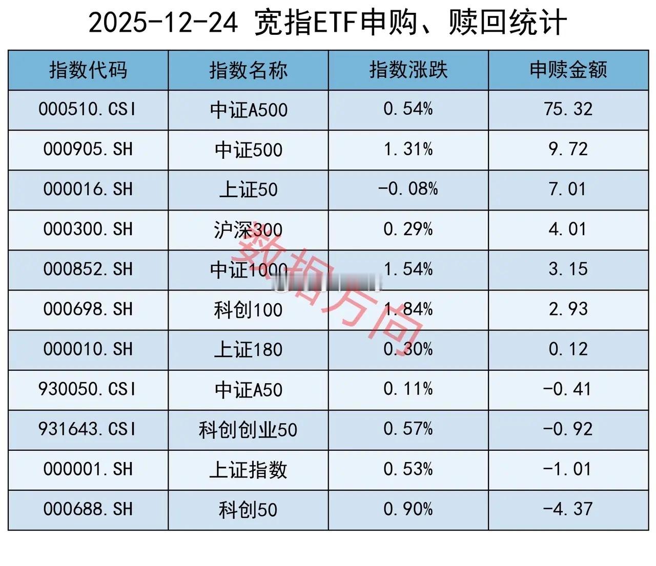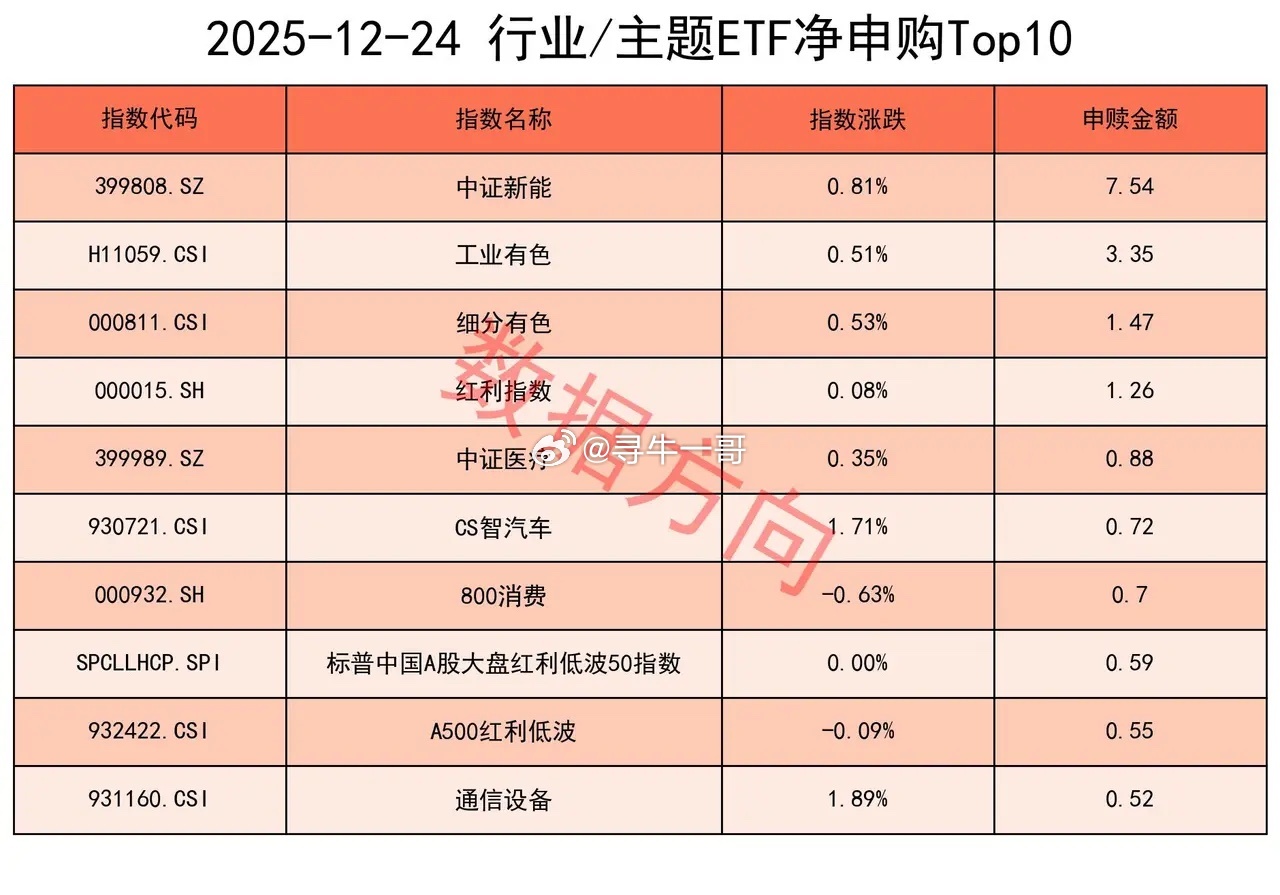 资金扫货中证A500!12月24日星期三,大盘震荡上行,行业、个股多数上涨,半导体、算力硬件涨幅居前。上证指数涨幅0.53%,上交所ETF合计净申购 65.67亿元。宽指中证A500指数(75.32亿),其一家,已经超过了大A全天的总净申购额。而且,近段时间获得持续、大幅净申购。中证500指数(9.72亿)、上证50指数(7.01亿),双双净申购超过5亿。沪深300指数(4.01亿)、中证1000指数(3.15亿)、科创100指数(2.93亿)、上证180指数(0.12亿),分别获得小幅净申购。科创50指数(-4.37亿)、上证指数(-1.01亿)、科创创业50指数(-0.92亿)、中证A50指数(-0.41亿),分别被小幅净赎回。行业和主题 工业有色指数(3.35亿)、细分有色指数(1.47亿),一起进入申购榜;红利指数(1.26亿)、标普中国A股大盘红利低波50指数(0.59亿)、A500红利低波指数(0.55亿),一起进入申购榜;其他进入申购榜的还有:中证新能指数(7.54亿)、中证医疗指数(0.88亿)、CS智汽车指数(0.72亿)、800消费指数(0.7亿)、通信设备指数(0.52亿)。科创芯片指数(-5.54亿)、半导体指数(-2.84亿),一起进入赎回榜。中证军工指数(-4.08亿)、中证国防指数(-2.13亿)、军工龙头指数(-2.05亿),一起进入赎回榜。证券公司指数(-3.67亿)、中证银行指数(-3.34亿),一起进入赎回榜。其他进入赎回榜的还有:光伏产业指数(-2.25亿)、科创AI指数(-2.16亿)、稀土产业指数(-1.86亿)。ETF