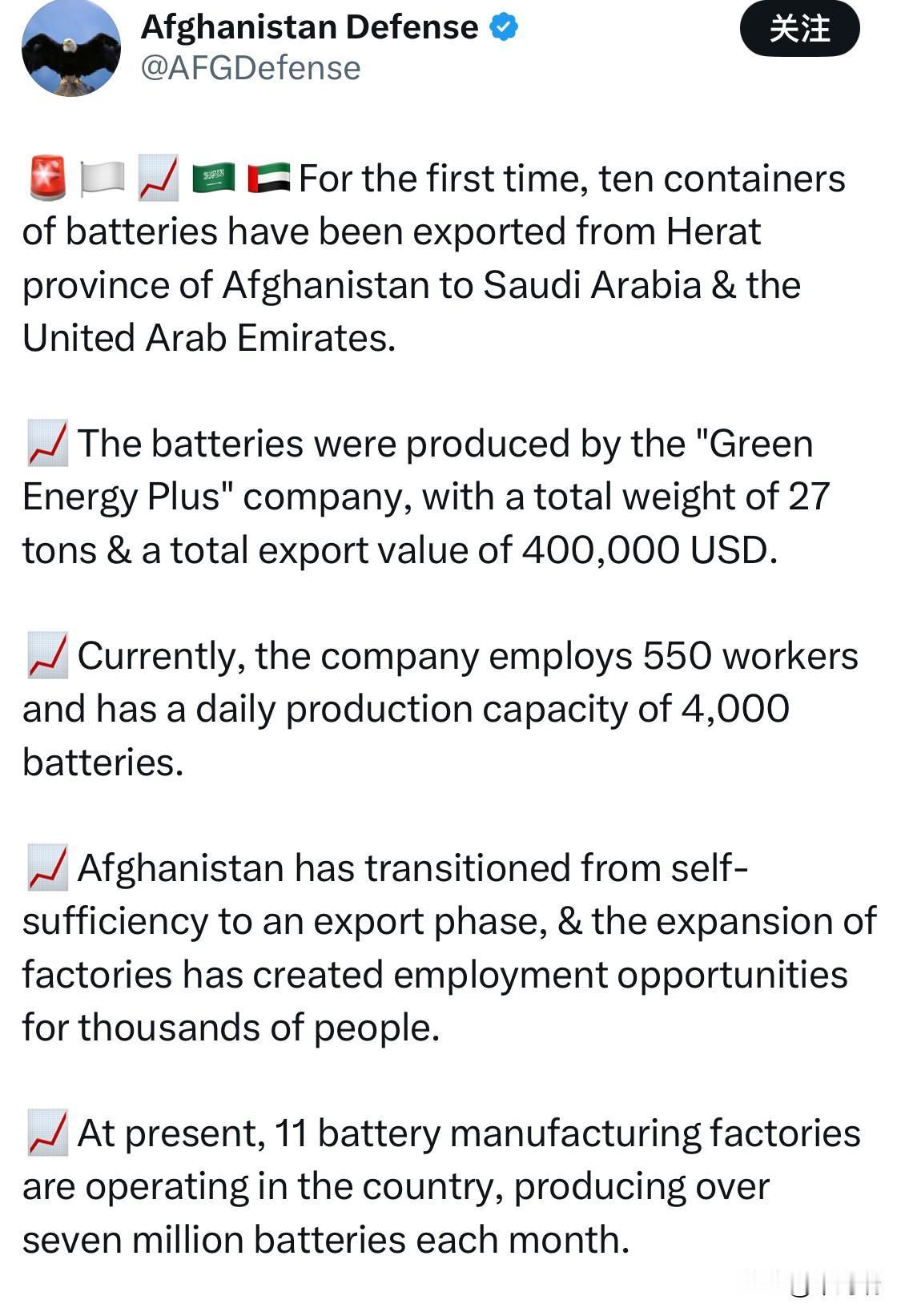 阿富汗赫拉特省首次向沙特阿拉伯和阿拉伯联合酋长国出口了十个集装箱的电池。 这些电池由“绿色能源+”公司生产,总重量为27吨,出口总价值为40万美元。 目前,该公司雇佣了 550 名工人,日产能为 4,000 块电池。 阿富汗已从自给自足阶段过渡到出口阶段,工厂的扩张为成千上万的人创造了就业机会。 目前,阿富汗全国共有 11 家电池制造厂,每月生产超过 700 万块电池。