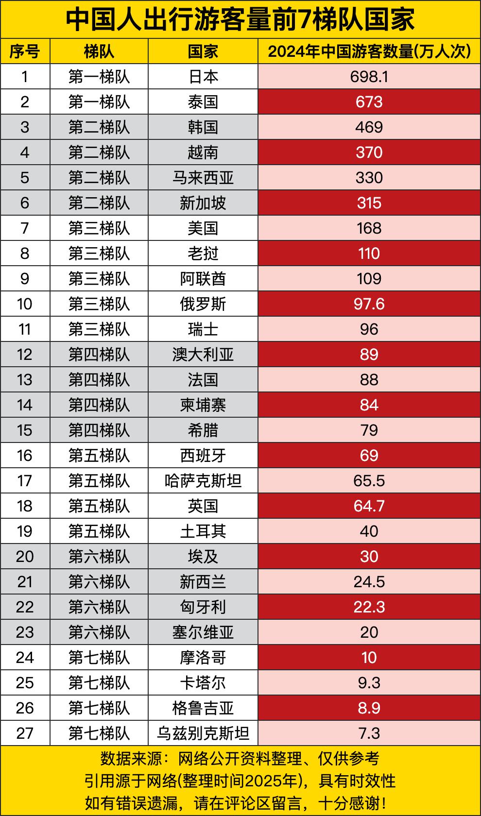 日本和泰国以接近700万人次的“战绩”,稳坐第一梯队,堪称国人海外游的“心头好双雄”。一个凭精致体验和购物吸引力,一个靠热带风情和高性价比,牢牢抓住了咱们的旅行箱。紧随其后的第二梯队,韩国、越南、马来西亚、新加坡,个个都是三百万人次以上的“热门打卡地”,它们共同构成了国人出境游的“核心朋友圈”,距离近、签证便、玩法熟,妥妥的“说走就走”首选区。 当目光投向第三、第四梯队,画风开始变得多元。美国、澳大利亚、法国等传统发达国家赫然在列,但游客量已降至百万级甚至几十万量级,看来长途飞行和较高的消费门槛,确实让它们成了“计划中的远方”。而阿联酋、俄罗斯、瑞士、希腊等特色鲜明的目的地,则以其独特的自然或人文景观,稳稳吸引着一批寻求差异体验的游客。一个有趣的信号是,老挝、柬埔寨、哈萨克斯坦等“一带一路”沿线伙伴国家,正逐渐进入更多中国游客的视野,或许预示着新的旅行风向。 榜单的后半段,更像是“小众宝藏挖掘清单”。从土耳其的浪漫热气球到埃及的古文明探秘,从新西兰的纯净中土世界到塞尔维亚的巴尔干风情,游客量在20万到70万之间。它们虽然不属于大众爆款,却凭借独特的魅力,赢得了特定圈层旅行者的偏爱。而摩洛哥、格鲁吉亚、乌兹别克斯坦等地,游客量虽不足十万,却如同一颗颗待打磨的珍珠,正等待着被更多旅行雷达发现。 总体来看,这份梯队图精准刻画了当下国人出境游的“心理距离”:地理上的近邻与文化上的亲近感,仍是选择目的地的首要因素;而更远的诗和远方,则需要更强的动力(如独特体验、直飞航线或免签政策)来跨越。它既反映了现实,也暗示了潜力——随着更多国家推出便利化措施,这张榜单的排名未来完全可能洗牌。毕竟,旅行者的好奇心永远在涌动,下一个爆款目的地,也许就藏在今天的第七梯队里。