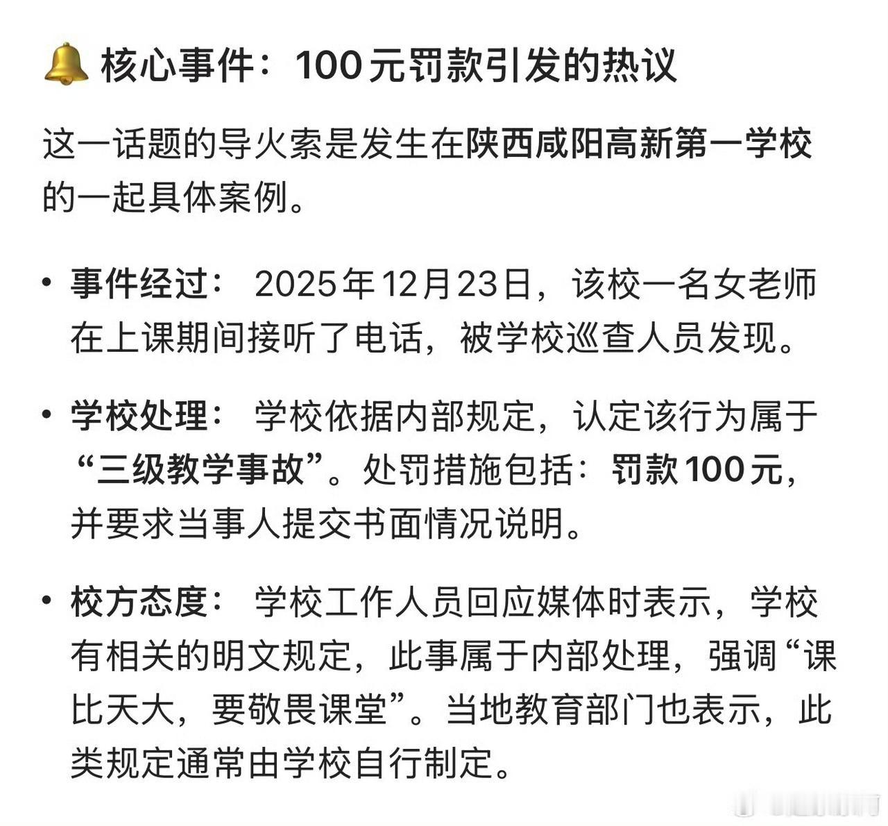 课比天大,老师上课打电话被罚100,被认定为三级教学事故! 陕西咸阳某小学教师在课堂巡查中被发现接打电话,校方依据内部《教学事故认定与处理办法》将这一行为定性为"三级教学事故",处以100元罚款并要求提交书面说明。 一般情况下,老师处于上课过程中,不接打个人电话是应当遵循的准则。不过,如果有学生有突发状况,且学生没有手机,那么老师怎么办?假设说,需要打急救电话,怎么办?跑回办公室?这应该也违反工作守则了。不打急救,学生出事了,那老师肯定有责任。 而且我始终觉得,老师也是人,每个人可能都会遇到有急事的时候,我相信老师上课的时候一般还是不会随便接电话的,这种要求真的过了。 虽然有规则,但我觉得有一些人性化的温度更好。校方强调课比天大,要敬畏课堂, 这个原则本身无可厚非,课堂是教学的核心阵地,教师的注意力本就该聚焦学生。 但问题在于,这个行为背后,是否存在特殊情况?是无关紧要的闲聊,还是家人突发疾病的紧急来电?