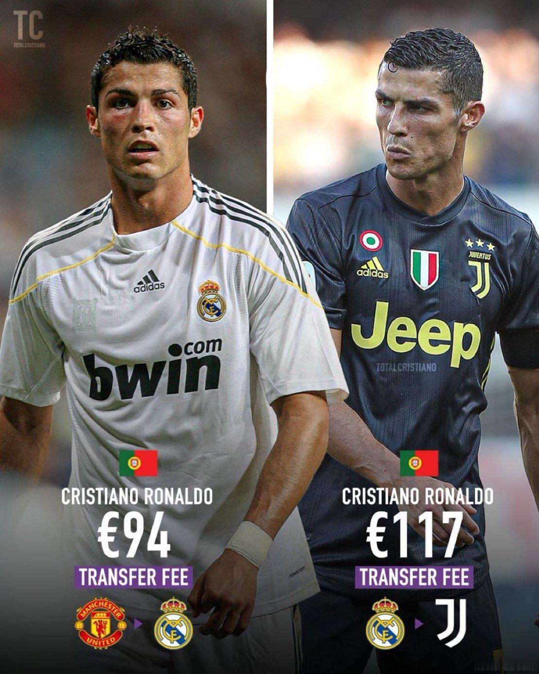 【回顾】皇马以9400万欧签下了24岁的克里斯蒂亚诺·罗纳尔多,他在438场比赛中取得了451粒进球和131 次助攻,赢得了16 座奖杯,其中包括4座欧冠奖杯和4座金球奖,在33岁离开皇马时以1.17亿欧的身价转会至尤文图斯。c罗halamadrid