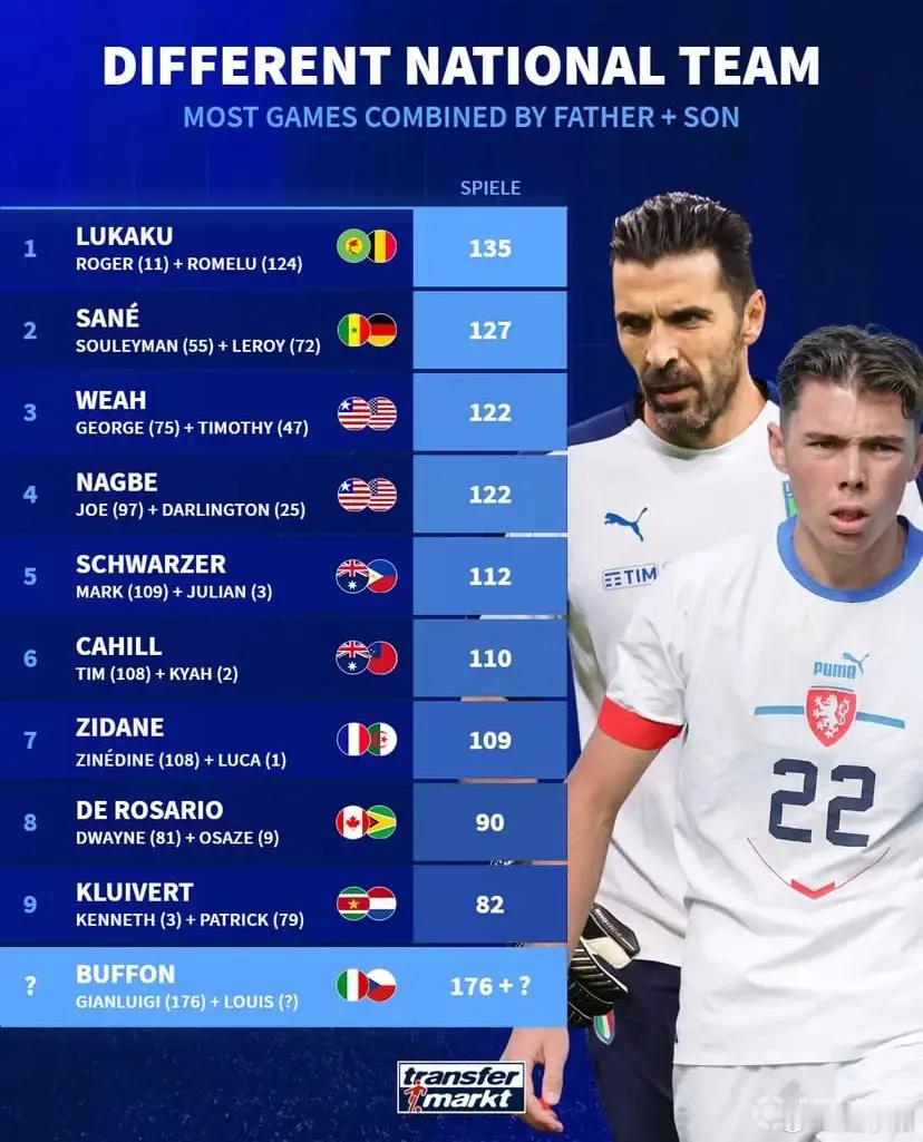 非洲杯阿尔及利亚队首战 3 比 0 零封苏丹队的比赛,法国球星齐达内的儿子卢卡-齐达内作为阿尔及利亚的首发门将出战(图二)。齐达内也来到现场为儿子助阵。(图一)齐达内的儿子并不是第一位没和父亲选择同一支国家队的球员。乔治-维阿代表利比里亚国家队出战 75场,他儿子蒂莫西-维阿已经代表美国国家队打了 47场比赛。曾经在世预赛里扑出邵佳一点球的马克-施瓦泽代表澳大利亚国家队出战 109场,他儿子朱利安-施瓦策尔代表菲律宾国家队 3 次出场。踢过中超的蒂姆-卡希尔代表澳大利亚国家队出战 108场,他儿子凯亚-卡希尔已经代表萨摩亚国家队有过 2场比赛经历。布冯代表意大利国家队出战 176场,他的儿子路易斯-布冯选择了捷克国家队。比利时国脚卢卡库父亲以前也是扎伊尔国脚, 德国国脚萨内的父亲之前也代表塞内加尔国家队踢了55 场比赛。齐达内的儿子曾代表法国队获得过 2015年U17欧洲杯冠军,为法国U16至U20各级青年队共出场31次。卢卡-齐达内目前效力于西乙联赛的格拉纳达队,今年 10 月阿尔及利亚主场对乌干达的非洲杯预选赛,是卢卡-齐达内代表阿尔及利亚国家队的首次登场,最终球队 2 比 1 获胜,本次非洲杯,也是他作为阿尔及利亚首发门将的第一次大赛。阿尔及利亚是这个小组最强的球队,小组最后一战,他们将面对阿苏埃所在的赤道几内亚。