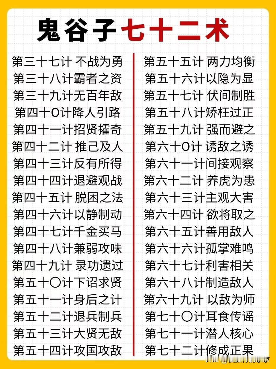 鬼谷子的七十二术 传说中,鬼谷子最精髓的72术,智慧谋略战的最高段位,仔细参考研究,顿悟后,将会改变你的人生命运... 果断收藏,文常必看👀,增长知识,增加智慧... 鬼谷子