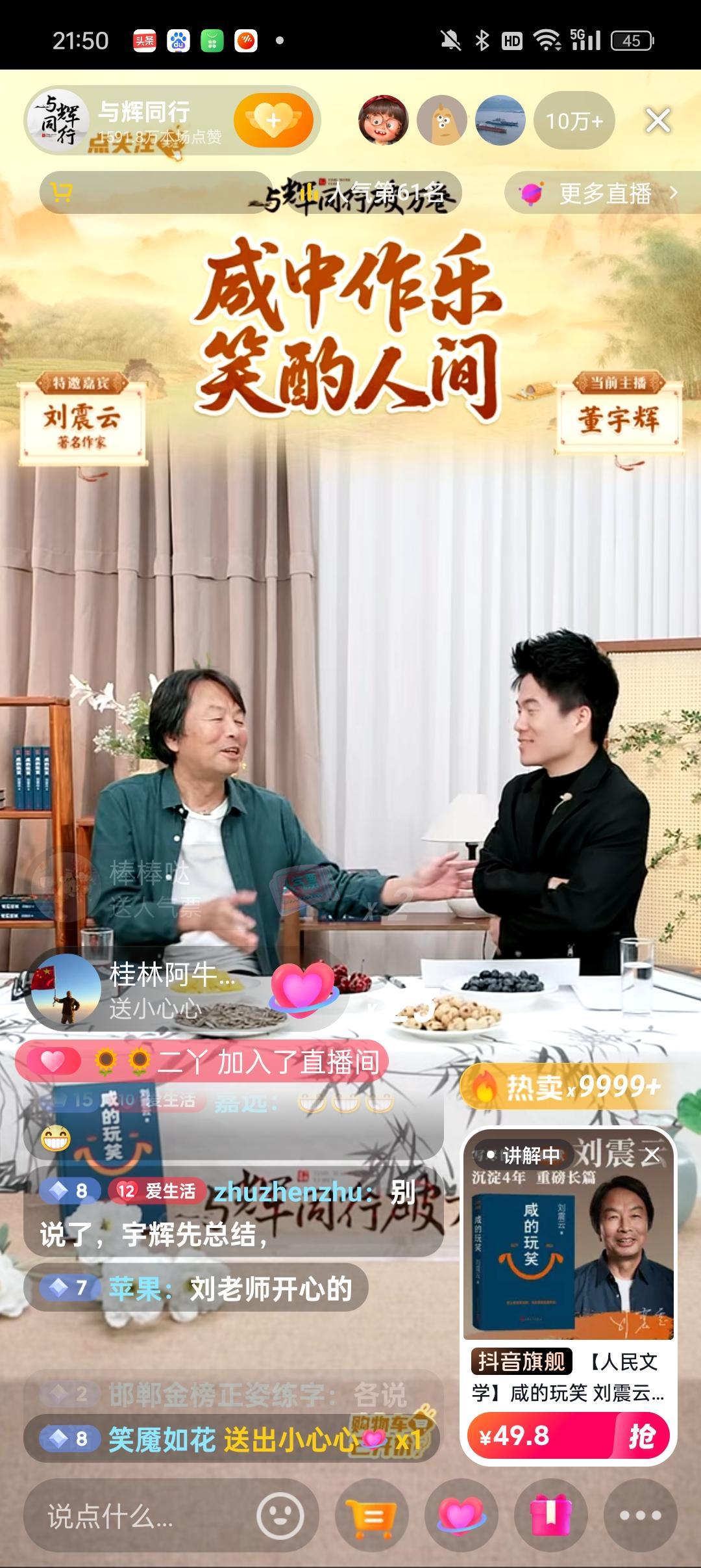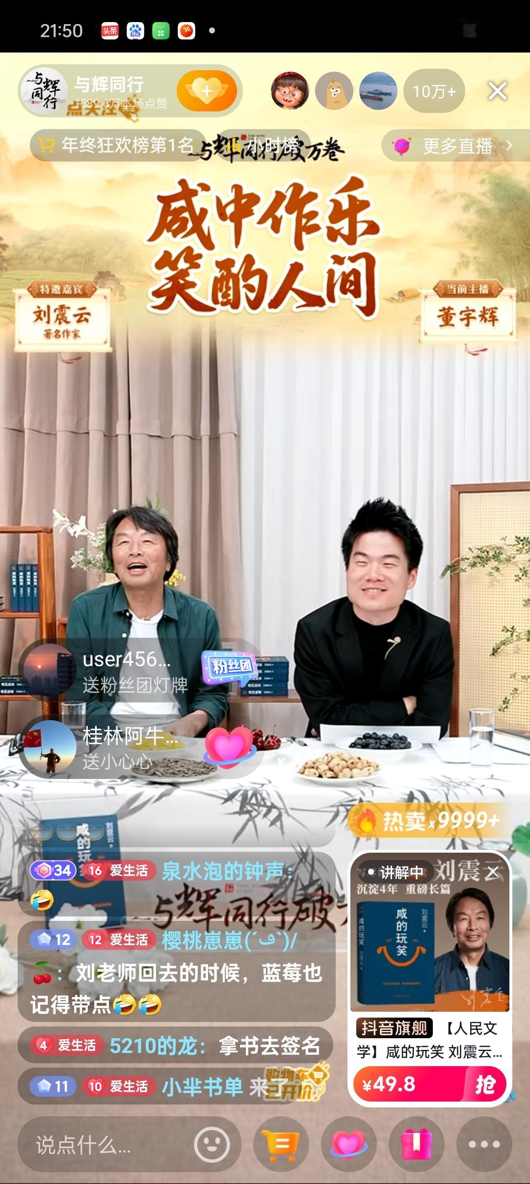 终于知道刘震云老师昨晚董宇辉访谈总结时为什么一直看评论区了,并不是刘震云老师想拖堂多卖几本书,而是在评论区寻找自己没有想到的一些反馈,为下一本书创作汲取灵感,连董宇辉都佩服刘震云老师集思广益,不仅在评论区集齐了20多万人的一顿饭局,一个访谈评论区又为下一本书打下了创作基础[捂脸] 看来刘震云老师特别喜欢在与辉同行的访谈气氛,开玩笑说因为大家都喜欢看与辉同行,所以以后要常来常往,弄得董宇辉都不好意思了,开玩笑说这段得给刘老师打钱啊[捂脸] 本以为余华老师跟董宇辉在一起已经够幽默了,没想到刘震云老师更幽默风趣,真心希望刘老师可以多来与辉同行直播间跟宇辉谈谈作品和生活[捂脸] 晒图笔记大赛