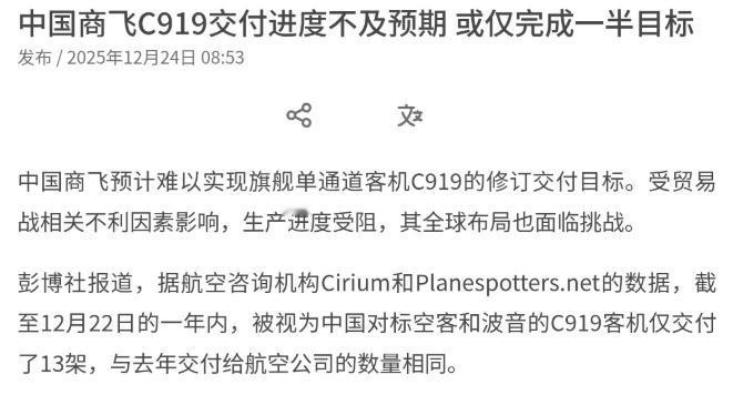 没想到对我们的影响这么大!美国这一出手还是很狠! 12月24日,根据外媒报道,外媒称,中国商飞预计难以实现旗舰单通道客机C919的修订交付目标。受贸易战相关不利因素影响,中国商飞生产进度受阻,而其全球布局也面临挑战。外媒表示,中国商飞今年早些时候已将年度交付目标从75架下调至25架,但即便大幅度下调目标,交付进度仍明显滞后。 C919交付进度跟不上预期,核心问题确实就出在零部件供应这块,尤其是发动机被美国攥着命脉,这贸易战的风浪一刮,咱们的大飞机生产直接就被绊了个大跟头。 美国这招掐脖子掐得又准又狠,直接瞄准了C919的核心动力部件LEAP-1C发动机,这款发动机看着是美法合资CFM公司生产的,但里面关键技术和零部件大多来自美国通用电气,说白了还是得看美国脸色。 2025年5月,美国商务部一声令下,直接暂停了这款发动机的对华出口许可,理由冠冕堂皇说是审查技术转让风险,实则就是冲着C919的量产进程来的,这一下相当于把C919的心脏供血给临时断了一下。 虽然到7月初美国又松了口恢复了许可,说是因为美企库存积压损失上亿美元闹着要说法,再加上咱们在稀土领域的反制施压,但这一个多月的断供风波,已经给C919的生产节奏造成了不可逆的影响。 当时商飞的发动机库存也就够组装十几架飞机,生产线这边刚把生产计划理顺,突然没了核心部件,只能紧急叫停部分生产线,把有限的库存零件集中起来优先组装少量飞机,原本雄心勃勃定下的75架年度交付目标,直接就被迫下调到了25架,这波被动调整足以看出咱们在核心部件上依赖美国的短板有多致命。 可能有人会说咱们搞国产替代不就行了,但是国产替代哪有那么容易。就说C919的国产发动机CJ-1000A,从2009年就启动研发,2017年才下线首台验证机,2023年才在运-20上进行飞行验证,直到2025年3月才进入适航取证阶段,整个研发过程用了十几年时间。 虽然这款国产发动机的推力、油耗等指标都不输LEAP-1C,甚至部分性能还有优势,比如推力达到111至125千牛,油耗比LEAP-1C低5%,氮氧化物排放降低30%,但要完成全部适航认证还需要时间,计划2027年才能批量装机,2030年才能实现商业运营,短期内根本解决不了当前的供应缺口。 而且现在西方不少国家在航空领域都跟着美国的节奏走,对中国的航空产业采取各种限制措施,比如欧洲航空安全局推迟适航认证,表面上是技术问题,实则就是想通过这种方式延缓C919进入国际市场的步伐。 EASA的适航证相当于进入全球80多个国家市场的通行证,这个认证一推迟,C919的全球布局就只能暂时搁浅,原本计划争取的欧洲廉航和亚洲部分航司的订单也只能暂时搁置。 而空客和波音则借着这个机会趁机抢占市场,2025年上半年空客A320neo就交付了450架,市场份额又提升了15%,反观C919只能在国内市场小步推进,这种外部环境的挤压也让商飞在生产和交付上承受了更大的压力。 毕竟如果国际市场打不开,产能爬坡的速度就会变慢,而产能上不去,零部件采购的成本就降不下来,反过来又会影响交付效率,形成一个恶性循环。 总的来看,C919交付进度滞后绝非偶然,核心就是美国在核心零部件尤其是发动机上的限制,直接戳中了咱们供应链的软肋。这种依赖带来的不仅是短期的交付缺口,更是长期的产业安全风险。 虽然咱们已经在加速推进国产替代,比如CJ-1000A发动机的研发取得了不错的进展,C919的国产率也在不断提升,但这些都需要时间积累,短期内还无法彻底摆脱对美国核心技术的依赖。美国正是看透了这一点,才敢在贸易战中拿C919下手,用供应链卡脖子的方式试图遏制中国航空工业的崛起。 这种手段确实够狠,也让我们深刻意识到,高端制造业的自主可控从来都不是一句空话,只有真正把核心技术握在自己手里,才能避免在关键时刻被人卡住喉咙。