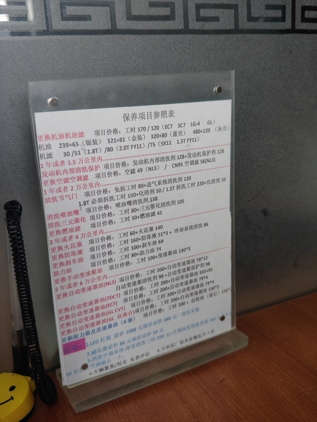 23冠军版二保 在吉利汽车APP预约了保养,提前半小时到都要排好长的队,车都快停满了,不过到我还是挺快的。一共花了463,其中包括机油325(金装壳牌全合成0W20),机滤30,工时费108(原价120,在吉利汽车APP预约打九折)。最后没倒完的机油我忘拿了😂还送了两瓶冬季玻璃水