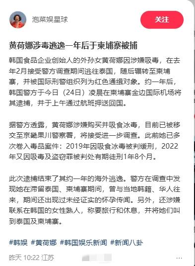 韩国财阀千金黄荷娜被逮捕,从海外留学吸毒开始她涉毒多年,最后成为诈骗巨头,李善均自杀与她有关。此前哪怕人证物证被甩在脸上,她也依旧能逍遥法外,这回终于被抓了! 她叫黄荷娜,是韩国的“财阀千金”,背后是韩国乳业巨头,是韩国南阳乳业公司创始人的外孙女,是韩国人人羡慕的“财阀富三代”。这个企业在韩国盘踞了多年,占据韩国绝大多数市场,凭借着如此强大的背景,也让黄荷娜在韩国能够肆无忌惮。 2009年,年仅21岁黄荷娜就被爆出购买毒品,并且因在美国聚众吸毒被强行遣返回国; 2011年,黄荷娜被曝出吸毒被抓,可韩国人等来等去,这件事竟然杳无音讯了; 2015年,一位吸食毒品的大学生举报,自己的毒品是从黄荷娜手中购买,人证物证俱齐,可依旧没抓到黄荷娜; 朴有天,和这位财阀千金也有过一段情史。后来朴有天被曝出性侵丑闻,有4名受害者出面作证,声称自己在卫生间遭到他的性侵,可突然之间四人全部撤诉,所谓的“性侵”最后成了自愿。朴有天性侵丑闻告一段落后,两人开始筹备结婚,可随后“李胜利夜店事件”被曝光。这回两人终于双双被捕,黄荷娜说毒品是朴有天强行给自己注射的,黄荷娜被宣布判处了1年有期徒刑,可实际上她就在监狱里被拘留了100多天。 经过“李胜利夜店事件”后,朴有天被抓没了音讯,黄荷娜却变得更加高调,在自己社交账号频繁晒自己的豪门生活,这引起了韩国网民的众怒。 2022年,黄荷娜再次因为在缓刑期间又吸毒被抓,终于伏法了一次,可就在此期间,又曝出韩国男演员李善均被查出曾和她一同聚众吸毒,事情曝光后,李善均给妻子留下一封“没办法,除此之外别无他法”的遗书,选择了自杀。 黄荷娜虽然被牵扯其中,可因为李善均的自杀,对于黄荷娜的调查又宣布终止,在十几年间,黄荷娜被查出多次涉毒,可最后她总是逍遥法外。朴有天黄荷娜涉毒事件 朴荷娜 韩国明星李敏荷